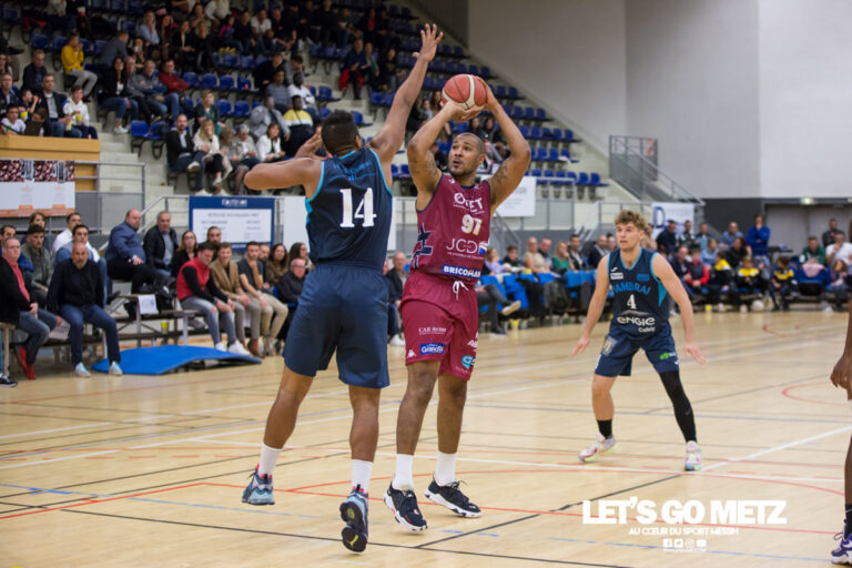 387 Dans le cadre de la 3e journée de Nationale 2, les Metz Canonniers se sont imposés difficilement face à la physique formation Cambrai. Victoire au bout du suspens (77-74). Le 5 majeur messin Bouvret – Kaly (c) – Karolak – Dardaine – Florimont Bouvret lançait les siens et servait Kaly pour ouvrir le compteur messin. Romain Dardaine faisait lever la salle avec un dunk rageur (4-0). Mais emmené par Garbin et Nicolas, Cambrai passait alors devant après 4 minutes de jeu. Antoine Pouille accentuait l’avance des siens (7-11). Dans un premier quart-temps disputé, Akono faisait vibrer la salle, en marquant 3 tirs à trois points consécutifs (19-17). Solides dans les derniers instants, les grenats faisaient la course en tête à l’aube du 2e quart. (22-20) Trop de déchet dans le jeu messin Le rythme s’accélérait et les paniers commençaient à rentrer. Akono continuait sa série. L’adversité était de taille. Pouille lui répondait. Metz laissait cependant revenir Cambrai (37-33), qui en profitait pour repasser devant (37-41). Les hommes de Tomba subissaient un pressing haut et perdaient beaucoup de ballons. Les deux équipes, proches dans le jeu, se quittaient sur un score de parité à la mi-temps (43-43). Florimont arrivait à se détacher dans son duel face à Nicolas. Le Guadeloupéen, précieux en ce début de saison, montait le ton avec 6 points en 2 minutes (53-50). Karolak et Bouvret accentuaient l’avance messine. Cambrai restait malgré tout dans la partie à la fin du troisième acte (63-54). Akono et Dardaine décisifs Les Nordistes ne voulaient pas abdiquer. A l’image de Garbin qui lançait une prière à 8 mètres. Cette dernière faisait mouche. Akono, l’homme de la soirée, redonnait de l’air aux siens et une avance de 6 points à 5 minutes du terme. S’en suit un mano à mano. A une minute du buzzer, Lyroid Alexis redonnait de l’espoir aux siens (74-72). Dardaine, d’un spin move rageur, pensait mettre les Canonniers à l’abri. Mais après un money time marqué par des fautes répétées et des lancers francs, Cambrai avait une possession de 3 secondes pour égaliser. Le capitaine Pouille, bien défendu dans le corner, voyait son tir heurter l’arceau. Les hommes d’Anthony Tomba pouvaient souffler et savourer une victoire durement acquise. Metz Canonniers 77-74 Cambrai Marqueurs Metz Canonniers : Akono 23, Bouvret 2, Karolak 4, Guérandel 4, Dardaine 11, Kaly (c) 6, Mbaye 6, Pourchot 2, Florimont 19Marqueurs Cambrai : Garbin 8, Montagne 0, Pouille (c) 15, Gueye 6, Salakio 3, Mpondo Ekoume 11, Alexis 9, Rondovic 2, Nicolas 20 Le classement de la Poule D de Nationale 2 Crédit photo : Matthieu Henkinet/LGM