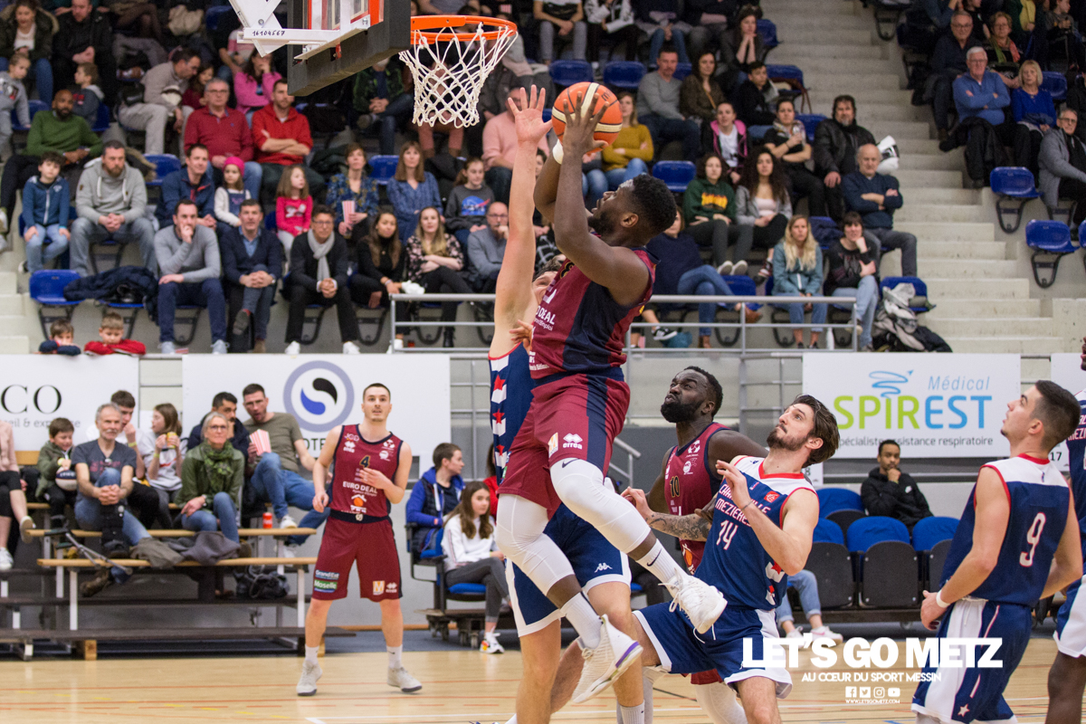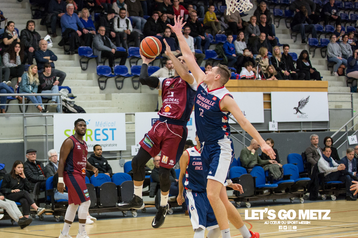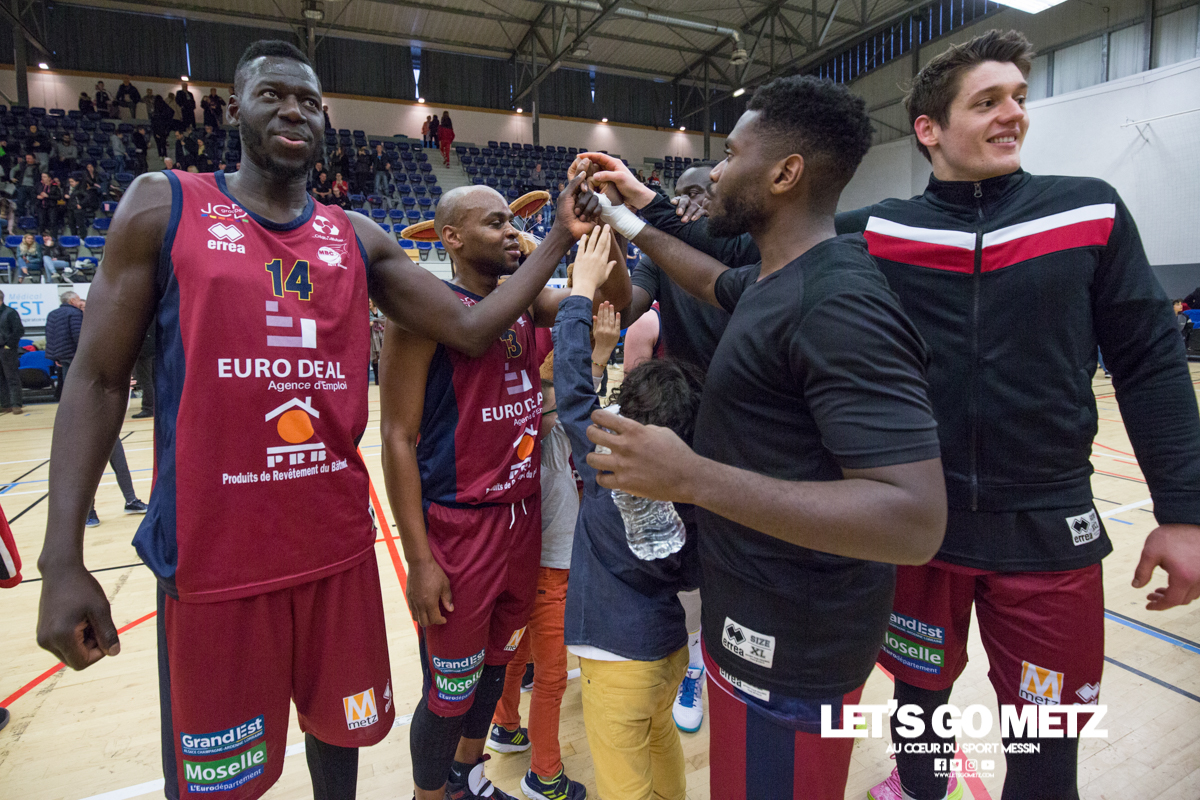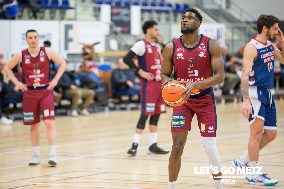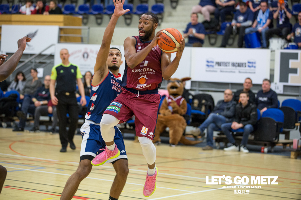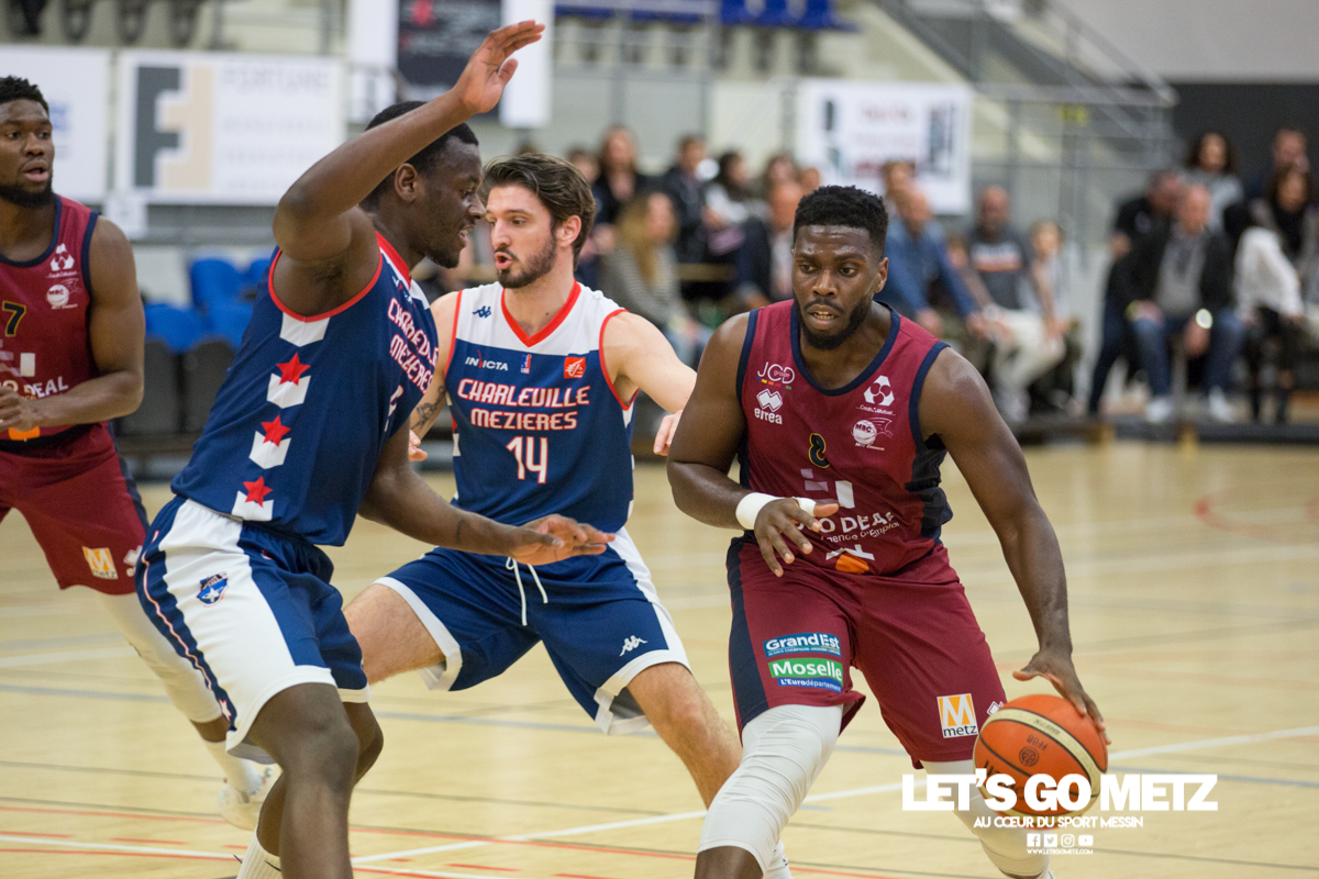 592 La victoire à tout prix, c’est ce qui caractérise la situation des Canonniers avant ce match. Aux prises avec une série négative depuis plusieurs semaines, les grenats sont animés ce dimanche d’une volonté de vaincre exacerbée. Certains d’entre eux ont eu le loisir d’observer l’écrasante victoire des Pink Ladies face à Arnaville, de quoi peut être leur donner quelques idées… Au delà des simples volontés, il y a également la capacité qui rentre en compte et aujourd’hui, les Messins ont mis toutes les chances de leur côté puisque l’effectif est au complet sur le parquet de Saint Symphorien, exit les blessures de Patrice M’Bianda, Etienne Ory, Matthew Lee, pour un retour en forme bien nécessaire. Du côté du coaching il y a eu du changement depuis le dernier match à domicile puisque Philippe Ory a pris du recul et laissé la place à son adjoint Stéphane Frentzel, mais l’état d’esprit reste bon puisque l’ancien entraîneur est présent en tribune.De leur côté, les joueurs de Charleville ne sont pas venus seuls aujourd’hui et on retrouve dans les gradins un contingent de supporters bien décidés à mettre la pression aux locaux à coup de tambours. La rencontre Le match commence sur les chapeaux de roue avec un tir primé d’Etienne Ory, dans la foulée un stop défensif permet à Matthew Lee de partir à la contre attaque et inscrire les deux premiers points de son retour de blessure. Avec un 5-0 d’entrée, les Canonniers prouvent que leurs intentions sont matérialisées. Les locaux gardent le pied sur accélérateur à l’aide d’une doublette à six lettres Lee / Ory efficace En attaque un premier bilan de 14 à 5 pousse l’entraîneur de Charleville à poser son temps mort.Globalement les Messins sont bien en place et David Sainsbury Garcia se montre déjà efficace sous le cercle. La « second unit » peut faire son entrée sereinement et garder le contrôle. Les visiteurs s’illustrent par beaucoup de fautes dans ce début de match, ce qui les prive d’un beau come-back. Le quart temps inaugural se termine sur le score de 25 à 19. Le deuxième quart temps s’avère bien plus accroché, les deux équipes sont à présent bien dans leur match et au gré des oppositions musclées, les rotations se font plus rapidement. Au scoring les deux formations se rendent les coups mais c’est finalement Michel Nsimba qui met le feu aux poudres avec un spin move en puissance qui envoie un joueur de l’Etoile au sol avant de conclure au cercle. 42 – 28 au tableau d’affichage et nouveau temps mort visiteur.En fin de quart temps, les Canonniers loupent quelques belles occasion de breaker en multipliant les pertes de balle. La mi temps prend fin à 42 – 32. Pour le troisième quart temps, les joueurs de l’Étoile reviennent avec de nouvelles intentions. On assiste à des échanges plus musclés et au bout que quelques minutes cela dégénère. David Sainsbury Garcia est victime d’une tentative d’interception digne d’un chiropracteur et décide de se faire justice en confrontant immédiatement son adversaire, ce qui n’est évidement jamais une bonne idée. Le pivot est impossible à calmer, ce qui pousse Stéphane Frentzel à réaliser un changement.Suite à ces échanges, les contacts restent rugueux mais un panier marqué en pénétration par Henok Affa vient une nouvelle fois relancer la dynamique des locaux. Et pour cause, le joueur profite de son temps fort pour inscrire deux paniers supplémentaires coup sur coup.Patrice M’Bianda est victime d’une grosse faute offensive non sifflée, ce qui ne l’empêche pas de prendre sa revanche sur l’action suivante avec deux points inscrits en fadeaway, un peu de finesse dans ce match parfois trop brut. 58 – 40 au tableau d’affichage et temps mort.Dans les minutes qui suivent les Messins sont à la peine et encaissent 5 points sans pouvoir répondre mais le retour de Sainsbury Garcia, l’esprit apaisé, vient remettre de l’énergie là où il en manque.Le troisième quart temps prend fin : 62 à 45 Le break a enfin eu lieu et les Canonniers abordent le dernier quart avec une certaine sérénité. L’équipe de Charleville ne peut pas en dire autant puisque trois joueurs se retrouvent très tôt en « foul trouble » et le jeu est de plus en plus décousu. Après un contact un peu trop appuyé, Matthew Lee se permet même de chambrer son vis à vis avant de tirer ses lancers francs en lui montrant le tableau d’affichage, concluant le tout par un clin d’œil. Grâce à l’avance conséquente de son équipe, Stéphane Frentzel peut expérimenter avec son effectif et donne du temps de jeu à Rabbi Gabriel Kosi Kidi. Malheureusement, ce dernier sort très rapidement, victime d’une blessure au pied. Un crève cœur.Malgré tout, les coéquipiers ne lâchent rien et terminent le match avec application pour l’emporter 77 à 56. Cette victoire remet les Canonniers sur des bases victorieuses et permet de reprendre des points à une équipe mieux classée. Il n’en fallait pas plus pour aborder la réception de Dijon (13ème) le week end prochain dans de bonnes conditions. La réaction de Michel Nsimba LGM : Vous avez rapidement pris les devants dans ce match mais il y a fallu batailler pour assurer la victoire. Quel est le premier ressenti sur la rencontre ?Michel Nsimba : C’est un bon match qu’on s’est appliqué à bien commencer aussi bien offensivement que défensivement. On a joué collectivement et ça nous a permis de vite faire un écart. Il fallait tenir le résultat, il nous fallait vraiment cette victoire donc on a bien appliqué les systèmes dans la continuité de ce qu’on avait préparé et ça a payé. Les Statistiques Crédit Photo : Matthieu Henkinet