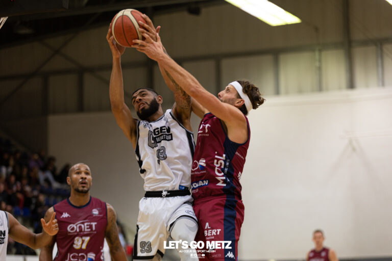 641 Quatrième victoire consécutive pour les Metz Canonniers. Portés par un grand Romain Dardaine, les hommes d’Anthony Tomba ont renversé une équipe de Gennevilliers accrocheuse, en s’imposant 76-67. Les Metz Canonniers présentaient un 5 de départ habituel face à Gennevilliers : Bouvret-Kaly(C)-Karolak-Dardaine-Florimont. Eric Terry fait douter les Canonniers Kevin Kaly lançait les hostilités avec un tir dans le corner à 3 points. Florimont enchainait proprement sur la ligne des lancers francs. Après une imposante défense des Canonniers, le capitaine Dorez sonnait la révolte avec un panier à 3 points (9-7). Les Metz Canonniers relançaient vite à l’aide du capitaine Kaly (11-7). Jusqu’à ce que Terry ne commence son show (13-13). Puis, les mosellans ont faibli dans l’engagement (13-15, 5’). Gennevilliers, qui en profitait pour creuser son avance. L’intérieur américain, Eric Terry, réalisait un récital avec 12 points dans le 1er quart (15-26, 10′). Les visiteurs poussaient même leur avance à 15 points. De quoi obliger Anthony Tomba à rappeler ses hommes sur le banc et prodiguer ses conseils. Les Metz Canonniers limitaient alors la casse en cette fin de 2ème quart-temps. Les Grenats rentraient aux vestiaires avec 12 unités de retard, au terme d’une première mi-temps à oublier (27-39, 20′). Le réveil des Metz Canonniers Florimont, gêné au dos, arrivait à prendre le dessus sur son vis à vis au retour des vestiaires. L’intérieur grenat fluidifiait le jeu des Canonniers, qui défendaient mieux. Les Mosellans continuaient à grignoter le retard (35-41 24’). Le coach du GEN faisait alors revenir Guadigni et Daurces, sur le parquet. Sans succès puisque Karolak faisait lever le public messin à la suite d’un tir à 3 points (40-43 26’). Le travail du secteur intérieur payait, les Canonniers étaient de retour à 4 minutes de la fin du 3e quart. Et voilà que les Metz Canonniers reprenaient les commandes avec un nouveau 3 points, signé du capitaine Kaly. Au terme d’un quart-temps remporté 27-7, les Canonniers se hissaient devant à dix minutes du terme (54-46, 30′) Romain Dardaine décisif Les Metz Canonniers, pourtant repassés devant, n’étaient pas à l’abri (56-55). Le moment choisi par Romain Dardaine pour marquer deux énormes stepbacks à 3 points. Mais parfois tendre au rebond défensif, Metz laissait Gennevilliers recoller, à un point, à 2min30 du terme (68-67, 38′). Mais hors de question pour Dardaine de laisser filer cette victoire. L’intérieur mosellan inscrivait un nouveau tir primé, imité quelques instant par le capitaine Kaly, qui donnait la victoire aux siens. Avec 7 points d’avance pour les Grenats à une minute de la fin, le sort du match était scellé.Les Metz Canonniers signaient finalement leur 4e victoire de la saison (76-67) face à une équipe de Gennevilliers accrocheuse. Les hommes d’Anthony Tomba devront hausser leur niveau de jeu samedi prochain sur le parquet de Joeuf, dans un derby lorrain toujours particulier. Metz Canonniers 76-67 Gennevilliers Metz Canonniers Akono 2 pointsBouvret 4 points, 2 passes, 5 rebondsDardaine 25 points, 2 passes, 7 rebondsFlorimont 19 points, 2 passes, 3 rebondsGuérandel 0 point, 3 rebonds, 2 contresGabango 2 points Kaly 13 points, 6 passes, 5 rebondsKarolak 11 points, 4 passes, 1 rebondMbaye 0 point, 1 rebond, 1 contre Gennevilliers Daurces 3 points, 1 passe, 8 rebondsDorez 5 points, 4 rebondsGuadagni 6 points, 1 passe, 1 rebondNdiaye 7 points, 3 rebondsSellin 2 points, 1 passe, 3 rebondsTerry 18 points, 2 passes, 6 rebondsVorkapic 11 points, 1 passe, 4 rebondsZogbo 7 points, 3 rebondsZora 8 points, 2 passes Le classement de la Poule D de Nationale 2. Crédit photos : Julien Buret (Let’s Go Metz)Statistiques : Gauthier Carboni