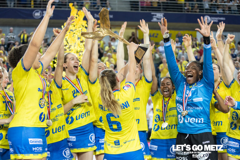 1,3K Metz Handball a remporté ce samedi un vingt-sixième titre de champion de France, après sa large victoire (36-22) face à Plan-de-Cuques. À une semaine du déplacement à Budapest, les Messines ont aussi engrangé un maximum de confiance avant le final four. Les calculs étaient simples : gagner pour remporter un nouveau titre. Et à ce petit jeu-là, c’est souvent Metz Handball qui gagne. Sans oublier pour autant les erreurs du passé, les cartes étaient entre les mains des dragonnes avant la rencontre. Signe de confiance – ou mauvais présage dirons certains -, le trophée décerné au champion de France était, lui aussi, aux Arènes et tendait les bras aux Messines. Pas de quoi les effrayer, à soixante minutes du bonheur, et d’un doublé. Metz a fait le travail Tout n’a pas été parfait durant le premier acte. À l’image des poteaux heurtés à deux reprises, les dragonnes ont manqué de précision dans le dernier geste par moment. Mais l’important était là : Metz rentrait au vestiaire avec un large avantage à la pause (15-8). Bien aidées par une Camille Depuiset des grands soirs (8e, 16e, 24e) et en confiance dans ses cages, les Messines pouvaient dérouler devant sans trop de soucis. Très efficace en contre (10e, 20e, 24e), Metz Handball creusait rapidement l’écart au tableau d’affichage. Dans des Arènes survoltées qui ne demandaient qu’à célébrer un nouveau titre après la victoire en finale de la Coupe de France il y a une semaine, tout le monde participait à la fête. Après une suspension de deux minutes contre Sarah Bouktit, Emmanuel Mayonnade faisait rentrer Mia Brkic au poste de pivot. Il n’hésitait pas non plus à poser un temps mort lorsque ses joueuses avaient un petit moment d’égarement (25e). Un premier acte presque tout en maîtrise. Score à la mi-temps : 15-8. Metz Handball est champion de France, et tout le monde a participé à la fête ! La deuxième mi-temps semble anecdotique tant les Arènes n’attendaient qu’une chose : le titre ! Mais le moins que l’on puisse dire, c’est que Metz Handball n’a pas perdu son sérieux pour autant. L’avance très large au tableau d’affichage n’a pas empêché Camille Depuiset de réaliser une nouvelle fois d’énormes arrêts (38e). Ni Chloé Valentini de combiner avec Sarah Bouktit pour marquer un but de grande classe (43e). En somme, cette seconde période a surtout été l’occasion pour certaines joueuses de faire leur dernière danse. Kristina Jorgensen, Julie Le Blévec ou encore Louise Vinter Burgaard profitaient une dernière fois des Arènes. Même Hatadou Sako, qui vivait aussi son ultime rencontre à Metz, inscrivait, tout en symbole, le dernier but du match ! Score final de ce Metz Handball – Plan-de-Cuques : 36 – 22.Revivez la rencontre sur notre direct. La galerie du match Les stats de la rencontre Metz HandballDepuiset (9 arrêts sur 24 tirs), Sako (3/10 et 1 but / 1 tir).Valentini (7 buts sur 10 tirs), Grijseels (3/4), Hansen (3/4), Jorgensen (4/7), Brkic (1/1), Vinter Burgaard (2/3), Mlamali (1/3), Jacques (0/4), Bouktit (7/9), Granier (2/3), Chambertin (3/6), Le Blevec (2/2). Plan-de-CuquesNovellan (5 arrêts sur 17 tirs), Kabeya (8/33).Goubel (2 buts sur 2 tirs), Gautschi (5/13), Bellonnet (1/4), Chavez Hernandez (1/1), Fauvarque (0/2), Kromoska (2/6), Kouaya (1/2), Vaxes (2/4), Kordovska (4/4), Martel (2/3), Grimaud (0/1), Elisme (2/3). Crédit photo : Matthieu Henkinet / Let’s Go Metz