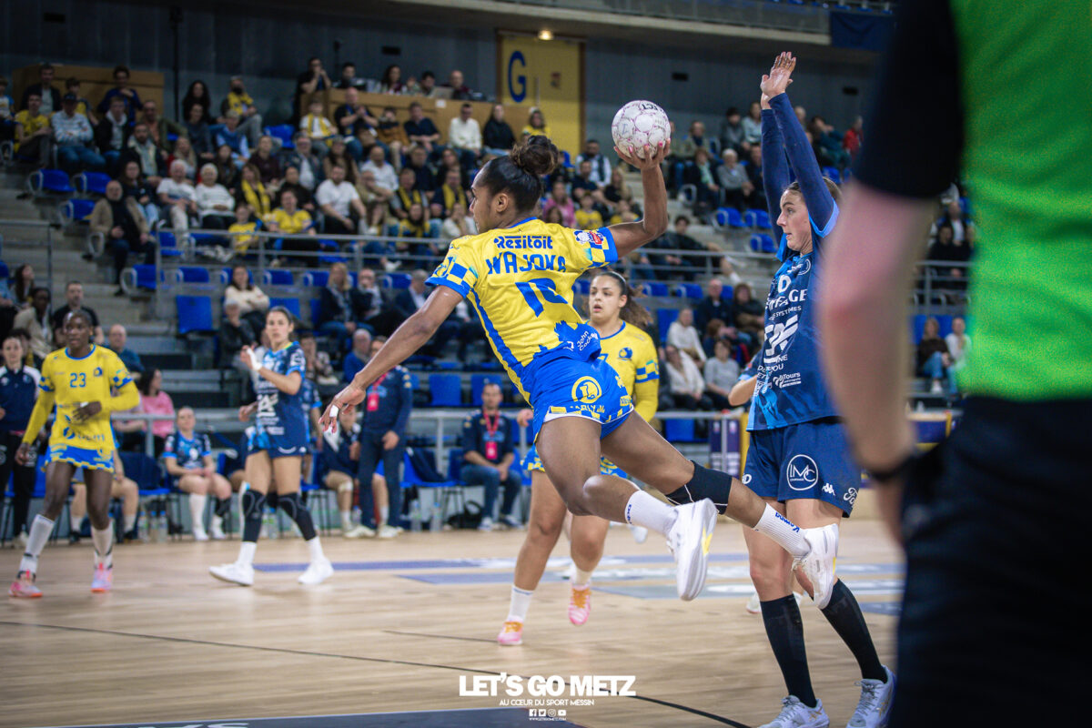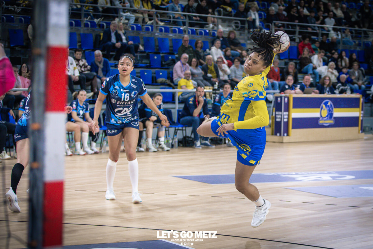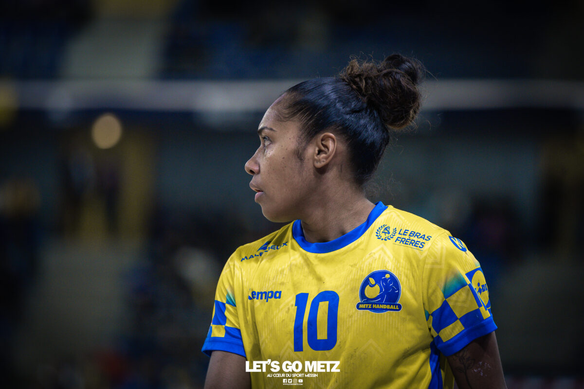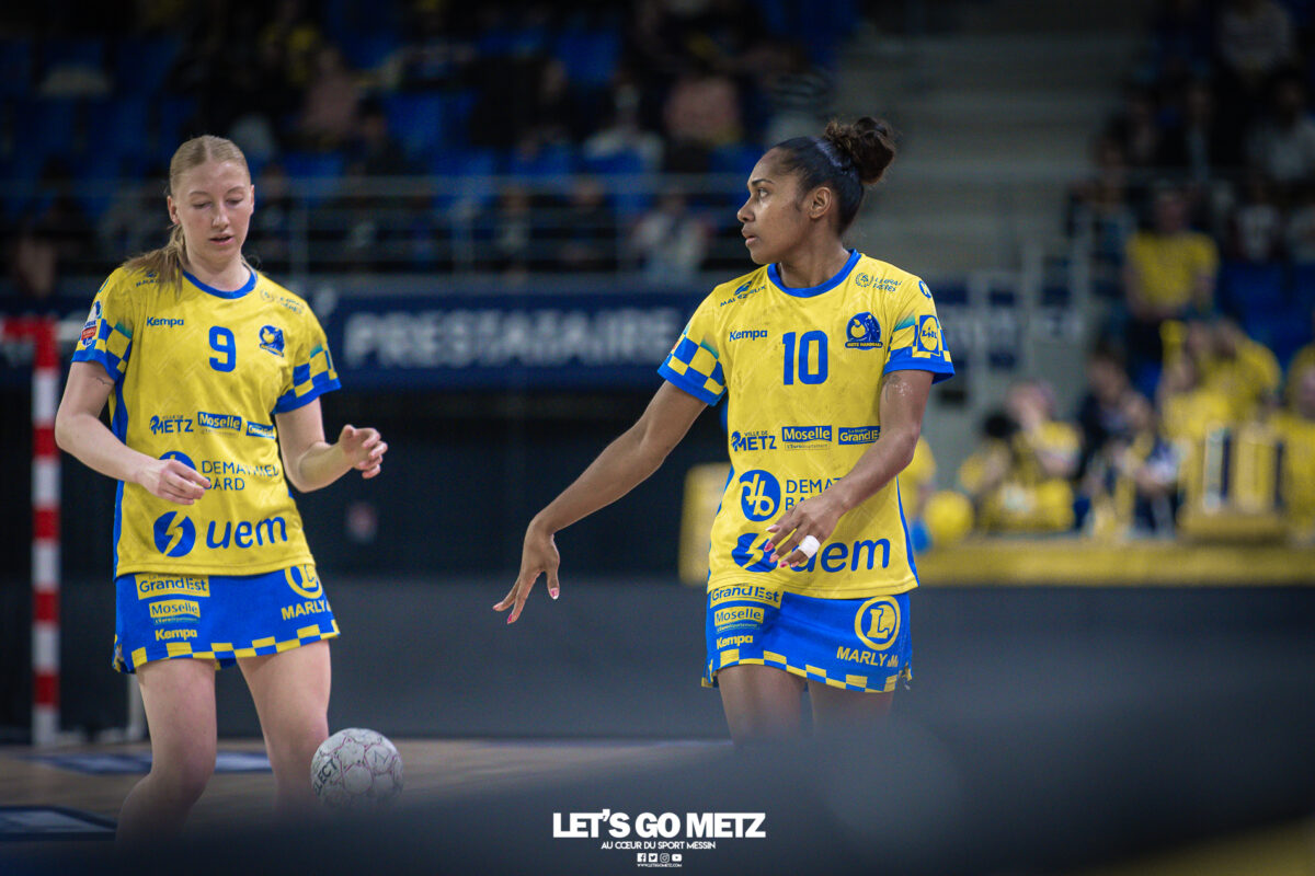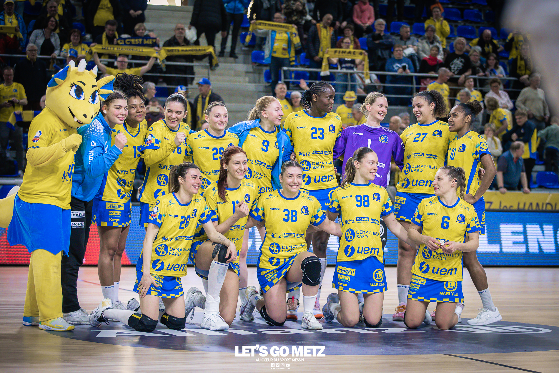 162 Après la trêve internationale, Metz Handball s’impose face à Chambray (30-26) et reste au contact de Brest en Ligue Butagaz Energie. Lors de leur dernier match aux Arènes, les Dragonnes avaient fait chavirer les spectateurs au terme d’un scénario haletant qui leur avait permis de se qualifier pour les demi-finales de la Coupe de France aux dépens de Brest. Ce dimanche, sous les yeux de leur nouvelle partenaire Grâce Zaadi, elles retrouvaient le championnat et Chambray, actuel troisième au classement. L’objectif de l’emporter afin de rester au contact de son rival breton est atteint puisque les filles d’Emmanuel Mayonnade se sont imposées face aux banlieusardes tourangelles. Mais l’écart de seulement quatre unités (30-26) et le déroulé de la rencontre n’a sans doute pas franchement convaincu le technicien girondin. Metz Handball peine à prendre un véritable ascendant Par expérience, le coach messin s’attendait à un match difficile comme il l’indiquait dans la presse locale. Une reprise après des rencontres internationales qui voient l’effectif jaune et bleu disséminé au sein de diverses sélections, qui plus est face à un adversaire ambitieux, n’est jamais simple à aborder. Cette dix-septième levée de championnat n’a pas dérogé à la règle. Chambray est longtemps parvenu à rester au contact des Dragonnes. Si d’ordinaire, les Lorraines parviennent à prendre un ascendant quasi définitif sur leurs adversaires après une grosse dizaine de minutes de jeu, cette fois elles ne comptaient que deux buts d’avance peu avant le quart d’heure de jeu (8-6, 13e). Il faut dire que les Chambraisiennes proposaient un jeu plaisant et efficace sous l’impulsion de la pivot Maëlle Faynel qui inscrivait ses quatre buts sur autant de tentatives au cours de cette période. Les Jaune et Bleu peinaient à faire fructifier leur avance à la suite de certaines imprécisions. Elles ne parvenaient à prendre quatre unités d’avance seulement à la 25e minutes (12-8, 25e). Le but de Sarah Bouktit faisait suite à six minutes de disette offensive de part et d’autre. A la pause, les locales menaient de trois buts (14-11, 30e) après une réalisation de Suzanne Wajoka qui effectuait ce dimanche son retour suite à sa blessure. Une seconde période dans la même lignée Si les Dragonnes n’étaient finalement jamais rejointes au score, le début du second acte voyait Chambray tromper la vigilance de Johanna Bundsen deux fois consécutivement par l’intermédiaire d’Aurélie Messi et Carin Stromberg (14-13: 33e). Mais, sous l’impulsion des arrêts de sa gardienne suédoise mais aussi de Petra Vamos et Sarah bouktit notamment, Metz Handball semblaient prendre définitivement la mesure de son adversaire (18-13, 38e). Toutefois, les filles de Camille Conte ne s’avouaient pas vaincues à l’image d’Ylana Richard (6 buts), Lucie Modenel et Mathilde Amelot (4 réalisations). Mais les rotations permettaient aux Messines de garder davantage de fraîcheur et de prendre quelque peu le large après une réalisation de Manon Errard et un nouveau but de Suzanne Wajoka (23-16, 43e). Johanna Bundsen se montrait une fois encore précieuses dans ses cages et faisait également parler sa vista en inscrivant un nouveau but à l’orée de dix dernières minutes (27-20, 51e). Ses seize parades lui valaient d’être logiquement élue joueuse d’un match que les Jaune et Bleu emportaient de quatre unités (30-26). Place maintenant au déplacement à Sambre Avesnois mercredi (19 h) avant une prochaine rencontre à domicile programmée le 1er avril face à l’OGC Nice. Crédit photos: Julien Buret / Let’s Go Metz Statistiques de la rencontre Metz HandballBundsen (16 parades sur 41 tirs et 1 but sur 1 tir), Novotná (0/1)Valentini (3/3, capitaine), Axnér (2/3), Wajoka (2/4), Albek (1/2), Augustine (1/2), Ngombele (3/6), Bouktit (7/11), Granier (2/2), Grandveau (1/1), Vámos (4/6), L. Borg (3/4), Errard (1/2). ChambrayDuijndam (3 parades sur 17 tirs), Perche (7/22)Mauny (2 but/5 tirs), Vama (1/2), Strömberg (4/5), Matthijs-Holmberg (1/3), Brazet, Modenel (3/5), Richard (6/13), Faynel (4/4), Stoiljkovic (0/4), Messi (1/2), Amelot (4/5), Grimaud.Exclusions : Messi (6e, 10e), Richard (7e), Brazet (19e), Matthijs-Holmberg (34e) Galerie photos du match