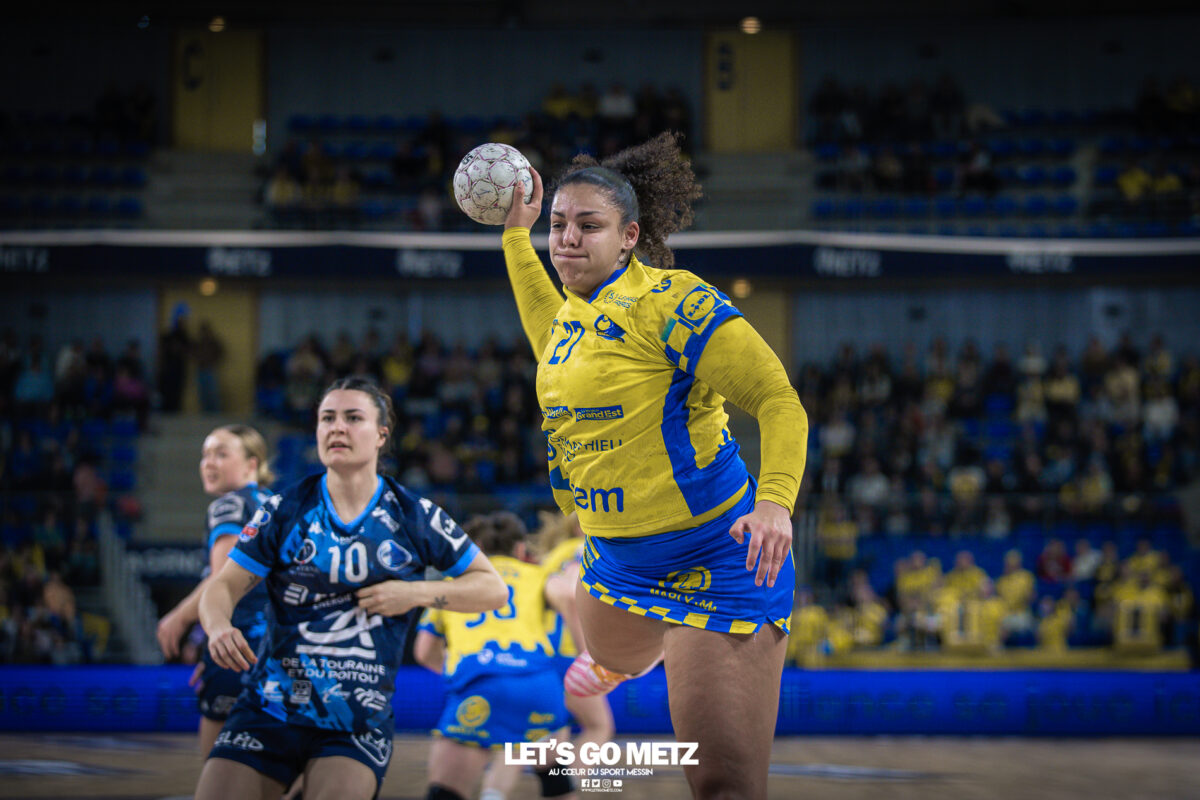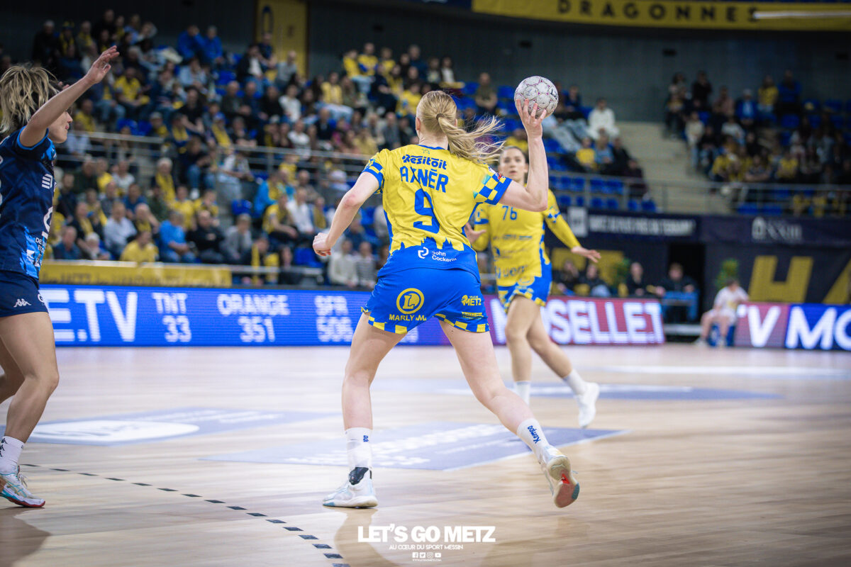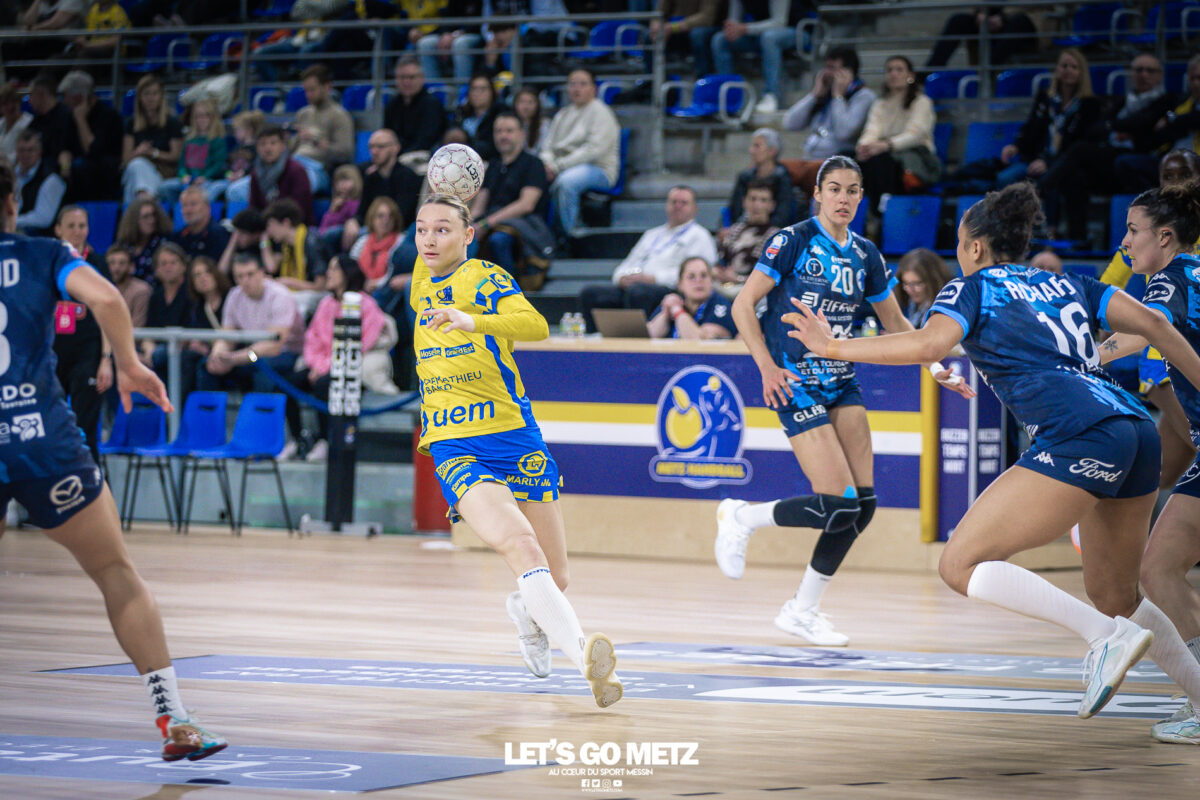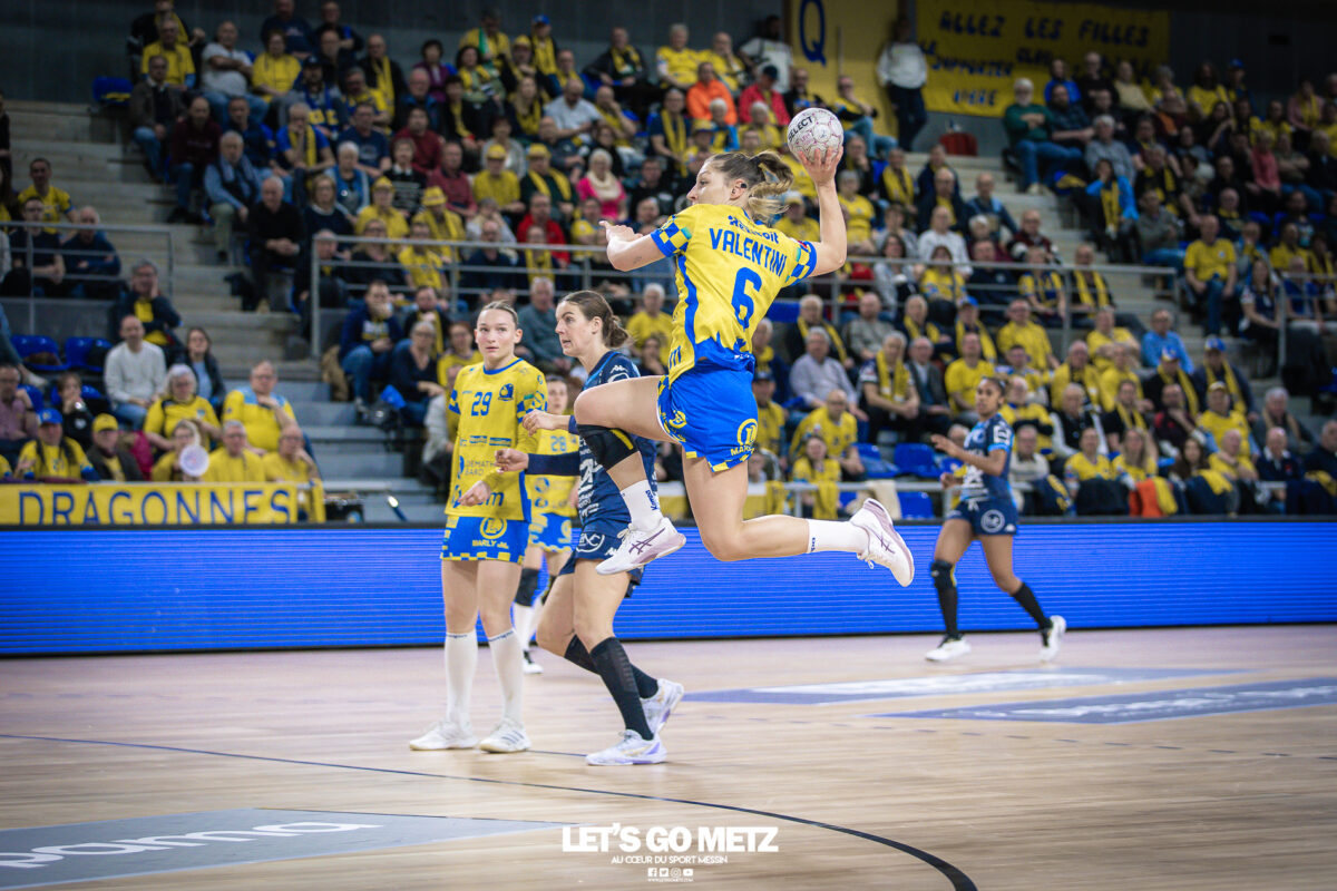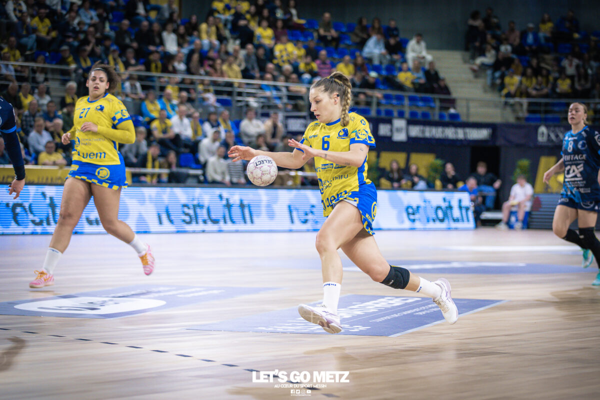 162 Après la trêve internationale, Metz Handball s’impose face à Chambray (30-26) et reste au contact de Brest en Ligue Butagaz Energie. Lors de leur dernier match aux Arènes, les Dragonnes avaient fait chavirer les spectateurs au terme d’un scénario haletant qui leur avait permis de se qualifier pour les demi-finales de la Coupe de France aux dépens de Brest. Ce dimanche, sous les yeux de leur nouvelle partenaire Grâce Zaadi, elles retrouvaient le championnat et Chambray, actuel troisième au classement. L’objectif de l’emporter afin de rester au contact de son rival breton est atteint puisque les filles d’Emmanuel Mayonnade se sont imposées face aux banlieusardes tourangelles. Mais l’écart de seulement quatre unités (30-26) et le déroulé de la rencontre n’a sans doute pas franchement convaincu le technicien girondin. Metz Handball peine à prendre un véritable ascendant Par expérience, le coach messin s’attendait à un match difficile comme il l’indiquait dans la presse locale. Une reprise après des rencontres internationales qui voient l’effectif jaune et bleu disséminé au sein de diverses sélections, qui plus est face à un adversaire ambitieux, n’est jamais simple à aborder. Cette dix-septième levée de championnat n’a pas dérogé à la règle. Chambray est longtemps parvenu à rester au contact des Dragonnes. Si d’ordinaire, les Lorraines parviennent à prendre un ascendant quasi définitif sur leurs adversaires après une grosse dizaine de minutes de jeu, cette fois elles ne comptaient que deux buts d’avance peu avant le quart d’heure de jeu (8-6, 13e). Il faut dire que les Chambraisiennes proposaient un jeu plaisant et efficace sous l’impulsion de la pivot Maëlle Faynel qui inscrivait ses quatre buts sur autant de tentatives au cours de cette période. Les Jaune et Bleu peinaient à faire fructifier leur avance à la suite de certaines imprécisions. Elles ne parvenaient à prendre quatre unités d’avance seulement à la 25e minutes (12-8, 25e). Le but de Sarah Bouktit faisait suite à six minutes de disette offensive de part et d’autre. A la pause, les locales menaient de trois buts (14-11, 30e) après une réalisation de Suzanne Wajoka qui effectuait ce dimanche son retour suite à sa blessure. Une seconde période dans la même lignée Si les Dragonnes n’étaient finalement jamais rejointes au score, le début du second acte voyait Chambray tromper la vigilance de Johanna Bundsen deux fois consécutivement par l’intermédiaire d’Aurélie Messi et Carin Stromberg (14-13: 33e). Mais, sous l’impulsion des arrêts de sa gardienne suédoise mais aussi de Petra Vamos et Sarah bouktit notamment, Metz Handball semblaient prendre définitivement la mesure de son adversaire (18-13, 38e). Toutefois, les filles de Camille Conte ne s’avouaient pas vaincues à l’image d’Ylana Richard (6 buts), Lucie Modenel et Mathilde Amelot (4 réalisations). Mais les rotations permettaient aux Messines de garder davantage de fraîcheur et de prendre quelque peu le large après une réalisation de Manon Errard et un nouveau but de Suzanne Wajoka (23-16, 43e). Johanna Bundsen se montrait une fois encore précieuses dans ses cages et faisait également parler sa vista en inscrivant un nouveau but à l’orée de dix dernières minutes (27-20, 51e). Ses seize parades lui valaient d’être logiquement élue joueuse d’un match que les Jaune et Bleu emportaient de quatre unités (30-26). Place maintenant au déplacement à Sambre Avesnois mercredi (19 h) avant une prochaine rencontre à domicile programmée le 1er avril face à l’OGC Nice. Crédit photos: Julien Buret / Let’s Go Metz Statistiques de la rencontre Metz HandballBundsen (16 parades sur 41 tirs et 1 but sur 1 tir), Novotná (0/1)Valentini (3/3, capitaine), Axnér (2/3), Wajoka (2/4), Albek (1/2), Augustine (1/2), Ngombele (3/6), Bouktit (7/11), Granier (2/2), Grandveau (1/1), Vámos (4/6), L. Borg (3/4), Errard (1/2). ChambrayDuijndam (3 parades sur 17 tirs), Perche (7/22)Mauny (2 but/5 tirs), Vama (1/2), Strömberg (4/5), Matthijs-Holmberg (1/3), Brazet, Modenel (3/5), Richard (6/13), Faynel (4/4), Stoiljkovic (0/4), Messi (1/2), Amelot (4/5), Grimaud.Exclusions : Messi (6e, 10e), Richard (7e), Brazet (19e), Matthijs-Holmberg (34e) Galerie photos du match