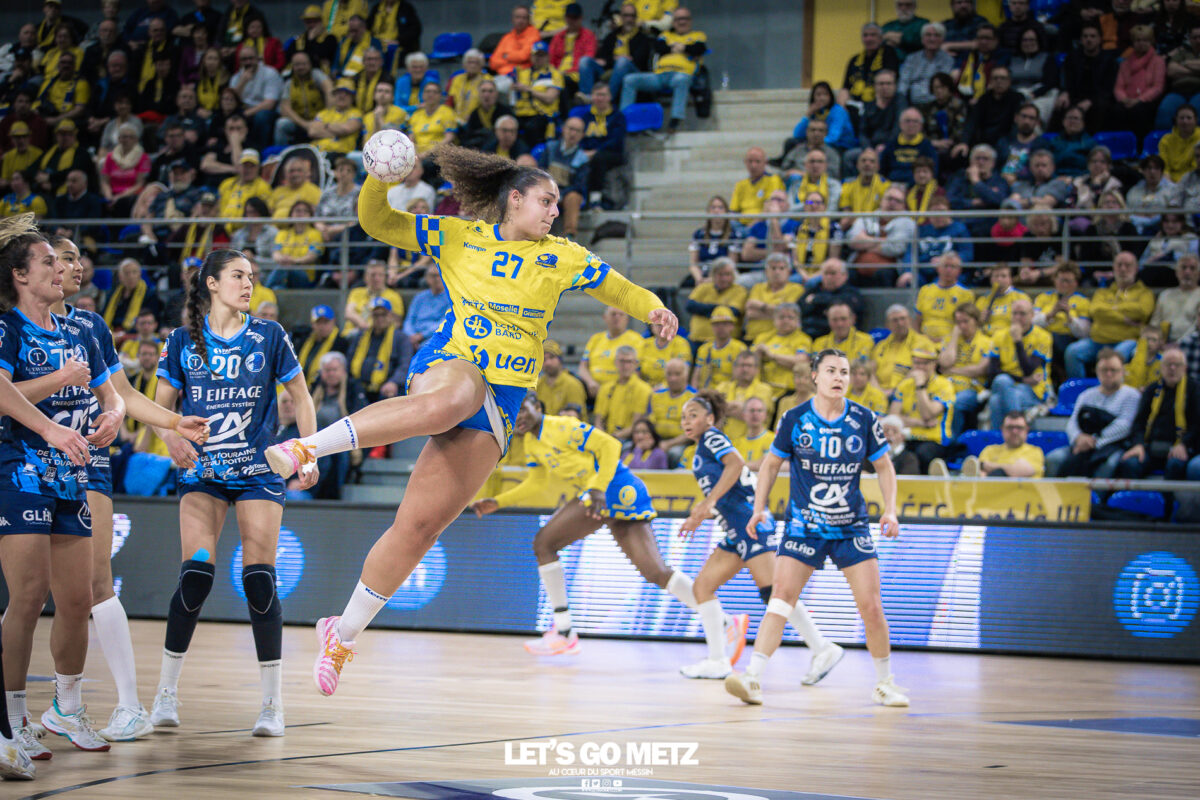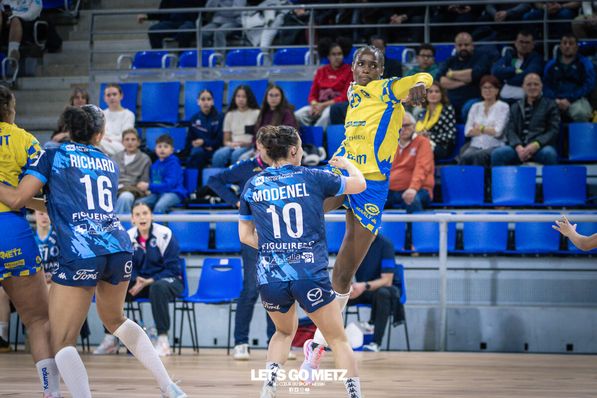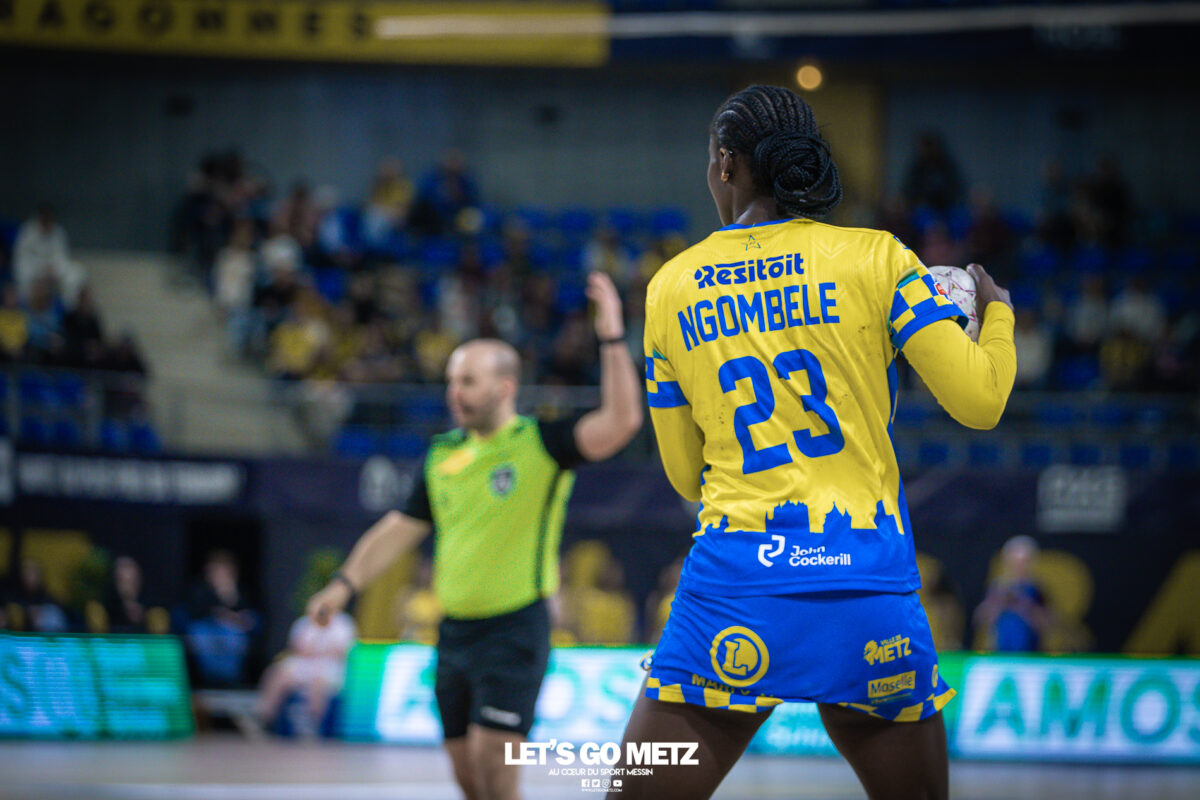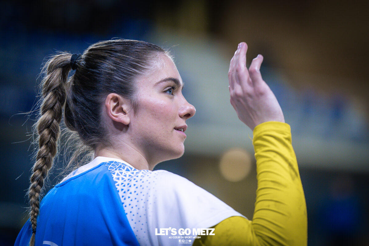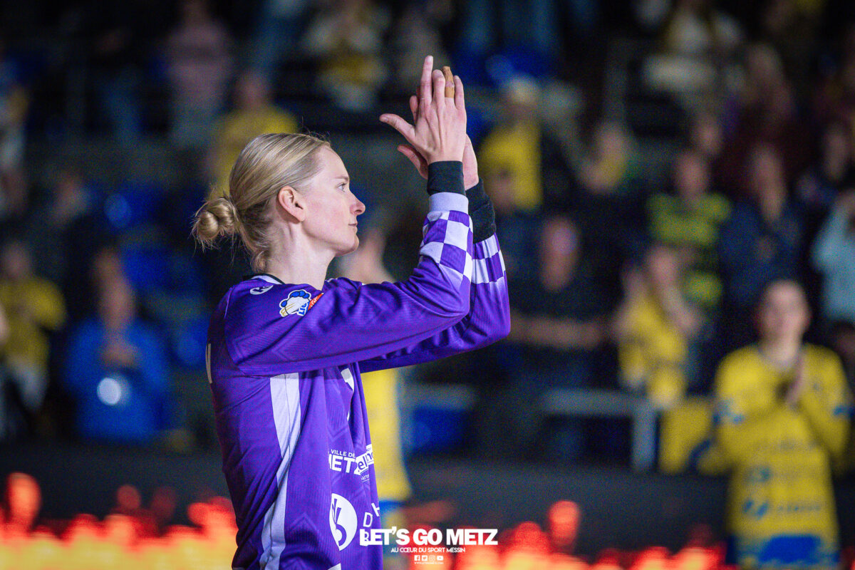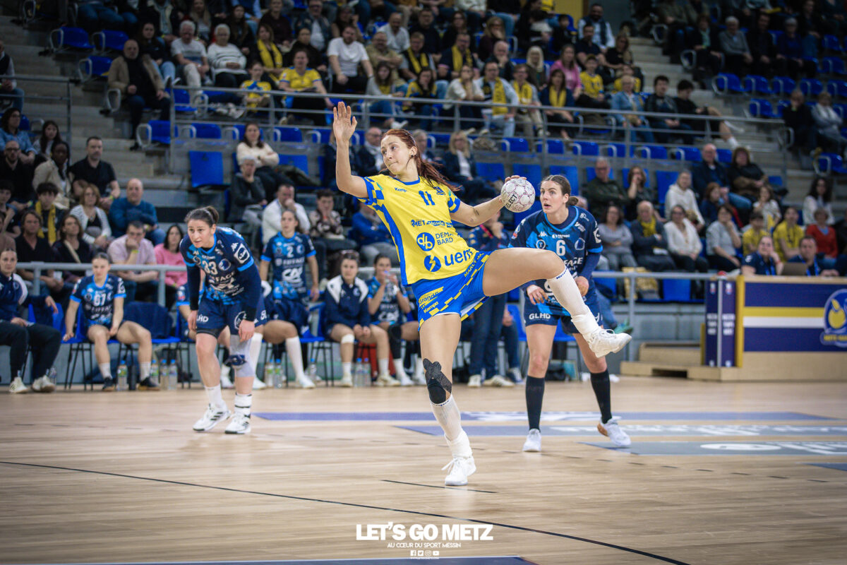 162 Après la trêve internationale, Metz Handball s’impose face à Chambray (30-26) et reste au contact de Brest en Ligue Butagaz Energie. Lors de leur dernier match aux Arènes, les Dragonnes avaient fait chavirer les spectateurs au terme d’un scénario haletant qui leur avait permis de se qualifier pour les demi-finales de la Coupe de France aux dépens de Brest. Ce dimanche, sous les yeux de leur nouvelle partenaire Grâce Zaadi, elles retrouvaient le championnat et Chambray, actuel troisième au classement. L’objectif de l’emporter afin de rester au contact de son rival breton est atteint puisque les filles d’Emmanuel Mayonnade se sont imposées face aux banlieusardes tourangelles. Mais l’écart de seulement quatre unités (30-26) et le déroulé de la rencontre n’a sans doute pas franchement convaincu le technicien girondin. Metz Handball peine à prendre un véritable ascendant Par expérience, le coach messin s’attendait à un match difficile comme il l’indiquait dans la presse locale. Une reprise après des rencontres internationales qui voient l’effectif jaune et bleu disséminé au sein de diverses sélections, qui plus est face à un adversaire ambitieux, n’est jamais simple à aborder. Cette dix-septième levée de championnat n’a pas dérogé à la règle. Chambray est longtemps parvenu à rester au contact des Dragonnes. Si d’ordinaire, les Lorraines parviennent à prendre un ascendant quasi définitif sur leurs adversaires après une grosse dizaine de minutes de jeu, cette fois elles ne comptaient que deux buts d’avance peu avant le quart d’heure de jeu (8-6, 13e). Il faut dire que les Chambraisiennes proposaient un jeu plaisant et efficace sous l’impulsion de la pivot Maëlle Faynel qui inscrivait ses quatre buts sur autant de tentatives au cours de cette période. Les Jaune et Bleu peinaient à faire fructifier leur avance à la suite de certaines imprécisions. Elles ne parvenaient à prendre quatre unités d’avance seulement à la 25e minutes (12-8, 25e). Le but de Sarah Bouktit faisait suite à six minutes de disette offensive de part et d’autre. A la pause, les locales menaient de trois buts (14-11, 30e) après une réalisation de Suzanne Wajoka qui effectuait ce dimanche son retour suite à sa blessure. Une seconde période dans la même lignée Si les Dragonnes n’étaient finalement jamais rejointes au score, le début du second acte voyait Chambray tromper la vigilance de Johanna Bundsen deux fois consécutivement par l’intermédiaire d’Aurélie Messi et Carin Stromberg (14-13: 33e). Mais, sous l’impulsion des arrêts de sa gardienne suédoise mais aussi de Petra Vamos et Sarah bouktit notamment, Metz Handball semblaient prendre définitivement la mesure de son adversaire (18-13, 38e). Toutefois, les filles de Camille Conte ne s’avouaient pas vaincues à l’image d’Ylana Richard (6 buts), Lucie Modenel et Mathilde Amelot (4 réalisations). Mais les rotations permettaient aux Messines de garder davantage de fraîcheur et de prendre quelque peu le large après une réalisation de Manon Errard et un nouveau but de Suzanne Wajoka (23-16, 43e). Johanna Bundsen se montrait une fois encore précieuses dans ses cages et faisait également parler sa vista en inscrivant un nouveau but à l’orée de dix dernières minutes (27-20, 51e). Ses seize parades lui valaient d’être logiquement élue joueuse d’un match que les Jaune et Bleu emportaient de quatre unités (30-26). Place maintenant au déplacement à Sambre Avesnois mercredi (19 h) avant une prochaine rencontre à domicile programmée le 1er avril face à l’OGC Nice. Crédit photos: Julien Buret / Let’s Go Metz Statistiques de la rencontre Metz HandballBundsen (16 parades sur 41 tirs et 1 but sur 1 tir), Novotná (0/1)Valentini (3/3, capitaine), Axnér (2/3), Wajoka (2/4), Albek (1/2), Augustine (1/2), Ngombele (3/6), Bouktit (7/11), Granier (2/2), Grandveau (1/1), Vámos (4/6), L. Borg (3/4), Errard (1/2). ChambrayDuijndam (3 parades sur 17 tirs), Perche (7/22)Mauny (2 but/5 tirs), Vama (1/2), Strömberg (4/5), Matthijs-Holmberg (1/3), Brazet, Modenel (3/5), Richard (6/13), Faynel (4/4), Stoiljkovic (0/4), Messi (1/2), Amelot (4/5), Grimaud.Exclusions : Messi (6e, 10e), Richard (7e), Brazet (19e), Matthijs-Holmberg (34e) Galerie photos du match