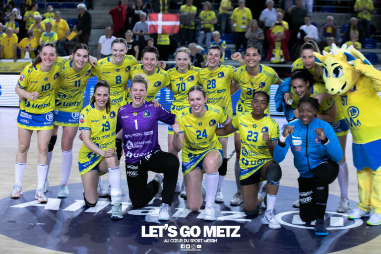 2,1K Metz Handball s’est imposé face à l’Entente Sportive Besançon Féminine (28-22), ce mercredi 15 mai. Les Dragonnes récupèrent par la même occasion le fauteuil de leader en Ligue Butagaz Énergie, à deux journées de la fin du championnat. À moins de 72 heures du coup d’envoi de la finale de Coupe de France qui opposera Metz Handball à Dijon, les Dragonnes recevaient Besançon dans leur antre des Arènes. Une rencontre capitale pour les Mosellanes dans la course au titre, car avec cette victoire, les joueuses d’Emmanuel Mayonnade récupèrent la place de leader occupée jusqu’ici par Brest. Camille Depuiset dans une forme étincelante Le début de la rencontre partait sur les chapeaux de roue puisque qu’il ne fallait que quelques petites secondes à Sarah Bouktit pour ouvrir le score au profit du Metz Handball (1-0, 1′). Mais il en fallait plus pour impressionner pour l’ESBF, et Mariot égalisait dans la foulée (1-1, 2′). Commençait alors le show Depuiset, la gardienne des Dragonnes ayant été plus que décisive dans ce premier acte. Portées par ces exploits les Messines en profitaient donc pour se détacher au tableau d’affichage grâce des réalisations de Bouktit, Chambertin, Jorgensen, Garnier et enfin Valentini (6-2, 6′). Malgré la supériorité technique des Dragonnes, Besançon ne lâchait rien et se procurait de nombreuses occasions. Mais sur une erreur de l’arrière-garde bisontine, Djazz Chambertin partait seule au but et offrait six buts d’avance aux Mosellanes (11-5, 16′). Besançon reprenait une dose d’espoir grâce à Louise Cusset et revenait à seulement quatre longueurs de Metz (14-10, 23′). Peu avant la pause, Emma Jacques puis Chloé Valentini confortaient l’avantage des Messines (19-12, 30′). Score à la pause : 19-12 Des Bisontines déterminées Au retour des vestiaires, l’ESBF démarrait fort. Clarisse Mariot inscrivait deux buts coup sur coup pour permettre à son équipe de revenir à cinq buts de leur adversaire (19-14, 32′). Malgré la seconde réalisation de Lucie Garnier (20-14, 35′), les Doubistes marquaient à trois reprises pour recoller à seulement à trois petits buts des Dragonnes (20-17, 38′). Voyant les visiteuses revenir dangereusement au score, les joueuses d’Emmanuel Mayonnade augmentaient l’intensité de jeu. En six minutes, les Messines creusaient l’écart avec Besançon, et prenaient neuf buts d’avance (28-19, 51′). À quelques minutes du coup de siflet final, Melina Peillon et Malin Sandberg réduisaient la marque pour l’ESBF (28-22, 59′). Score final : 28-22 Avec cette victoire, Metz Handball reprend la tête du championnat, à égalité de points avec Brest (2e). Se déplaçant à Paris 92 le 22 mai et recevant Plan-de-Cuques pour le dernier match de la saison, les Dragonnes ont désormais leur destin entre leurs mains pour obtenir un vingt-sixième titre de championnes de France ! La galerie photo de la rencontre Les statistiques de la rencontre Metz HandballSako (0 parade sur 1 tir), Depuiset (10/31).Grijseels (3 buts sur 5 tirs), Valentini (7/7) Hansen (0/1), Jorgensen (5/8), Burgaard (0/2), Mlamali (0/1), Jacques (2/8), Bouktit (6/6), Granier (2/3), Chambertin (3/7), Le Blevec (0/1).Entente Sportive Besançon FéminineLerstad (8 parades sur 30 tirs), Fuernkranz (2/7).Peillon (3 buts sur 3 tirs), Wajoka (2/3), Frecon-Demouge (1/1), Mairot C. (6/9), Cusset (4/4), Tshimanga (1/2), Mairot J. (1/5), Zazai (0/3), Sandberg (2/5), Kingue (2/4), Sidicina (0/3). Crédit photo : Valentin Lachaux / Let’s Go Metz