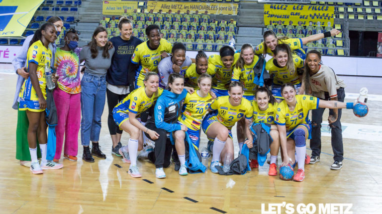 463 Metz s’est relancé avec une victoire en déplacement face au Paris 92 mercredi dernier, synonyme de qualification pour une finale de playoffs face au Brest Bretagne Handball dans quelques semaines. Seulement l’essentiel reste la mise en place d’une nouvelle dynamique et cela passait par la réussite du match face à Chambray, à domicile. Qualifiées pour la finale, mais pas rassasiées pour autant, les Dragonnes retrouvaient ce Dimanche leurs Arènes pour y recevoir l’équipe de Chambray Touraine Handball dans le cadre d’un nouveau match de playoffs de Ligue Butagaz Énergie. Une opposition face à des Conquérantes qui n’ont pas usurpé leur surnom et ont su déstabiliser plusieurs équipes de haut calibre au cours de la saison à l’image d’un match particulièrement accroché face à Brest quelques jours plus tôt. Pour cette rencontre Emmanuel Mayonnade alignait une équipe particulièrement remaniée. Marie-Hélène Sajka affaiblie à un genou laissait donc sa place à Emma Jacques tandis que Julie Le Blevec était préférée pour l’occasion à Ailly Luciano. Audrey Dembele disputait quand à elle son troisième match avec les Dragonnes, suite à la blessure d’Orlane Kanor. Côté Chambraisien, Jérôme Delarue composait avec une équipe minée par les blessures, notamment celles de Jovana Stoiljkovic, Léa Heuré ou encore Sophia Fehri. A noter dans l’effectif la présence de Julie Sias qui réalise sa première saison à Chambray après être passée par Mérignac et surtout par le centre de formation Messin. Contrairement à leur première mi temps Parisienne quatre jours plus tôt, les Dragonnes débutaient le match par un bras de fer face aux Chambraisiennes. Une Manon Houette particulièrement tonique se procurait rapidement plusieurs face à face avec Andrea Novellan tandis que les adversaires du jour répondaient par l’intermédiaire de Jannella Blonbou et Ana Paula Rodrigues. Cette dernière, demi centre redoutable, prenait rapidement ses responsabilités en distillant plusieurs bons ballons et surtout en provoquant la première suspension pour deux minutes de la partie, face à Olga Perederiy. Malgré cela les Messines parvenaient à garder le cap avec des attaques rapides permettant d’exploiter au mieux les intervalles. A la dixième minute de jeu les équipes étaient toujours au coude à coude mais l’expulsion temporaire de Djeneba Toure venait contrecarrer le bon début de match des visiteuses et offrir sur un plateau une série de trois buts sans réponse durant l’infériorité numérique (10-7, 13′). Une avance entretenue et même aggravée pendant un temps par les Dragonnes, bien aidées par une Tjasa Stanko des grands soirs qui montait déjà son ratio face au but à 5/6 alors que les siennes prenaient 5 buts d’avance (14-9, 22′). Une avance suffisante pour permettre à Emmanuel Mayonnade de faire rentrer Emma Jacques et Julie Le Blevec, un choix judicieux, permettant aux deux protagonistes de s’intégrer à la partie tandis que l’écart restait inchangé jusqu’à la mi-temps malgré les tentatives de relance de Rogrigues, Nina Brkljacic, Estelle Memana ou encore Cloe Roelandt. Fin de la première mi temps : 18 – 13 Au retour de la pause, les Chambraisiennes se présentaient avec des intentions renouvelées mais concédaient rapidement un jet de 7 mètres, transformé par Tjasa Stanko. Maintenues à flot par deux buts consécutifs de Julie Sias, les visiteuses s’accrochaient au score sans pour autant réussir à résorber l’écart. Szimonetta Planéta se présentait alors comme alternative dans le jeu offensif, proposant un véritable pendant à Camila Micijevic de par sa taille et son bras puissant, mais la Hongroise formée à Györ peinait à trouver le cadre, donnant le loisir à Louise Burgaard et Méline Nocandy de reprendre leur travail de sape (25-18, 40′). Entrée en jeu, la jeune Audrey Dembele se montrait énergique en défense sous les conseils avisés d’Astride N’Gouan tandis que les Chambraisiennes, usées par le combat proposé et par les infériorités numériques laissaient l’écart se creuser à nouveau. Méline Nocandy, bien décidée à ne faire aucun cadeau menait la charge avec un tir très longue distance en l’absence de Linda Pradel (29-23, 52′). Alors que la fin de partie était marquée par les fautes et un rythme irrégulier, Julie Le Blevec se démarquait particulièrement avec trois buts en deux minutes, scellant le match sur une avance de dix unités. Fin du match : 35 – 25 Bien que se montrant capable d’un combat de qualité, l’effectif du Chambray Touraine Handball n’a pas tenu la charge sur la durée de la rencontre et pourra regretter les diverses erreurs défensives qui ont permis aux Dragonnes de réaliser la plupart de leurs breaks durant la partie en supériorité numérique. De leur côté les joueuses de Metz Handball réalisent un match plein à la force du collectif, avec l’appui de leurs plus jeunes membres et s’adjugent une deuxième victoire consécutive en quatre jours, confirmant ainsi leur retour en grâce après une série de match compliqués.Qualifiée pour la finale des playoffs face à Brest et toujours en lice pour la première place du classement, l’équipe d’Emmanuel Mayonnade cherchera à poursuivre sa nouvelle dynamique face à une redoutable équipe Nantaise dès Mercredi à 18h avant de se déplacer à Besançon Dimanche à 15h. Statistiques Metz HandballHatadou Sako (13 arrêts sur 31 tirs), Dinah Eckerle (0/7)Emma Jacques (2 buts / 5 tirs), Camila Micijevic (2/6), Astride N’Gouan (0/2) , Meline Nocandy (6/8) , Manon Houette (5/6) , Debbie Bont (2/3) , Tjasa Stanko (7/8) , Louise Burgaard (5/5) , Laura Kanor (2/2) , Julie Le Blevec (4/5) , Audrey Dembele (0/2) , Olga Perederiy (0/1) Chambray Touraine Handball Andre Novellan (2 arrêts sur 17 tirs), Linda Pradel (10/29)Caroline Valente (3 buts sur 3 tirs), Ana Paula Rodrigu