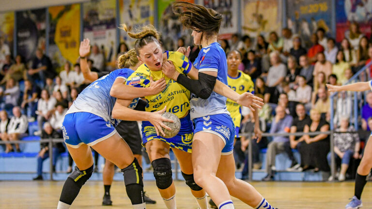 4,1K Les jeunes Dragonnes de Metz Handball retrouvaient la compétition en N1F ce samedi avec un match face à Yutz. Les saisons se suivent et ne se ressemblent pas forcément. L’équipe de Nationale 1 Féminine (N1F) de Metz Handball débutait sa saison par un derby face à Yutz. Invaincues tout au long de la saison 2024/2025, jusqu’à la finale de la compétition, les protégées de Nina Kanto viennent de découvrir une réalité tout à fait différente en débutant par une défaite. Il aurait fallu un véritable miracle pour que le résultat soit différent compte tenu des conditions. En cumulant départs de cadres à l’intersaison (Fatima Camara, Claire Koestner…), joueuses indisponibles car retenues avec les Dragonnes (Yvana Atangana, Blandine Gros) et un effectif général extrêmement jeune et pas tout à fait rôdé, Metz Handball se présentait à Yutz loin de sa stature habituelle de favori. Pourtant c’est bel et bien aux visiteuses que le début de rencontre profitait. Fiona Gooroosamy ouvrait la marque sur jet de sept mètres, suivie par Elea Ferdilus et Nelya Goval pour valider un 0-4 en cinq minutes. Il ne fallait guère plus de temps à Yutz pour recoller (4-4, 10ème). Metz continuait cependant de faire la course en tête, comptant jusqu’à six buts d’avance via une réalisation de Maily Etilopy (9-14, 23ème). La fin de mi-temps voyait Alice Giliberto récolter une suspension de deux minutes, au retour du vestiaire Helea Thevenot en faisait de même et les deux femmes étaient rejointes par Fiona Gooroosamy quelques minutes plus tard, mais cette succession d’infériorités numériques n’entamait pas l’avance messine (16-20, 38ème). C’est en définitive une disette d’une dizaine de minutes qui renversait la situation. Presque incapables d’aboutir à des situations de tir concrètes et encore moins de les concrétiser, les jeunes Dragonnes voyaient leur avance fondre et Yutz prenait une avance au tableau d’affichage pour la première fois de la partie (25-24, 54ème). Après un temps mort des locales, Ludyvine Kaakil-Talaba récoltait à son tour une suspension de deux minutes. Yutz en profitait pour valider un +2 à quelques minutes de la fin des débats mais une parade de Manuella Navarro et un but d’Elea Ferdilus semblaient redonner de l’élan aux jaune et bleu. Au bout du suspens c’est dans la main d’Helea Thevenot que le ballon du match nul reposait mais la gardienne yussoise Ghada Zarrai scellait la victoire des siennes.Score final de ce Yutz Handball – Metz Handball : 26-25 En manque de parades de gardienne, en manque de constance offensive, en manque de profondeur de banc, Metz Handball a tout de même failli s’imposer lors de cette première journée. À la lumière des enseignements récoltés, les jeunes Dragonnes tenteront de se reprendre à l’occasion de la deuxième journée de compétition, le dimanche 14 septembre à 16h à domicile face à Palaiseau. La galerie du match Les stats de la rencontre Metz HandballCinku (5 parades), Antunes Navarro (1 parade)Ababsa (1 but sur 3 tirs), Etilopy (5/9), Ferdilus (7/7), Giliberto (0/1), Gooroosamy (5/8), Goval (4/5), Holler (1/2), Kaakil-Talaba (1/3), Nguon (0/1), Thevenot (1/2). Yutz HandballZarrai (9 parades)Atmani (1 but sur 2 tirs), Barthelemy (2/5), Bingelmann-Nielsen (4/8), Birck (1/1), Carton-Caniez, Chevieux (2/2), Decet (7/13), Fadily, Masson (3/5), Salvucci, Talaat Abdel Razzak Mohamed Eoudy (5/6), Thome (1/2), Valette. Crédit photo : Mikael Frank / Let’s Go Metz
