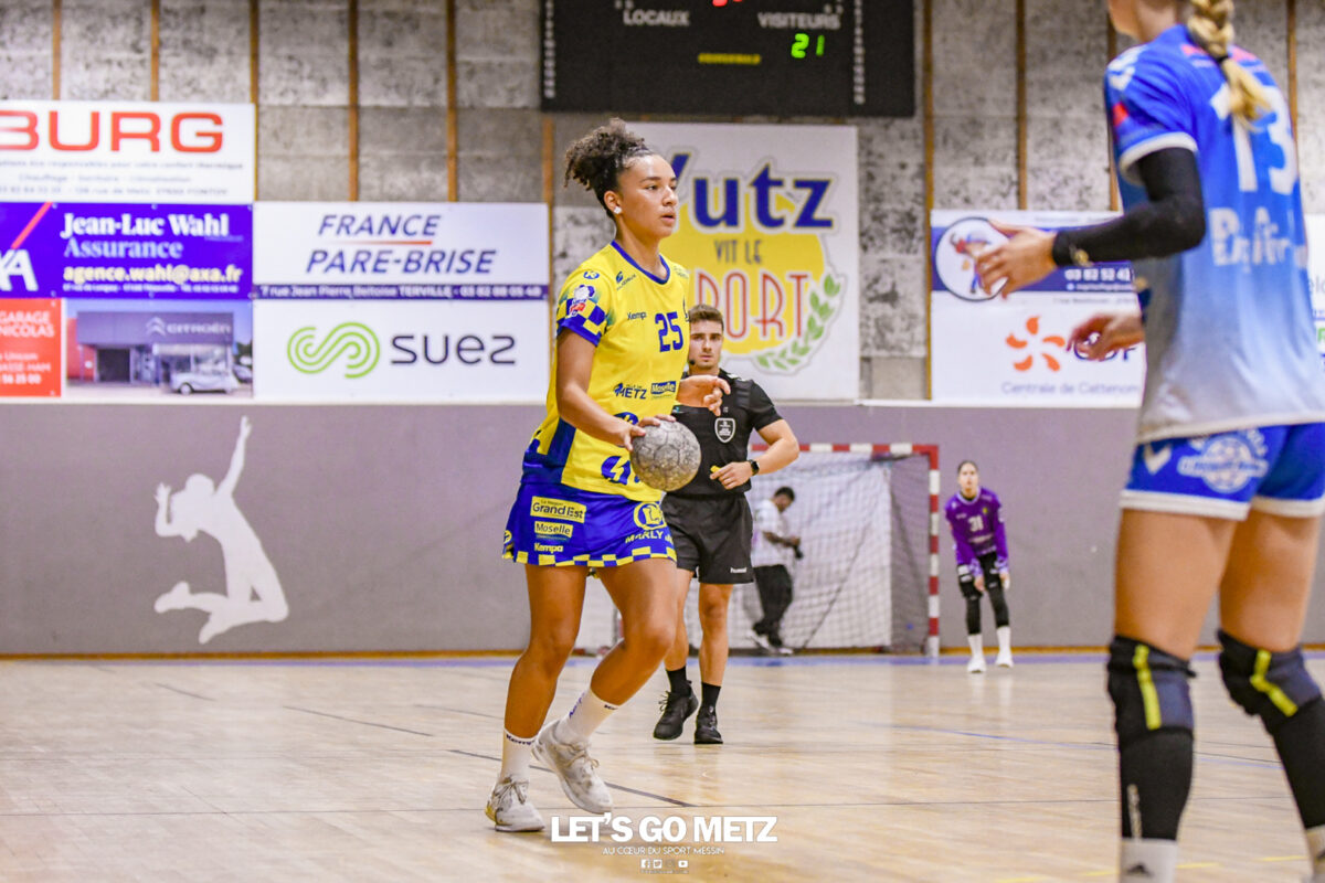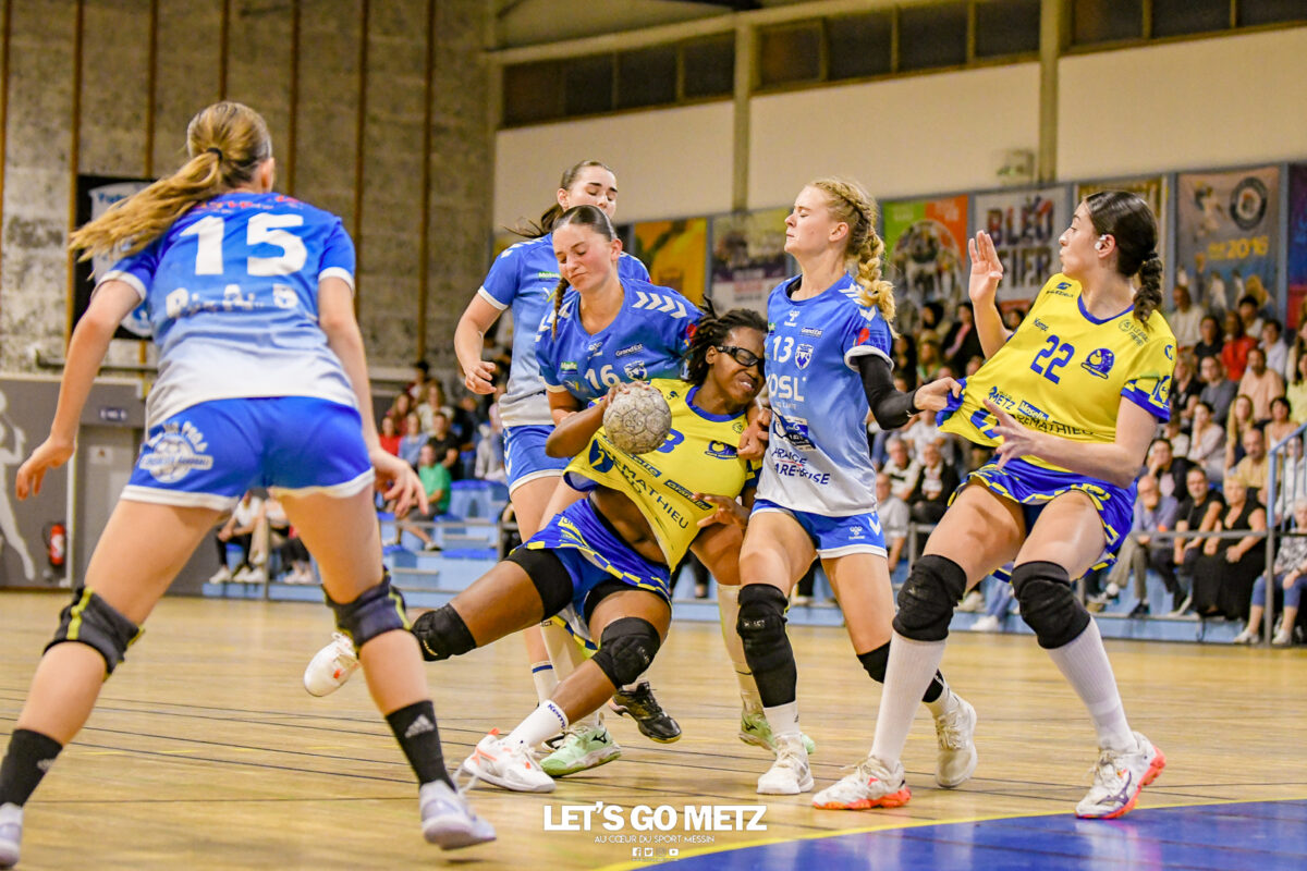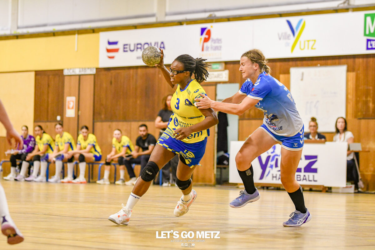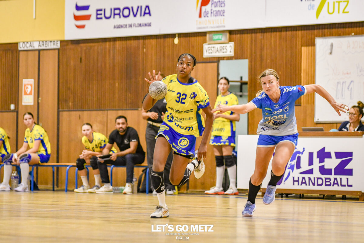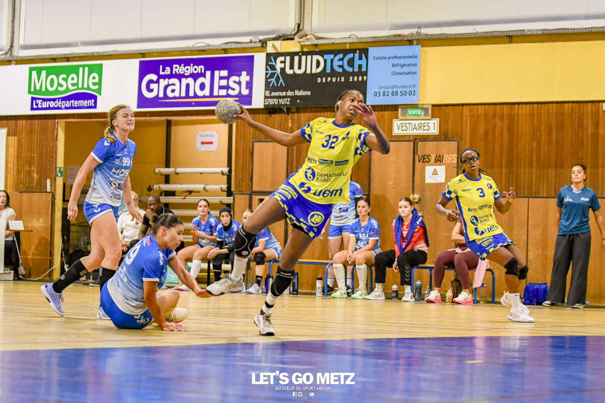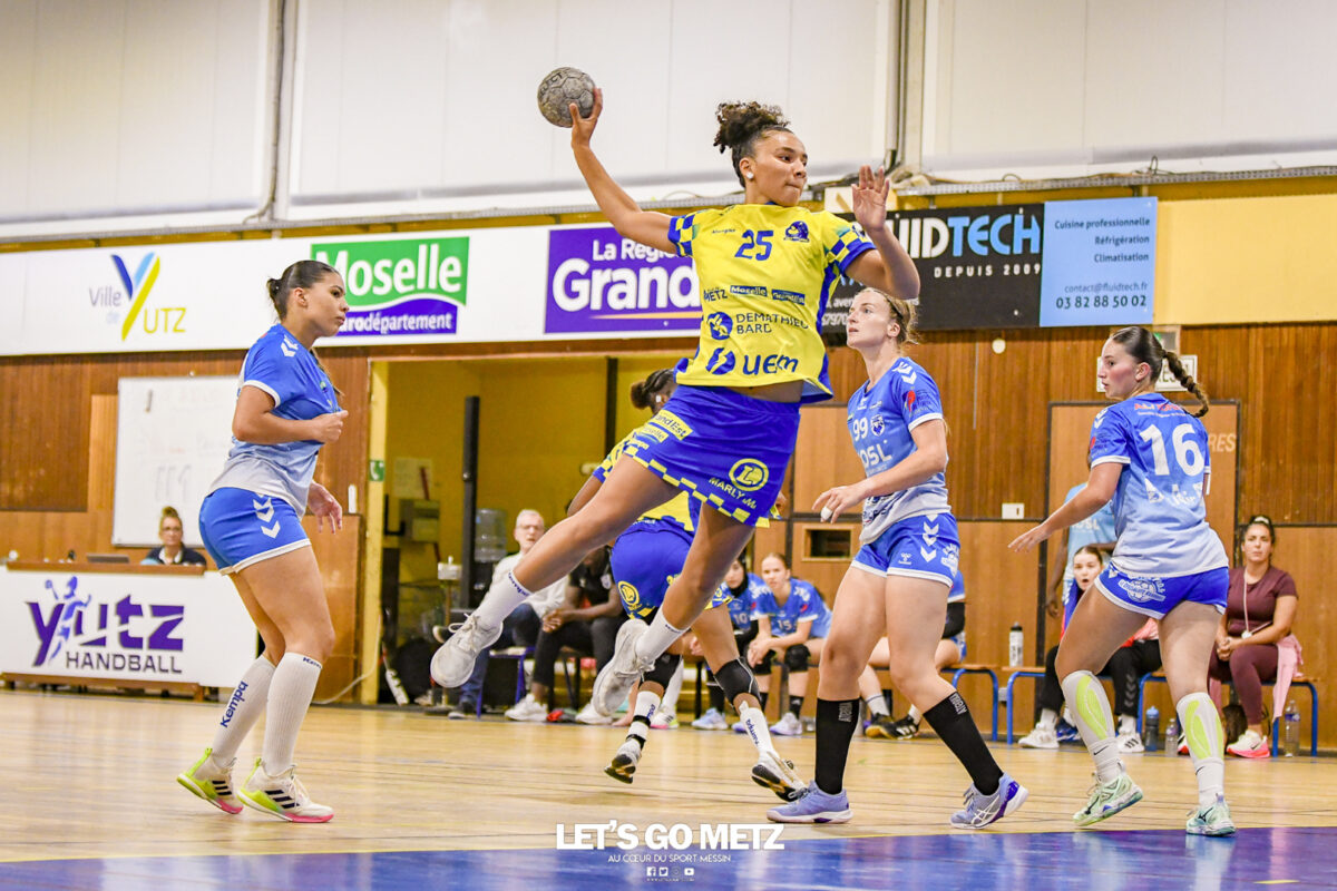 3,9K Les jeunes Dragonnes de Metz Handball retrouvaient la compétition en N1F ce samedi avec un match face à Yutz. Les saisons se suivent et ne se ressemblent pas forcément. L’équipe de Nationale 1 Féminine (N1F) de Metz Handball débutait sa saison par un derby face à Yutz. Invaincues tout au long de la saison 2024/2025, jusqu’à la finale de la compétition, les protégées de Nina Kanto viennent de découvrir une réalité tout à fait différente en débutant par une défaite. Il aurait fallu un véritable miracle pour que le résultat soit différent compte tenu des conditions. En cumulant départs de cadres à l’intersaison (Fatima Camara, Claire Koestner…), joueuses indisponibles car retenues avec les Dragonnes (Yvana Atangana, Blandine Gros) et un effectif général extrêmement jeune et pas tout à fait rôdé, Metz Handball se présentait à Yutz loin de sa stature habituelle de favori. Pourtant c’est bel et bien aux visiteuses que le début de rencontre profitait. Fiona Gooroosamy ouvrait la marque sur jet de sept mètres, suivie par Elea Ferdilus et Nelya Goval pour valider un 0-4 en cinq minutes. Il ne fallait guère plus de temps à Yutz pour recoller (4-4, 10ème). Metz continuait cependant de faire la course en tête, comptant jusqu’à six buts d’avance via une réalisation de Maily Etilopy (9-14, 23ème). La fin de mi-temps voyait Alice Giliberto récolter une suspension de deux minutes, au retour du vestiaire Helea Thevenot en faisait de même et les deux femmes étaient rejointes par Fiona Gooroosamy quelques minutes plus tard, mais cette succession d’infériorités numériques n’entamait pas l’avance messine (16-20, 38ème). C’est en définitive une disette d’une dizaine de minutes qui renversait la situation. Presque incapables d’aboutir à des situations de tir concrètes et encore moins de les concrétiser, les jeunes Dragonnes voyaient leur avance fondre et Yutz prenait une avance au tableau d’affichage pour la première fois de la partie (25-24, 54ème). Après un temps mort des locales, Ludyvine Kaakil-Talaba récoltait à son tour une suspension de deux minutes. Yutz en profitait pour valider un +2 à quelques minutes de la fin des débats mais une parade de Manuella Navarro et un but d’Elea Ferdilus semblaient redonner de l’élan aux jaune et bleu. Au bout du suspens c’est dans la main d’Helea Thevenot que le ballon du match nul reposait mais la gardienne yussoise Ghada Zarrai scellait la victoire des siennes.Score final de ce Yutz Handball – Metz Handball : 26-25 En manque de parades de gardienne, en manque de constance offensive, en manque de profondeur de banc, Metz Handball a tout de même failli s’imposer lors de cette première journée. À la lumière des enseignements récoltés, les jeunes Dragonnes tenteront de se reprendre à l’occasion de la deuxième journée de compétition, le dimanche 14 septembre à 16h à domicile face à Palaiseau. La galerie du match Les stats de la rencontre Metz HandballCinku (5 parades), Antunes Navarro (1 parade)Ababsa (1 but sur 3 tirs), Etilopy (5/9), Ferdilus (7/7), Giliberto (0/1), Gooroosamy (5/8), Goval (4/5), Holler (1/2), Kaakil-Talaba (1/3), Nguon (0/1), Thevenot (1/2). Yutz HandballZarrai (9 parades)Atmani (1 but sur 2 tirs), Barthelemy (2/5), Bingelmann-Nielsen (4/8), Birck (1/1), Carton-Caniez, Chevieux (2/2), Decet (7/13), Fadily, Masson (3/5), Salvucci, Talaat Abdel Razzak Mohamed Eoudy (5/6), Thome (1/2), Valette. Crédit photo : Mikael Frank / Let’s Go Metz