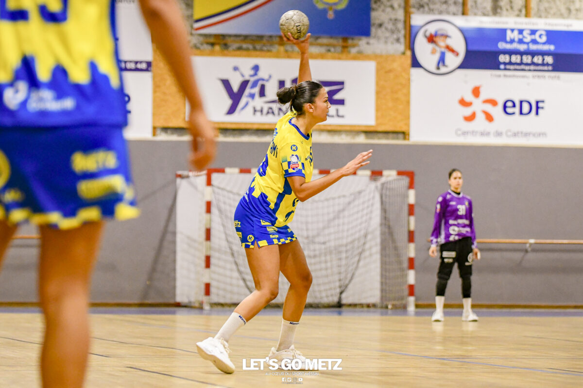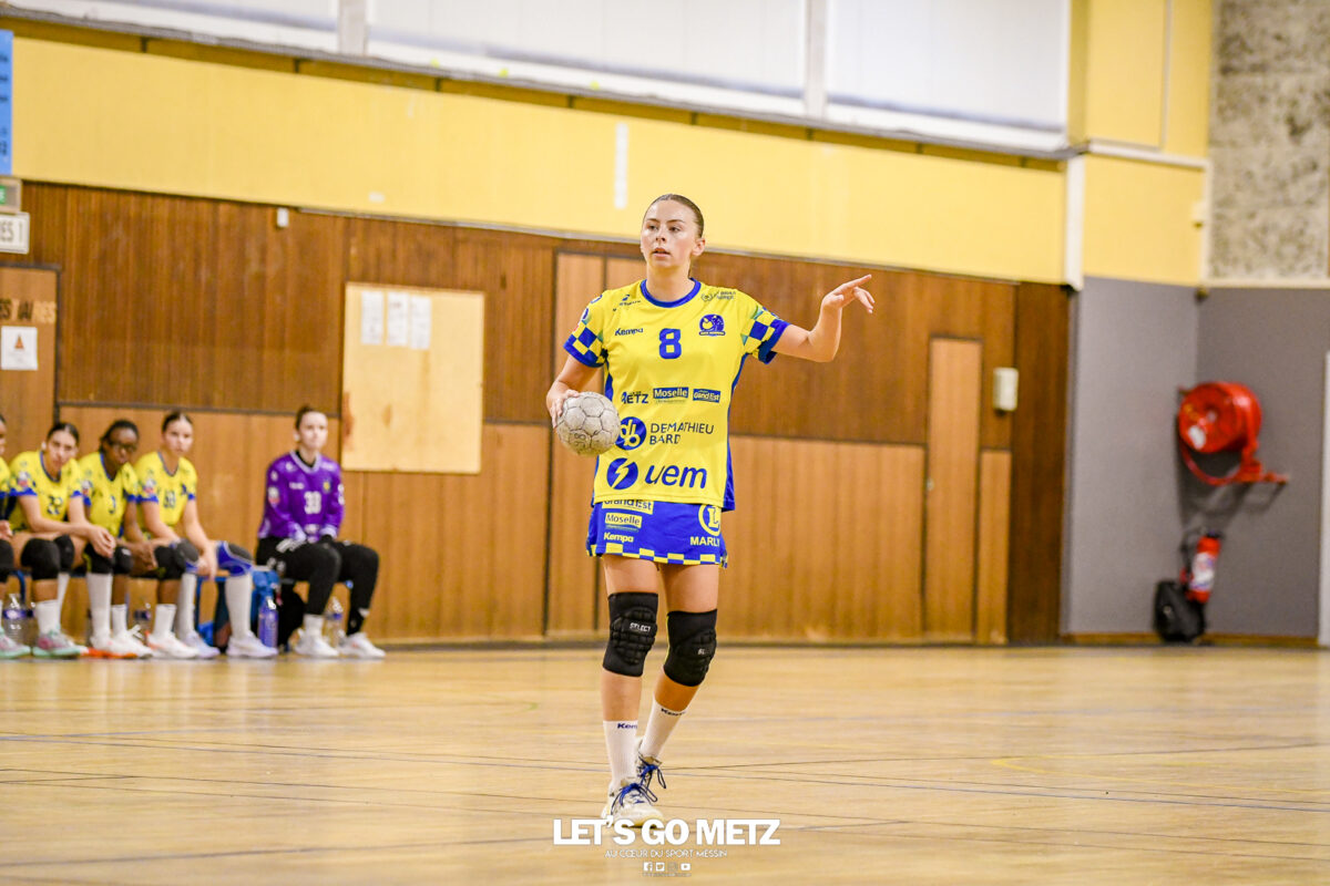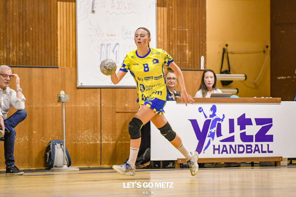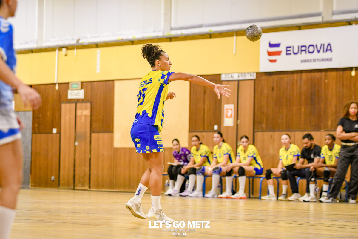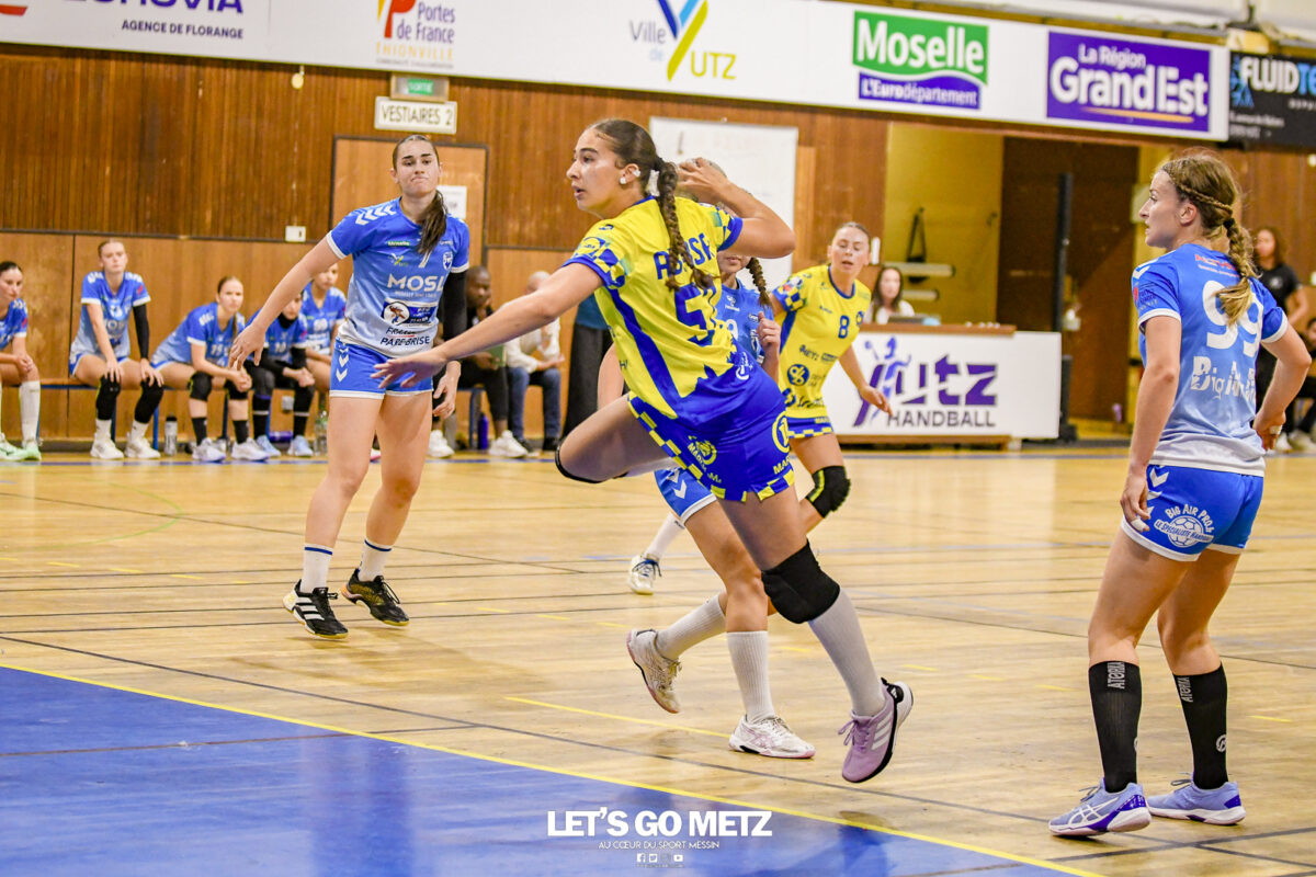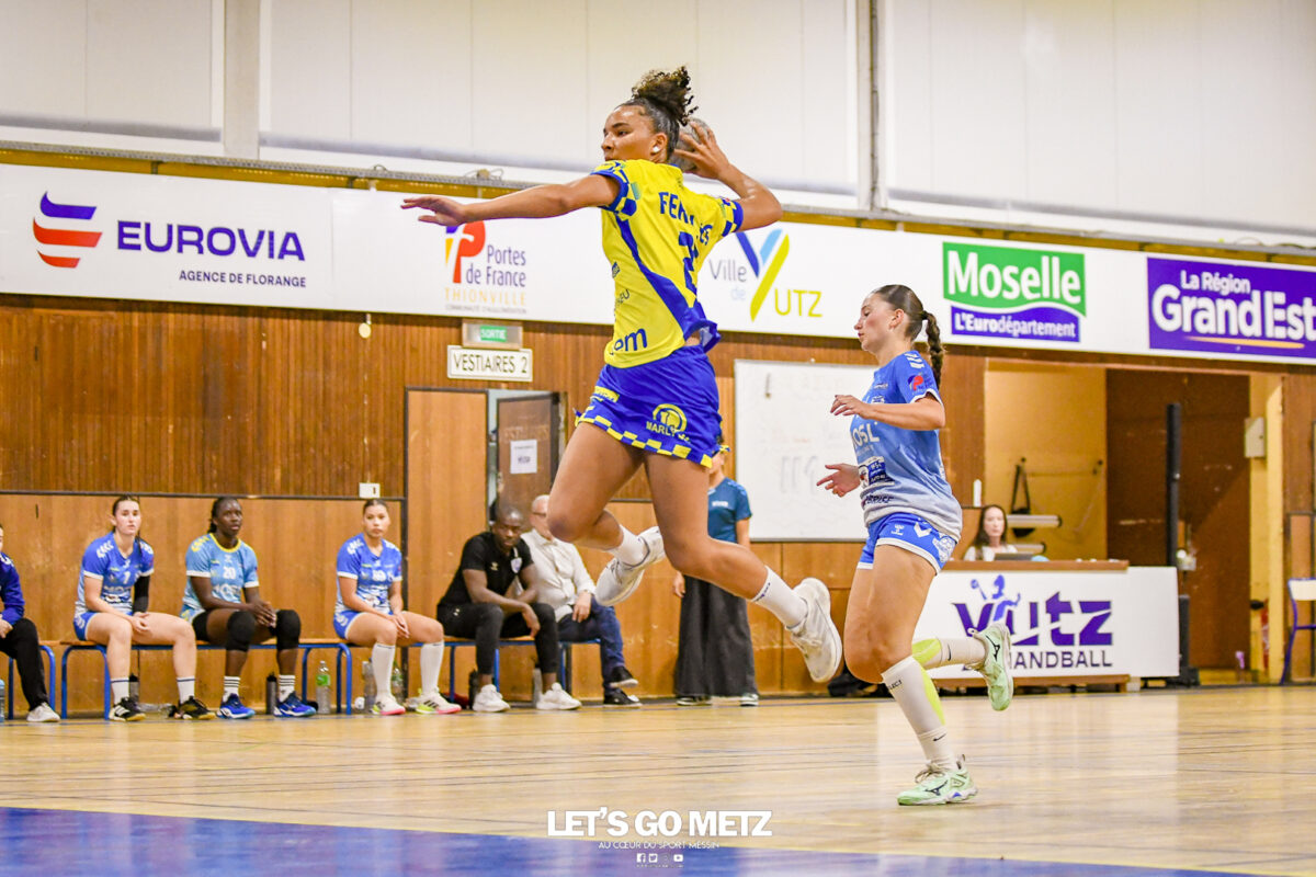 3,9K Les jeunes Dragonnes de Metz Handball retrouvaient la compétition en N1F ce samedi avec un match face à Yutz. Les saisons se suivent et ne se ressemblent pas forcément. L’équipe de Nationale 1 Féminine (N1F) de Metz Handball débutait sa saison par un derby face à Yutz. Invaincues tout au long de la saison 2024/2025, jusqu’à la finale de la compétition, les protégées de Nina Kanto viennent de découvrir une réalité tout à fait différente en débutant par une défaite. Il aurait fallu un véritable miracle pour que le résultat soit différent compte tenu des conditions. En cumulant départs de cadres à l’intersaison (Fatima Camara, Claire Koestner…), joueuses indisponibles car retenues avec les Dragonnes (Yvana Atangana, Blandine Gros) et un effectif général extrêmement jeune et pas tout à fait rôdé, Metz Handball se présentait à Yutz loin de sa stature habituelle de favori. Pourtant c’est bel et bien aux visiteuses que le début de rencontre profitait. Fiona Gooroosamy ouvrait la marque sur jet de sept mètres, suivie par Elea Ferdilus et Nelya Goval pour valider un 0-4 en cinq minutes. Il ne fallait guère plus de temps à Yutz pour recoller (4-4, 10ème). Metz continuait cependant de faire la course en tête, comptant jusqu’à six buts d’avance via une réalisation de Maily Etilopy (9-14, 23ème). La fin de mi-temps voyait Alice Giliberto récolter une suspension de deux minutes, au retour du vestiaire Helea Thevenot en faisait de même et les deux femmes étaient rejointes par Fiona Gooroosamy quelques minutes plus tard, mais cette succession d’infériorités numériques n’entamait pas l’avance messine (16-20, 38ème). C’est en définitive une disette d’une dizaine de minutes qui renversait la situation. Presque incapables d’aboutir à des situations de tir concrètes et encore moins de les concrétiser, les jeunes Dragonnes voyaient leur avance fondre et Yutz prenait une avance au tableau d’affichage pour la première fois de la partie (25-24, 54ème). Après un temps mort des locales, Ludyvine Kaakil-Talaba récoltait à son tour une suspension de deux minutes. Yutz en profitait pour valider un +2 à quelques minutes de la fin des débats mais une parade de Manuella Navarro et un but d’Elea Ferdilus semblaient redonner de l’élan aux jaune et bleu. Au bout du suspens c’est dans la main d’Helea Thevenot que le ballon du match nul reposait mais la gardienne yussoise Ghada Zarrai scellait la victoire des siennes.Score final de ce Yutz Handball – Metz Handball : 26-25 En manque de parades de gardienne, en manque de constance offensive, en manque de profondeur de banc, Metz Handball a tout de même failli s’imposer lors de cette première journée. À la lumière des enseignements récoltés, les jeunes Dragonnes tenteront de se reprendre à l’occasion de la deuxième journée de compétition, le dimanche 14 septembre à 16h à domicile face à Palaiseau. La galerie du match Les stats de la rencontre Metz HandballCinku (5 parades), Antunes Navarro (1 parade)Ababsa (1 but sur 3 tirs), Etilopy (5/9), Ferdilus (7/7), Giliberto (0/1), Gooroosamy (5/8), Goval (4/5), Holler (1/2), Kaakil-Talaba (1/3), Nguon (0/1), Thevenot (1/2). Yutz HandballZarrai (9 parades)Atmani (1 but sur 2 tirs), Barthelemy (2/5), Bingelmann-Nielsen (4/8), Birck (1/1), Carton-Caniez, Chevieux (2/2), Decet (7/13), Fadily, Masson (3/5), Salvucci, Talaat Abdel Razzak Mohamed Eoudy (5/6), Thome (1/2), Valette. Crédit photo : Mikael Frank / Let’s Go Metz
