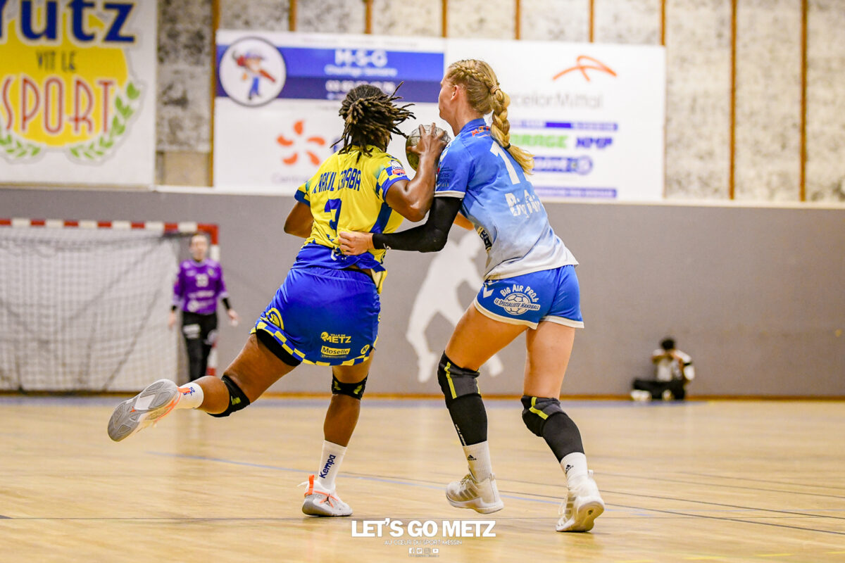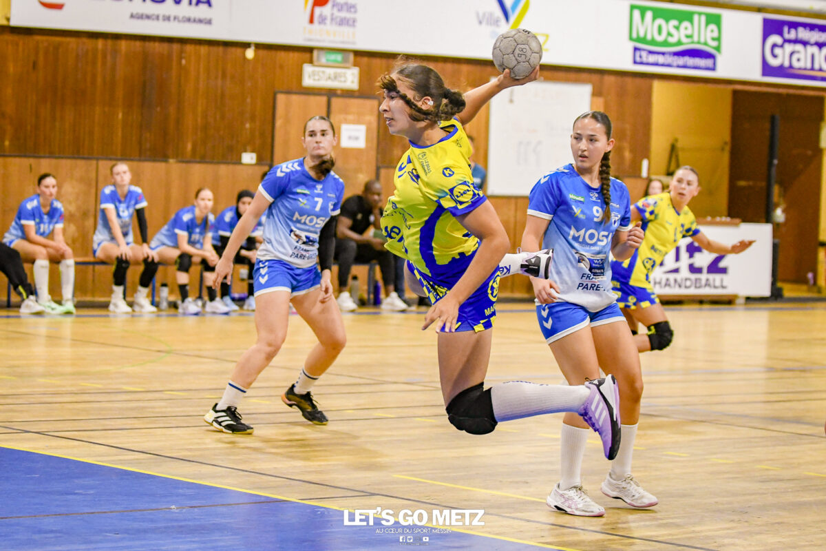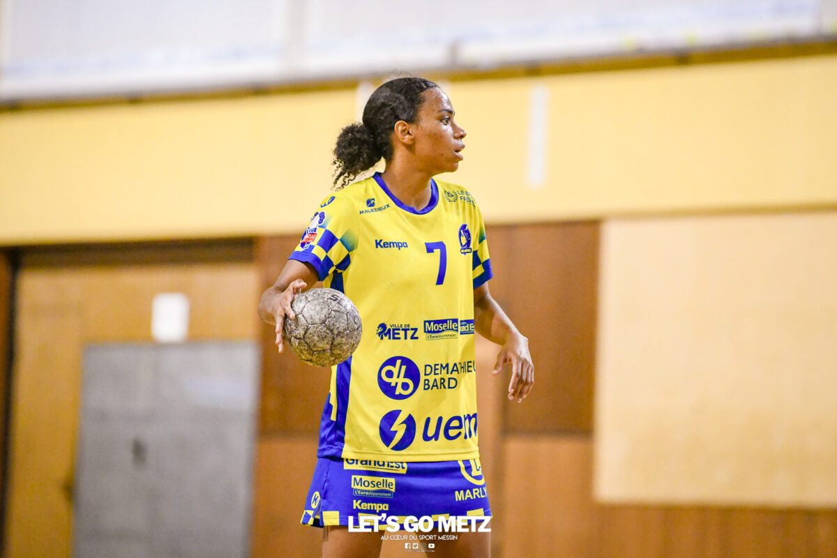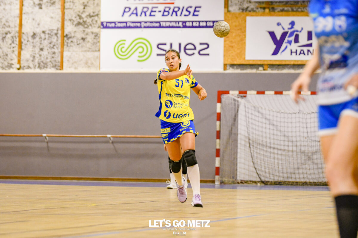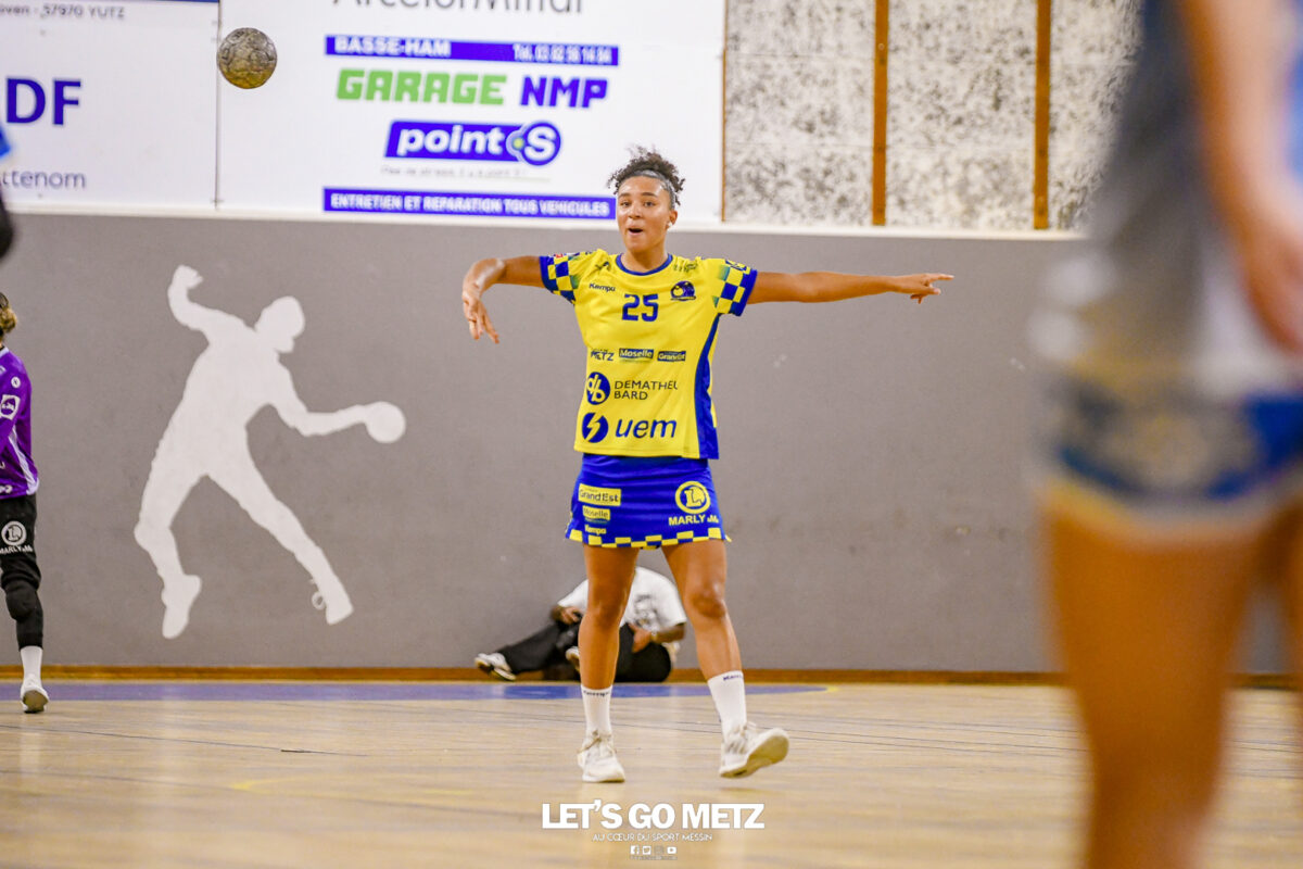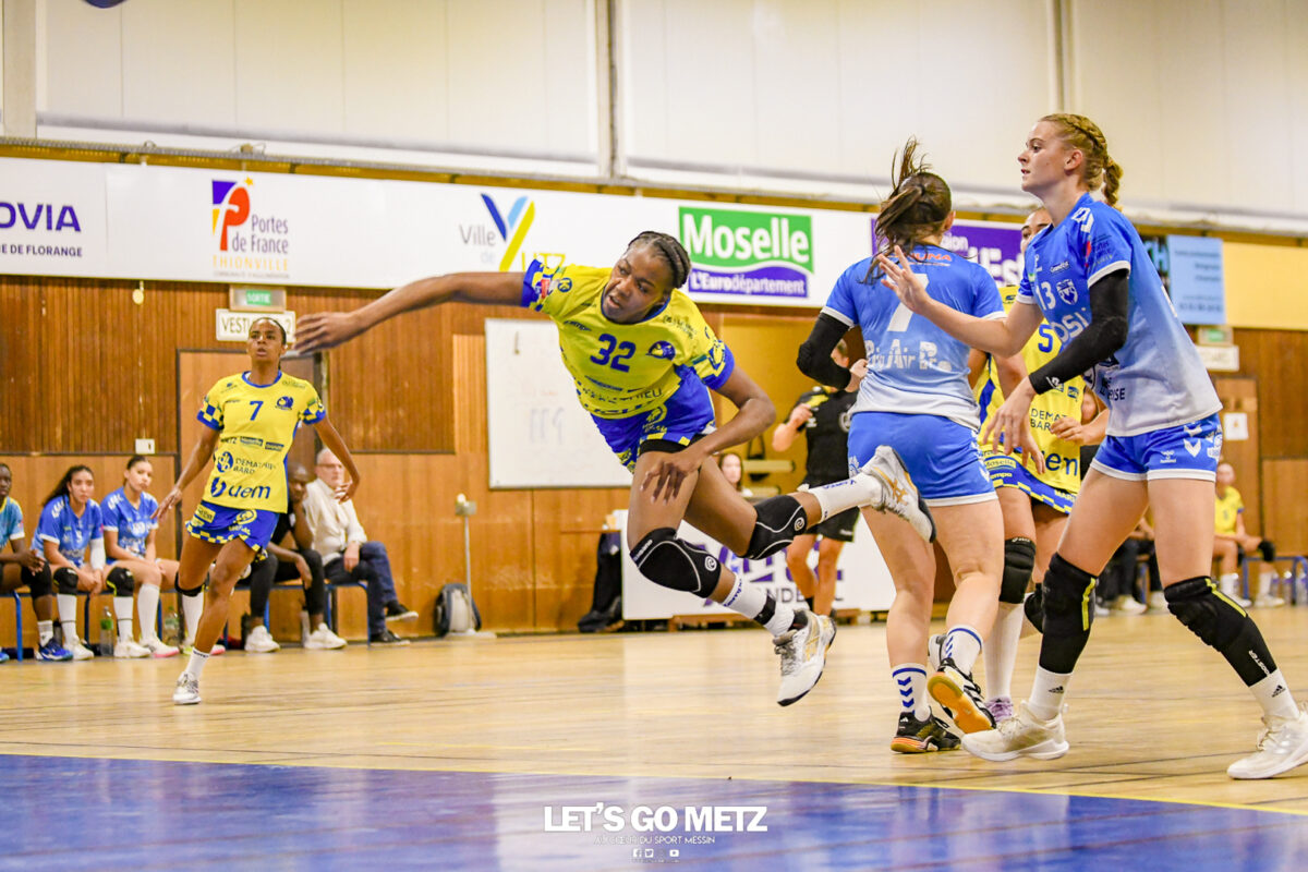 3,9K Les jeunes Dragonnes de Metz Handball retrouvaient la compétition en N1F ce samedi avec un match face à Yutz. Les saisons se suivent et ne se ressemblent pas forcément. L’équipe de Nationale 1 Féminine (N1F) de Metz Handball débutait sa saison par un derby face à Yutz. Invaincues tout au long de la saison 2024/2025, jusqu’à la finale de la compétition, les protégées de Nina Kanto viennent de découvrir une réalité tout à fait différente en débutant par une défaite. Il aurait fallu un véritable miracle pour que le résultat soit différent compte tenu des conditions. En cumulant départs de cadres à l’intersaison (Fatima Camara, Claire Koestner…), joueuses indisponibles car retenues avec les Dragonnes (Yvana Atangana, Blandine Gros) et un effectif général extrêmement jeune et pas tout à fait rôdé, Metz Handball se présentait à Yutz loin de sa stature habituelle de favori. Pourtant c’est bel et bien aux visiteuses que le début de rencontre profitait. Fiona Gooroosamy ouvrait la marque sur jet de sept mètres, suivie par Elea Ferdilus et Nelya Goval pour valider un 0-4 en cinq minutes. Il ne fallait guère plus de temps à Yutz pour recoller (4-4, 10ème). Metz continuait cependant de faire la course en tête, comptant jusqu’à six buts d’avance via une réalisation de Maily Etilopy (9-14, 23ème). La fin de mi-temps voyait Alice Giliberto récolter une suspension de deux minutes, au retour du vestiaire Helea Thevenot en faisait de même et les deux femmes étaient rejointes par Fiona Gooroosamy quelques minutes plus tard, mais cette succession d’infériorités numériques n’entamait pas l’avance messine (16-20, 38ème). C’est en définitive une disette d’une dizaine de minutes qui renversait la situation. Presque incapables d’aboutir à des situations de tir concrètes et encore moins de les concrétiser, les jeunes Dragonnes voyaient leur avance fondre et Yutz prenait une avance au tableau d’affichage pour la première fois de la partie (25-24, 54ème). Après un temps mort des locales, Ludyvine Kaakil-Talaba récoltait à son tour une suspension de deux minutes. Yutz en profitait pour valider un +2 à quelques minutes de la fin des débats mais une parade de Manuella Navarro et un but d’Elea Ferdilus semblaient redonner de l’élan aux jaune et bleu. Au bout du suspens c’est dans la main d’Helea Thevenot que le ballon du match nul reposait mais la gardienne yussoise Ghada Zarrai scellait la victoire des siennes.Score final de ce Yutz Handball – Metz Handball : 26-25 En manque de parades de gardienne, en manque de constance offensive, en manque de profondeur de banc, Metz Handball a tout de même failli s’imposer lors de cette première journée. À la lumière des enseignements récoltés, les jeunes Dragonnes tenteront de se reprendre à l’occasion de la deuxième journée de compétition, le dimanche 14 septembre à 16h à domicile face à Palaiseau. La galerie du match Les stats de la rencontre Metz HandballCinku (5 parades), Antunes Navarro (1 parade)Ababsa (1 but sur 3 tirs), Etilopy (5/9), Ferdilus (7/7), Giliberto (0/1), Gooroosamy (5/8), Goval (4/5), Holler (1/2), Kaakil-Talaba (1/3), Nguon (0/1), Thevenot (1/2). Yutz HandballZarrai (9 parades)Atmani (1 but sur 2 tirs), Barthelemy (2/5), Bingelmann-Nielsen (4/8), Birck (1/1), Carton-Caniez, Chevieux (2/2), Decet (7/13), Fadily, Masson (3/5), Salvucci, Talaat Abdel Razzak Mohamed Eoudy (5/6), Thome (1/2), Valette. Crédit photo : Mikael Frank / Let’s Go Metz
