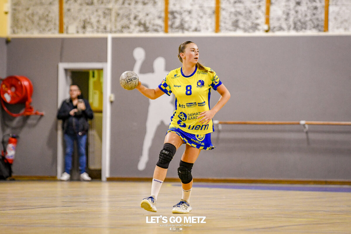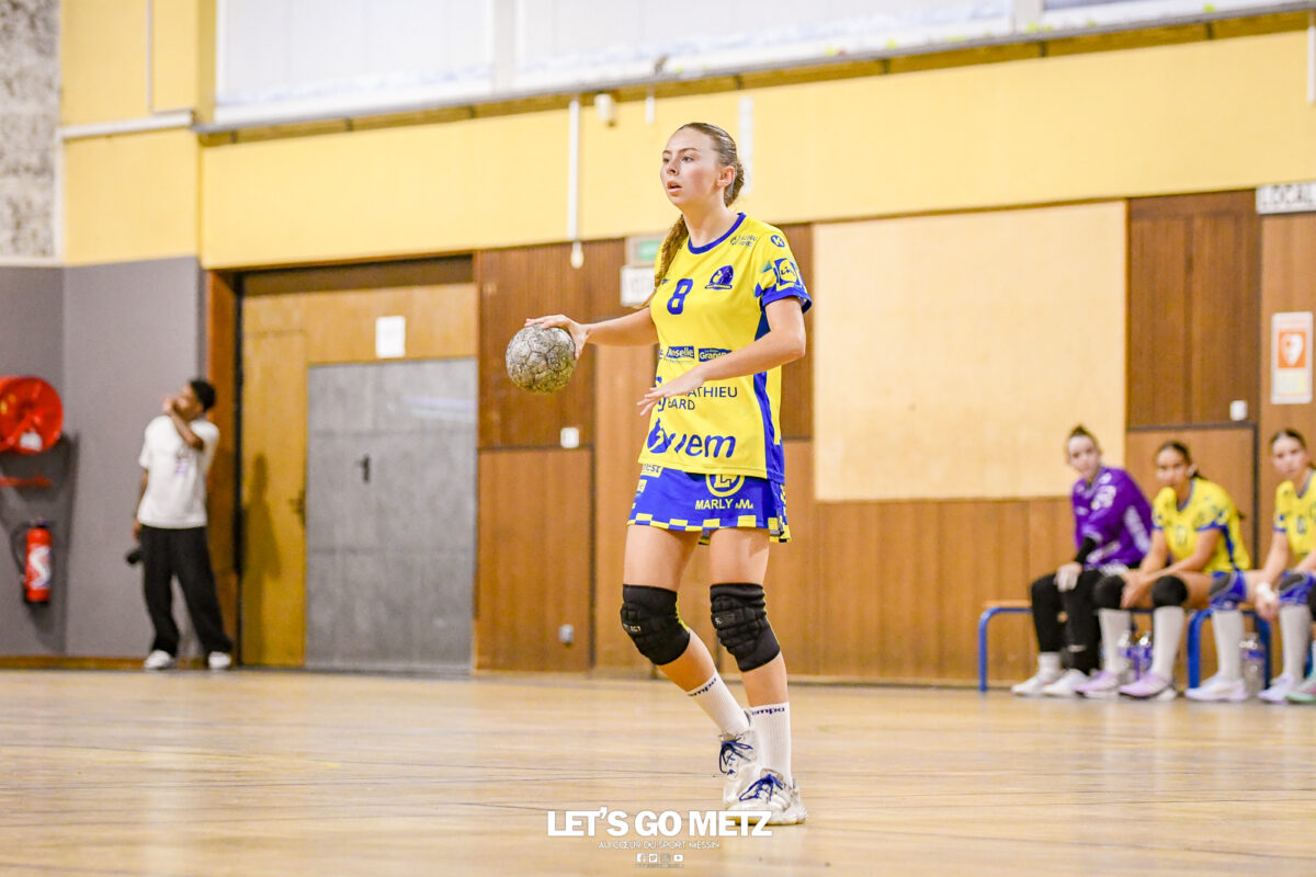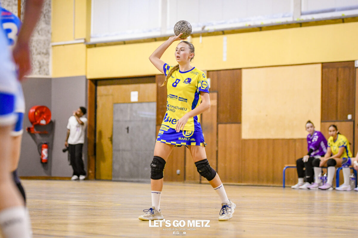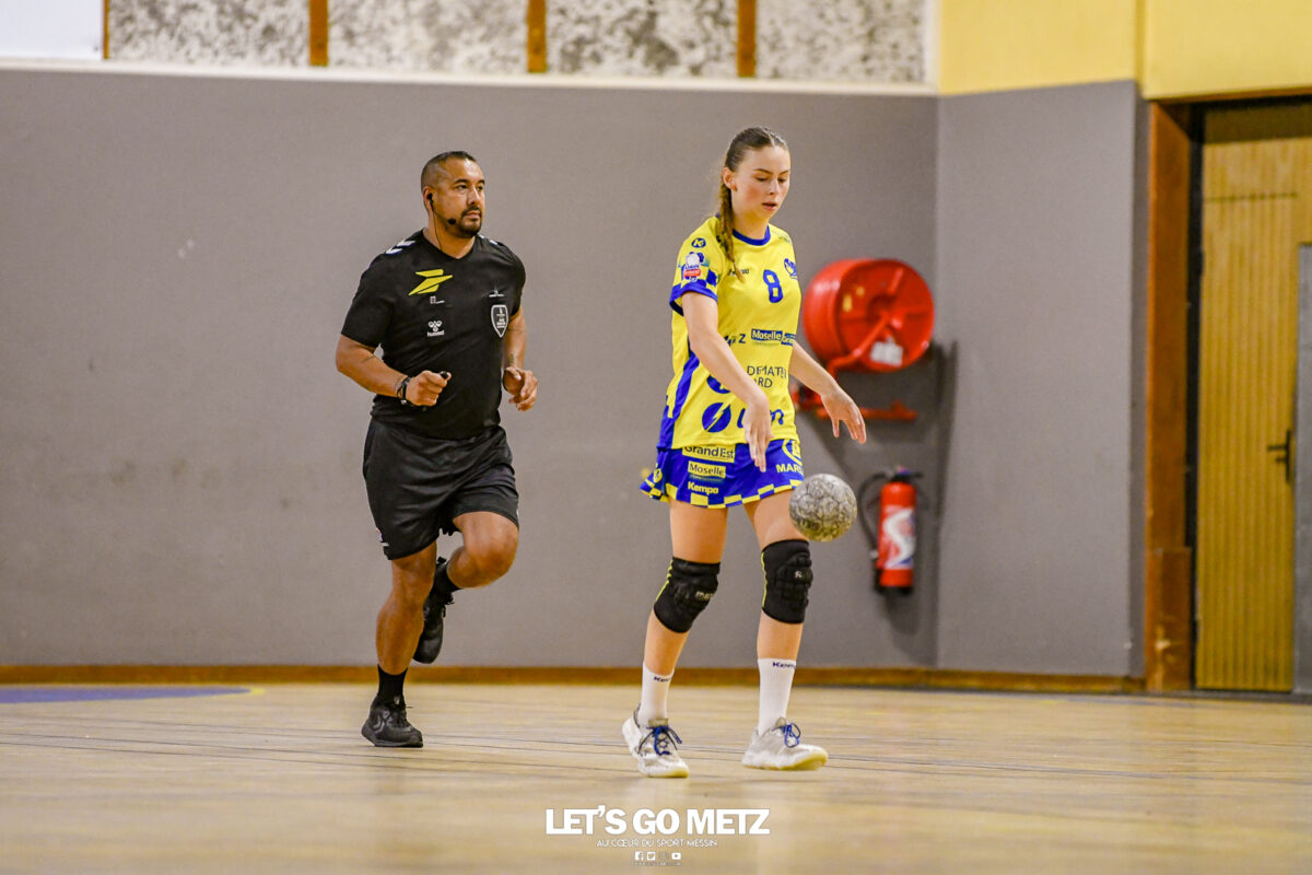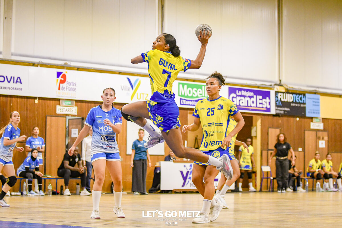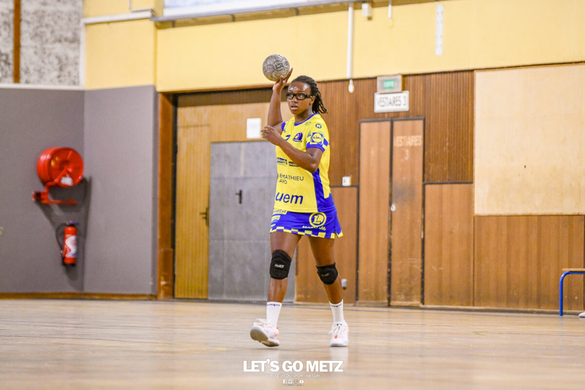 3,9K Les jeunes Dragonnes de Metz Handball retrouvaient la compétition en N1F ce samedi avec un match face à Yutz. Les saisons se suivent et ne se ressemblent pas forcément. L’équipe de Nationale 1 Féminine (N1F) de Metz Handball débutait sa saison par un derby face à Yutz. Invaincues tout au long de la saison 2024/2025, jusqu’à la finale de la compétition, les protégées de Nina Kanto viennent de découvrir une réalité tout à fait différente en débutant par une défaite. Il aurait fallu un véritable miracle pour que le résultat soit différent compte tenu des conditions. En cumulant départs de cadres à l’intersaison (Fatima Camara, Claire Koestner…), joueuses indisponibles car retenues avec les Dragonnes (Yvana Atangana, Blandine Gros) et un effectif général extrêmement jeune et pas tout à fait rôdé, Metz Handball se présentait à Yutz loin de sa stature habituelle de favori. Pourtant c’est bel et bien aux visiteuses que le début de rencontre profitait. Fiona Gooroosamy ouvrait la marque sur jet de sept mètres, suivie par Elea Ferdilus et Nelya Goval pour valider un 0-4 en cinq minutes. Il ne fallait guère plus de temps à Yutz pour recoller (4-4, 10ème). Metz continuait cependant de faire la course en tête, comptant jusqu’à six buts d’avance via une réalisation de Maily Etilopy (9-14, 23ème). La fin de mi-temps voyait Alice Giliberto récolter une suspension de deux minutes, au retour du vestiaire Helea Thevenot en faisait de même et les deux femmes étaient rejointes par Fiona Gooroosamy quelques minutes plus tard, mais cette succession d’infériorités numériques n’entamait pas l’avance messine (16-20, 38ème). C’est en définitive une disette d’une dizaine de minutes qui renversait la situation. Presque incapables d’aboutir à des situations de tir concrètes et encore moins de les concrétiser, les jeunes Dragonnes voyaient leur avance fondre et Yutz prenait une avance au tableau d’affichage pour la première fois de la partie (25-24, 54ème). Après un temps mort des locales, Ludyvine Kaakil-Talaba récoltait à son tour une suspension de deux minutes. Yutz en profitait pour valider un +2 à quelques minutes de la fin des débats mais une parade de Manuella Navarro et un but d’Elea Ferdilus semblaient redonner de l’élan aux jaune et bleu. Au bout du suspens c’est dans la main d’Helea Thevenot que le ballon du match nul reposait mais la gardienne yussoise Ghada Zarrai scellait la victoire des siennes.Score final de ce Yutz Handball – Metz Handball : 26-25 En manque de parades de gardienne, en manque de constance offensive, en manque de profondeur de banc, Metz Handball a tout de même failli s’imposer lors de cette première journée. À la lumière des enseignements récoltés, les jeunes Dragonnes tenteront de se reprendre à l’occasion de la deuxième journée de compétition, le dimanche 14 septembre à 16h à domicile face à Palaiseau. La galerie du match Les stats de la rencontre Metz HandballCinku (5 parades), Antunes Navarro (1 parade)Ababsa (1 but sur 3 tirs), Etilopy (5/9), Ferdilus (7/7), Giliberto (0/1), Gooroosamy (5/8), Goval (4/5), Holler (1/2), Kaakil-Talaba (1/3), Nguon (0/1), Thevenot (1/2). Yutz HandballZarrai (9 parades)Atmani (1 but sur 2 tirs), Barthelemy (2/5), Bingelmann-Nielsen (4/8), Birck (1/1), Carton-Caniez, Chevieux (2/2), Decet (7/13), Fadily, Masson (3/5), Salvucci, Talaat Abdel Razzak Mohamed Eoudy (5/6), Thome (1/2), Valette. Crédit photo : Mikael Frank / Let’s Go Metz