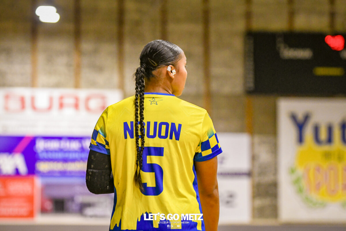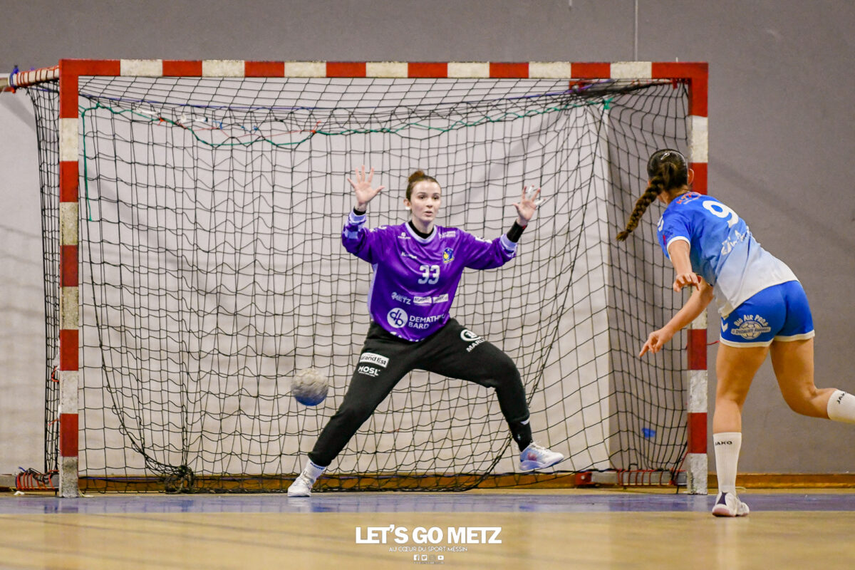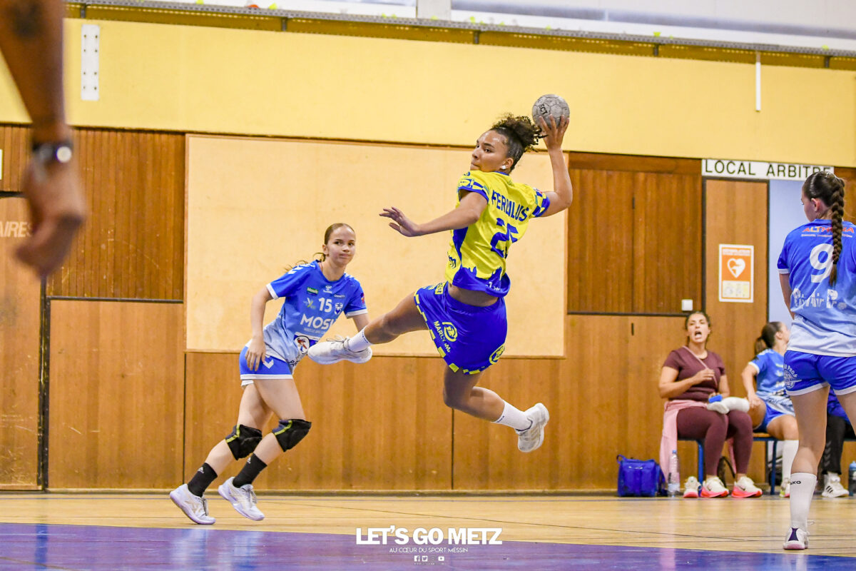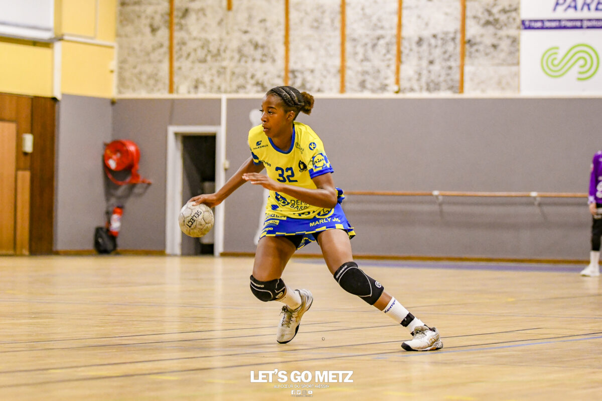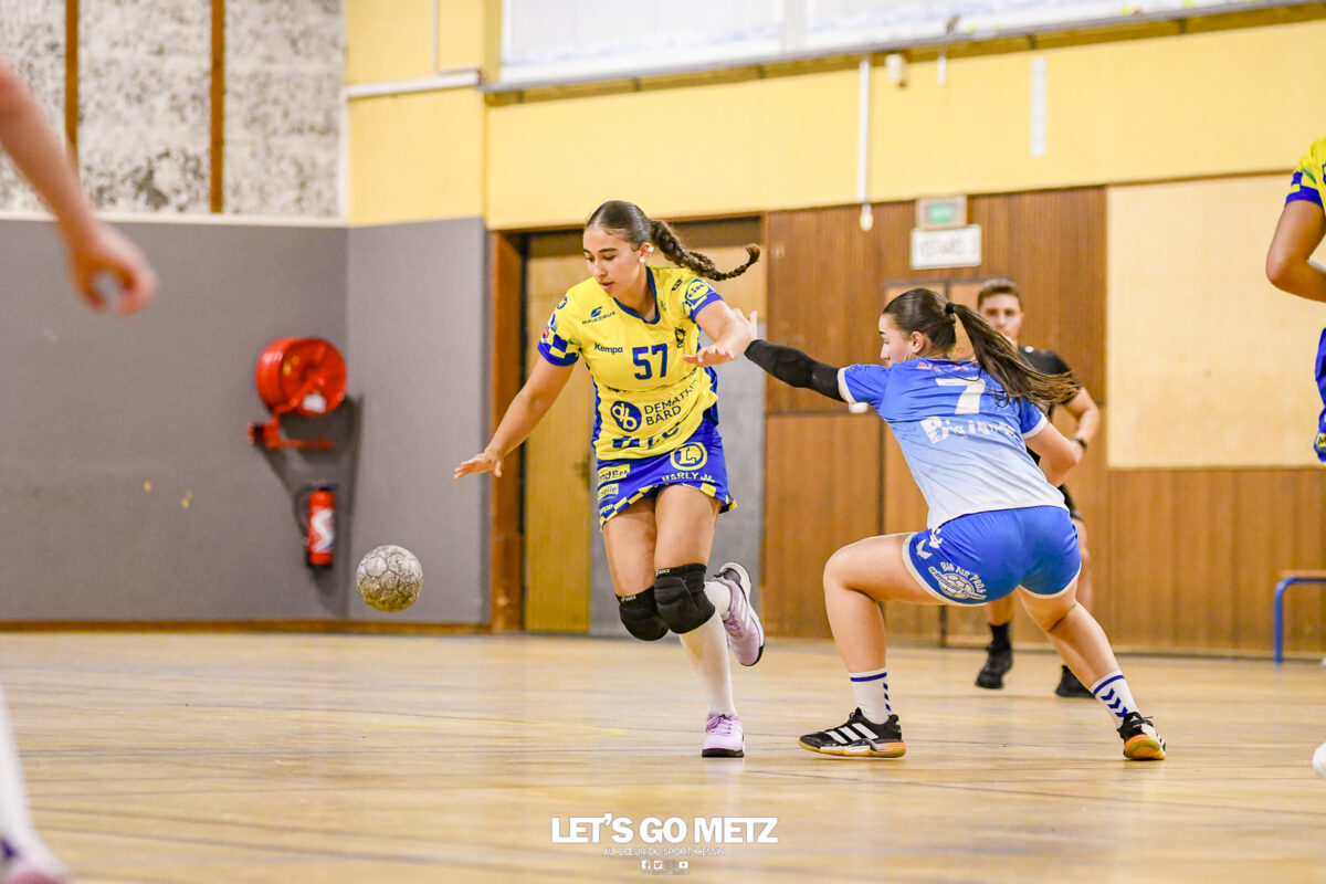 3,9K Les jeunes Dragonnes de Metz Handball retrouvaient la compétition en N1F ce samedi avec un match face à Yutz. Les saisons se suivent et ne se ressemblent pas forcément. L’équipe de Nationale 1 Féminine (N1F) de Metz Handball débutait sa saison par un derby face à Yutz. Invaincues tout au long de la saison 2024/2025, jusqu’à la finale de la compétition, les protégées de Nina Kanto viennent de découvrir une réalité tout à fait différente en débutant par une défaite. Il aurait fallu un véritable miracle pour que le résultat soit différent compte tenu des conditions. En cumulant départs de cadres à l’intersaison (Fatima Camara, Claire Koestner…), joueuses indisponibles car retenues avec les Dragonnes (Yvana Atangana, Blandine Gros) et un effectif général extrêmement jeune et pas tout à fait rôdé, Metz Handball se présentait à Yutz loin de sa stature habituelle de favori. Pourtant c’est bel et bien aux visiteuses que le début de rencontre profitait. Fiona Gooroosamy ouvrait la marque sur jet de sept mètres, suivie par Elea Ferdilus et Nelya Goval pour valider un 0-4 en cinq minutes. Il ne fallait guère plus de temps à Yutz pour recoller (4-4, 10ème). Metz continuait cependant de faire la course en tête, comptant jusqu’à six buts d’avance via une réalisation de Maily Etilopy (9-14, 23ème). La fin de mi-temps voyait Alice Giliberto récolter une suspension de deux minutes, au retour du vestiaire Helea Thevenot en faisait de même et les deux femmes étaient rejointes par Fiona Gooroosamy quelques minutes plus tard, mais cette succession d’infériorités numériques n’entamait pas l’avance messine (16-20, 38ème). C’est en définitive une disette d’une dizaine de minutes qui renversait la situation. Presque incapables d’aboutir à des situations de tir concrètes et encore moins de les concrétiser, les jeunes Dragonnes voyaient leur avance fondre et Yutz prenait une avance au tableau d’affichage pour la première fois de la partie (25-24, 54ème). Après un temps mort des locales, Ludyvine Kaakil-Talaba récoltait à son tour une suspension de deux minutes. Yutz en profitait pour valider un +2 à quelques minutes de la fin des débats mais une parade de Manuella Navarro et un but d’Elea Ferdilus semblaient redonner de l’élan aux jaune et bleu. Au bout du suspens c’est dans la main d’Helea Thevenot que le ballon du match nul reposait mais la gardienne yussoise Ghada Zarrai scellait la victoire des siennes.Score final de ce Yutz Handball – Metz Handball : 26-25 En manque de parades de gardienne, en manque de constance offensive, en manque de profondeur de banc, Metz Handball a tout de même failli s’imposer lors de cette première journée. À la lumière des enseignements récoltés, les jeunes Dragonnes tenteront de se reprendre à l’occasion de la deuxième journée de compétition, le dimanche 14 septembre à 16h à domicile face à Palaiseau. La galerie du match Les stats de la rencontre Metz HandballCinku (5 parades), Antunes Navarro (1 parade)Ababsa (1 but sur 3 tirs), Etilopy (5/9), Ferdilus (7/7), Giliberto (0/1), Gooroosamy (5/8), Goval (4/5), Holler (1/2), Kaakil-Talaba (1/3), Nguon (0/1), Thevenot (1/2). Yutz HandballZarrai (9 parades)Atmani (1 but sur 2 tirs), Barthelemy (2/5), Bingelmann-Nielsen (4/8), Birck (1/1), Carton-Caniez, Chevieux (2/2), Decet (7/13), Fadily, Masson (3/5), Salvucci, Talaat Abdel Razzak Mohamed Eoudy (5/6), Thome (1/2), Valette. Crédit photo : Mikael Frank / Let’s Go Metz