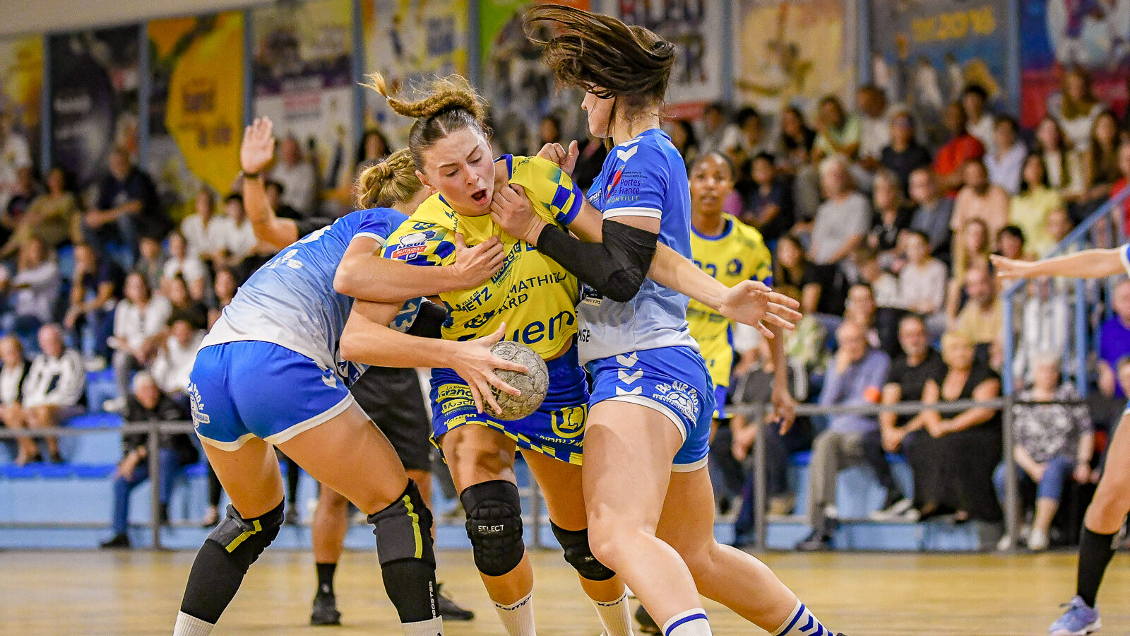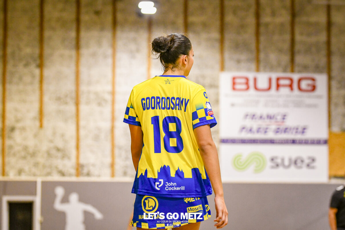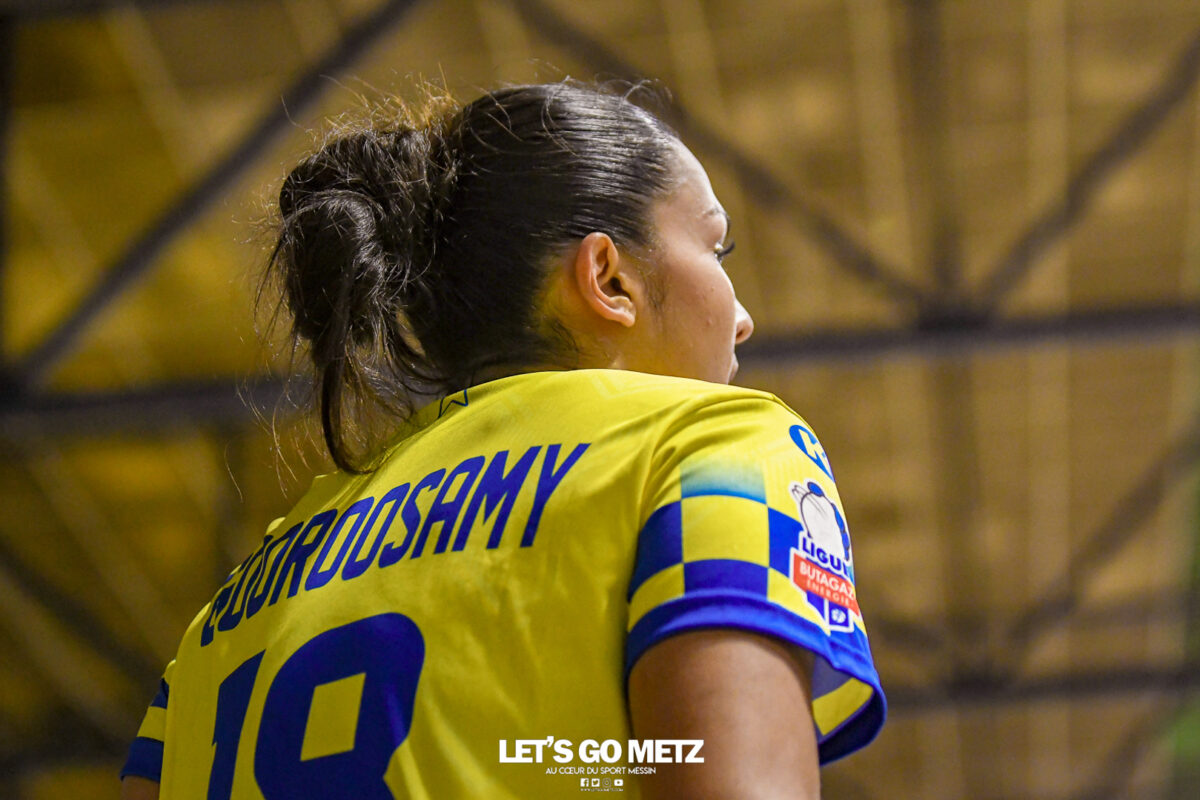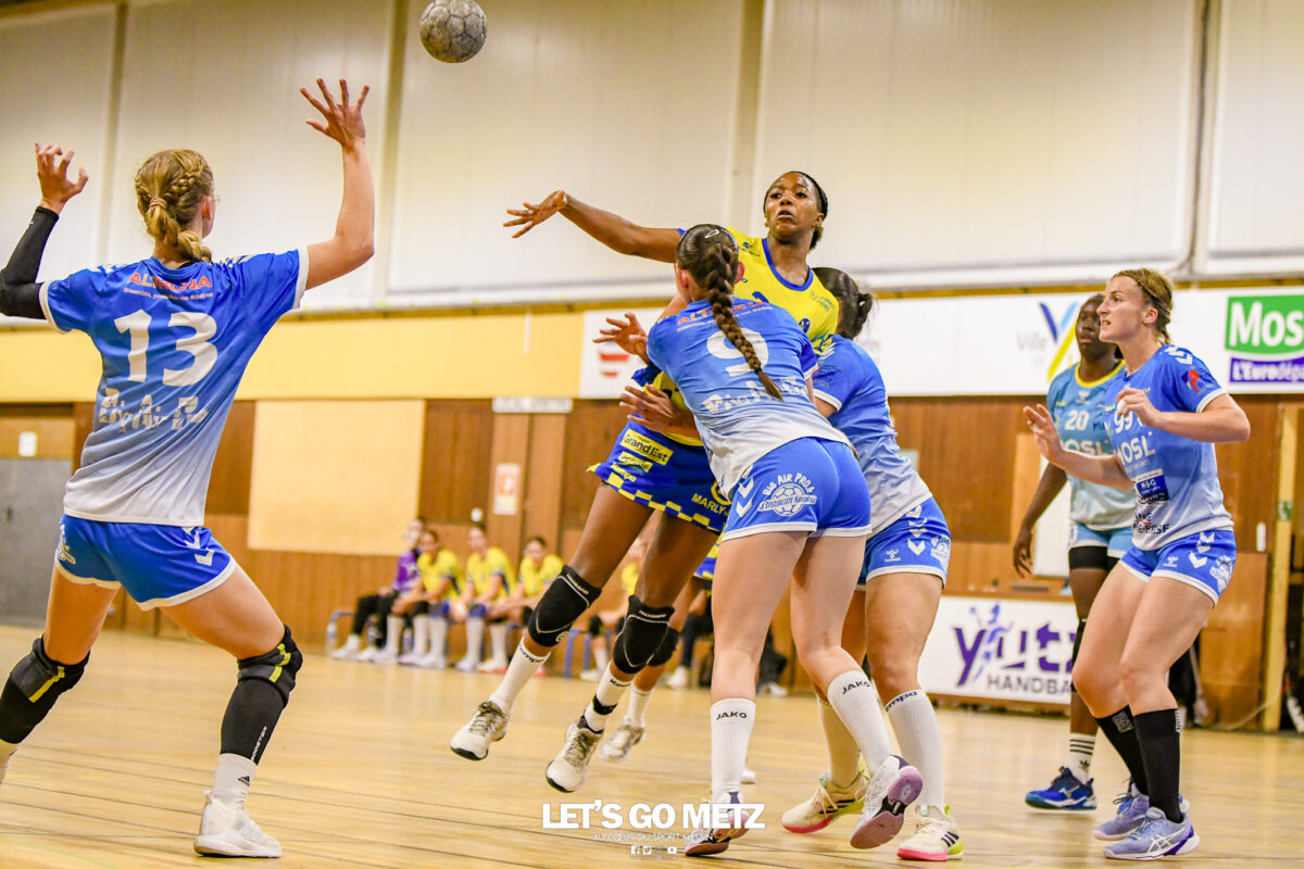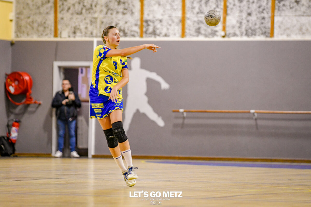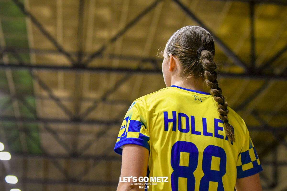 3,9K Les jeunes Dragonnes de Metz Handball retrouvaient la compétition en N1F ce samedi avec un match face à Yutz. Les saisons se suivent et ne se ressemblent pas forcément. L’équipe de Nationale 1 Féminine (N1F) de Metz Handball débutait sa saison par un derby face à Yutz. Invaincues tout au long de la saison 2024/2025, jusqu’à la finale de la compétition, les protégées de Nina Kanto viennent de découvrir une réalité tout à fait différente en débutant par une défaite. Il aurait fallu un véritable miracle pour que le résultat soit différent compte tenu des conditions. En cumulant départs de cadres à l’intersaison (Fatima Camara, Claire Koestner…), joueuses indisponibles car retenues avec les Dragonnes (Yvana Atangana, Blandine Gros) et un effectif général extrêmement jeune et pas tout à fait rôdé, Metz Handball se présentait à Yutz loin de sa stature habituelle de favori. Pourtant c’est bel et bien aux visiteuses que le début de rencontre profitait. Fiona Gooroosamy ouvrait la marque sur jet de sept mètres, suivie par Elea Ferdilus et Nelya Goval pour valider un 0-4 en cinq minutes. Il ne fallait guère plus de temps à Yutz pour recoller (4-4, 10ème). Metz continuait cependant de faire la course en tête, comptant jusqu’à six buts d’avance via une réalisation de Maily Etilopy (9-14, 23ème). La fin de mi-temps voyait Alice Giliberto récolter une suspension de deux minutes, au retour du vestiaire Helea Thevenot en faisait de même et les deux femmes étaient rejointes par Fiona Gooroosamy quelques minutes plus tard, mais cette succession d’infériorités numériques n’entamait pas l’avance messine (16-20, 38ème). C’est en définitive une disette d’une dizaine de minutes qui renversait la situation. Presque incapables d’aboutir à des situations de tir concrètes et encore moins de les concrétiser, les jeunes Dragonnes voyaient leur avance fondre et Yutz prenait une avance au tableau d’affichage pour la première fois de la partie (25-24, 54ème). Après un temps mort des locales, Ludyvine Kaakil-Talaba récoltait à son tour une suspension de deux minutes. Yutz en profitait pour valider un +2 à quelques minutes de la fin des débats mais une parade de Manuella Navarro et un but d’Elea Ferdilus semblaient redonner de l’élan aux jaune et bleu. Au bout du suspens c’est dans la main d’Helea Thevenot que le ballon du match nul reposait mais la gardienne yussoise Ghada Zarrai scellait la victoire des siennes.Score final de ce Yutz Handball – Metz Handball : 26-25 En manque de parades de gardienne, en manque de constance offensive, en manque de profondeur de banc, Metz Handball a tout de même failli s’imposer lors de cette première journée. À la lumière des enseignements récoltés, les jeunes Dragonnes tenteront de se reprendre à l’occasion de la deuxième journée de compétition, le dimanche 14 septembre à 16h à domicile face à Palaiseau. La galerie du match Les stats de la rencontre Metz HandballCinku (5 parades), Antunes Navarro (1 parade)Ababsa (1 but sur 3 tirs), Etilopy (5/9), Ferdilus (7/7), Giliberto (0/1), Gooroosamy (5/8), Goval (4/5), Holler (1/2), Kaakil-Talaba (1/3), Nguon (0/1), Thevenot (1/2). Yutz HandballZarrai (9 parades)Atmani (1 but sur 2 tirs), Barthelemy (2/5), Bingelmann-Nielsen (4/8), Birck (1/1), Carton-Caniez, Chevieux (2/2), Decet (7/13), Fadily, Masson (3/5), Salvucci, Talaat Abdel Razzak Mohamed Eoudy (5/6), Thome (1/2), Valette. Crédit photo : Mikael Frank / Let’s Go Metz