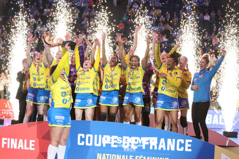 2,K Metz Handball a remporté son premier trophée de la saison, en battant Paris 92 en finale de la Coupe de France (32-18), ce samedi à Bercy. Les Dragonnes en route vers un triplé historique ? Comme une évidence… Metz Handball a remporté sa 13e Coupe de France, samedi 17 mai, face à Paris 92. Comme il y a deux ans, lors de la dernière rencontre entre ces deux formations à Bercy, la finale a tourné en faveur de Dragonnes. La force de l’habitude pour les protégées d’Emmanuel Mayonnade et la conclusion d’une belle journée pour le handball lorrain, après le sacre de Pagny-sur-Moselle en finale régionale féminine, et la grande performance des Cerbères, qui ont fait douter l’Elite Val d’Oise Handball jusqu’au bout de la finale fédérale masculine.Dès la pause (16-10), les Dragonnes ont montré aux Lionnes de Paris 92 – qu’elles retrouveront mercredi à Issy-les-Moulineaux en Ligue Butagaz Energie – le caractère incontestable de la suprématie nationale à l’échelle nationale. Une équipe de Metz Handball en contrôle total de cette finale de Coupe de France, en témoigne le turnover savant pratiqué par Emmanuel Mayonnade sur cette deuxième période, qui portait ainsi son avance à dix unités, tranquillement mais sûrement (22-12, 43′). Intraitables en défense, les partenaires de Sarah Bouktit voguaient donc sereinement vers leur premier trophée de la saison… La première étape d’un triplé historique ? Metz Handball 32-18 Paris 92 Metz HandballDarleux (5 arrêts/15 tirs), Szemerey (6/14)Hansen (3 buts/5 tirs), Axner (1/2), Augustine (2/3), Mlamali (2/2), Jacques (6/10), Bouktit (6/6), Granier (4/6), Grandveau (3/4), Vamos (2/4), Schatzl (0/1), Errard (3/4), Chambertin, Pineau Paris 92Serdarevic (6 arrêts/20 tirs), Placzek (5/21)Sagna (3 buts/7 tirs), Pina (1/2), N’Gouan, Cissokho, Andon (3/5), Kanouté (4/7), Blonbou (2/5), Techer (1/2), Moretto (2/5), Fofana (1/2), Houze, Thobor (1/1), Prouvensier (0/2), Golvet Crédit photo : Julien Buret / Let’s Go Metz