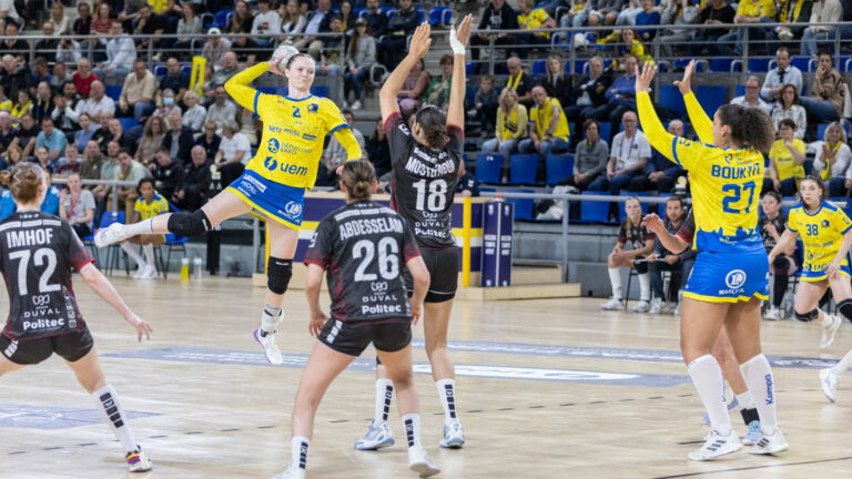 1,5K Metz Handball s’impose face à Strasbourg (37-19) et officialise son 27e titre de champion de France. Idéal avant le Final 4 de la Champions League. Le succès rapporté de Brest il y a deux semaines marquait déjà un coup presque décisif au suspense de la Ligue Butagaz Energie. Metz Handball prenait dès lors quatre points d’avance sur son principal rival à quatre journées du terme de la saison. Restait à terminer le travail afin de partir disputer le Final four de la Champions League l’esprit libéré. Après la victoire acquise sur le parquet de Paris 92 ce mercredi, Metz Handball mettaient tous les ingrédients pour se simplifier la vie et ne pas s’encombrer l’esprit inutilement. Et, comme au match aller, Strasbourg ne parvenait pas à faire dérailler la belle machine jaune et bleue. Dès l’entame, sous l’impulsion de Lena Grandveau et de Petra Vamos, les Dragonnes imposaient leur jeu rapide et se détachaient au score (3-1, 4e). Anne-Mette Hansen et surtout Lucie Granier se mettaient au diapason et les filles d’Emmanuel Mayonnade prenaient irrémédiablement l’ascendant sur des Piraths dépassées par le le rythme imposé (12-3, 12e). Après avoir vu son jet de sept mètres détourné par Cléopâtre Darleux, Margaux Imhof tentait bien de maintenir son équipe à flots. Mais face à une défense messine étouffante, les Alsaciennes avaient toutes les peines du monde à mettre leur jeu d’attaque en place. A la pause, elles accusaient un retard de onze unités (21-10, 30e). Un écart qui explique sans doute les scories et imprécisions entrevues lors de la fin du premier acte et des trente dernières minutes. Comme, par exemple, le premier échec à mettre au débours de Lucie Granier au retour des vestiaires. Après ces deux trophées remportés, Metz Handball peut préparer le Final 4 avec sérénité Mais l’ailière droite était tellement précise jusque-là qu’on peut considérer celui-ci comme un épiphénomène. La Marseillaise (8/11), comme Léna Grandveau (6/7) et Anne-Mette Hansen (5/10) ont été les grandes artisanes du succès validant le 27e titre de champion de France et le quatrième doublé consécutif de Metz Handball. Le club du président Weizman peut désormais se concentrer sur sa quête européenne à Budapest la semaine prochaine. Si elles veulent aller au bout de leur rêve face à Odense puis au vainqueur du duel entre Györ et Esbjerg, il conviendra tout de même de se montrer plus régulier au tir et notamment au jet de sept mètres. En effet, Sarah Bouktit, Anne-Mette Hansen et Allison Pineau ont successivement échoué dans l’exercice. Mais nul doute que la concentration et l’application seront les maîtres mots de la semaine. Score final de ce Metz Handball / Strasbourg Achenheim Truchtersheim: 37-19 (mi-temps 21-10) La galerie du match Les stats de la rencontre Metz HandballDarleux (7 parades sur 17 tirs), Szemerey (6/15).Pineau (0 but/1 tir), Hansen (5/10), Axner (3/3), Augustine (2/2), Mlamali (2/3), Jacques (2/6), Bouktit (2/3), Granier (8/11), Grandveau (6/7), Vamos (3/4), Schatzl (1/2), Errard (3/4).Exclusions: Augustine (20e) Strasbourg Achenheim TruchtersheimFargues (8 parades sur 45 tirs), Gasnet Begon (2 buts sur 3 tirs), Guerrier (3/5), Mostefaoui (1/1), Vlug (1/3), Ahlen (2/8), Abdesselam (0/4), Maurin, Barlet (2/2), Tucella (0/1), Imhof (3/4), Muller (3/4), Cvijic (2/3).Exclusions: Guerrier (12e), Alhen (18e), Mostefaoui (31e) Crédit photo : Matthieu Henkinet / Let’s Go Metz