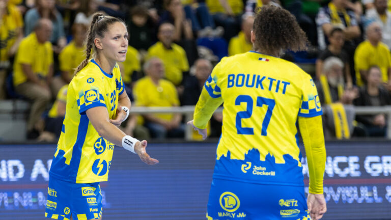 1,2K Ce samedi, Metz Handball a facilement dominé Buducnost Podgorica (38-18) et enchaine un 4e succès de rang en Champions League Rien ne semble arrêter le Metz Handball cuvée 2025/2026. Ce collectif semble cultiver une telle sérénité et une telle sûreté en ses force qu’aucun adversaire ne trouve le moyen pour contrarier la machine jaune et bleu. L’un après l’autre, ils repartent avec une défaite et les filets remplis de buts, surtout lorsque la rencontre se déroule sur le parquet des Arènes. La jeune équipe de Buducnost Podgorica n’a pas fait exception. Comme Dortmund il y a trois semaines, le club monténégrin a encaissé 38 buts et, comme la Stella Saint-Maur en milieu de semaine, n’a pu empêcher l’écart d’atteindre vingt unités (38-18). Une victoire acquise au fil d’une lente mais inéluctable mise en action des protégées d’Emmanuel Mayonnade. Metz Handball guidé par son quatuor magique… Comme souvent depuis le début de l’exercice, Podgorica parvenait à rester au contact des Lorraines durant les dix premières minutes de la rencontre (4-5, 9e). Pourtant, Metz Handball était parfaitement lancé par sa capitaine. A l’image de sa prestation en banlieue parisienne (9/9), Sarah Bouktit inscrivait trois des quatre premières réalisations de sa formation, l’autre l’ayant été par Tyra Axnér qui avait ouvert les hostilités. L’arrière gauche suédoise, quelque peu en déficit de confiance depuis la reprise, lançait idéalement un match qu’elle allait marquer de son empreinte. Elle inscrivait encore trois nouveaux buts lors du premier acte. Elle portait l’attaque messine en compagnie de ses compères Sarah Bouktit, Lucie Granier et Lena Grandveau. Sous leur impulsion, l’écart n’a cessé de se creuser (7-5, 10e, 11-7, 21e) avant d’atteindre neuf unités à la pause après que Anne-Emmanuelle Augustine faisait trembler les filets (20-11, 30e). Mais cette maîtrise des joueuses de champ ne peut occulter la solidité affichée par Johanna Bundsen puis de Sabrina Novotna dans les buts. …et un duo de gardiennes complémentaire Comme ce fut le cas la saison passée avec le binôme Cléopâtre Darleux/Zsofi Szemerey, Johanna Bundsen et Sabrina Novotna se relayaient avec brio. Si la portière suédoise, comme l’internationale tricolore, disputait l’essentiel de la rencontre, et écœurait les Monténégrines par ses balles captées à deux mains, son placement millimétré et ses relances d’une précision diabolique, notamment pour Lucie Granier, ce samedi, la gardienne tchèque montrait qu’elle pouvait rendre de fiers services. Sous les yeux de son mentor, et ancienne gardienne de Metz Handball, Lenka Cerna, Sabrina Novotna réalisait notamment une parade dès son entrée en jeu face à Jelena Vukcevic. Elle restait ainsi dans la droite ligne de sa coéquipière, auteure de douze parades, et pouvait, une nouvelle fois céder sa place fière du travail accompli d’autant que le score était alors fait (27-15, 40e). C’était alors le moment pour Emmanuel Mayonnade de faire tourner l’ensemble de ses joueuses. Betchaïdelle Ngombélé en profitait pour faire parler la force de frappe de son bras droit à deux reprises avant d’être imitée par sa comparse Anna Albek. L’arrière droite hongroise récidivait quelques minutes plus tard, confirmant alors sa partie la plus aboutie depuis son arrivée (3/5). Restait à Tyra Axnér à terminer le travail (38-18, 60e) et clôturer de la meilleure manière sa prestation de haute volée (7/12). Leur devoir parfaitement accompli, les Dragonnes, au parcours parfait en Champions League, peuvent désormais se tourner vers la réception de Paris 92 prévue ce mercredi (20 h) en toute sérénité. Crédit Photos: Matthieu Henkinet / Let’s Go Metz La galerie de la rencontre Les stats du match Metz HandballJohanna Bundsen (12 parades sur 27 tirs, 0 but sur 1 tir), Sabrina Novotna (2/5)Laura Godard (1/1), Blandine Gros, Tyra Axnér (7/12), Suzanne Wajoka (1/2), Anna Albek (3/5), Anne-Emmanuelle Augustine (3/3), Xenia Smits (1/1), Betchaidelle Ngombele (2/2), Sarah Bouktit (6/7), Lucie Granier (6/7), Lena Grandveau (6/7), Petra Vamos (0/1), Lylou Borg (2/2).Exclusions : Vamos (18e), Bouktit (43e) Buducnost PodgoricaAndrea Skerovic (5 parades sur 33 tirs), Marija Marsenic (2/12)Jelena Vukcevic (4 buts sur 9 tirs), Elena Mitrovic, Ivana Godec (3/5), Nikolina Markovic (0/1), Hawa N’Diaye, Dagmara Nocun (2/4), Tanja Ivanovic (1/2), Andjela Guberinic, Dunja Radevic (2/2), Nina Bulatovic (1/1), Mari Plamenova Tomova, Jelena Radivojevic (3/8), Nada Kadovic (1/3), Itana Grbic (1/4)Exclusions : Bulatovic (9e), N’Diaye (38e)