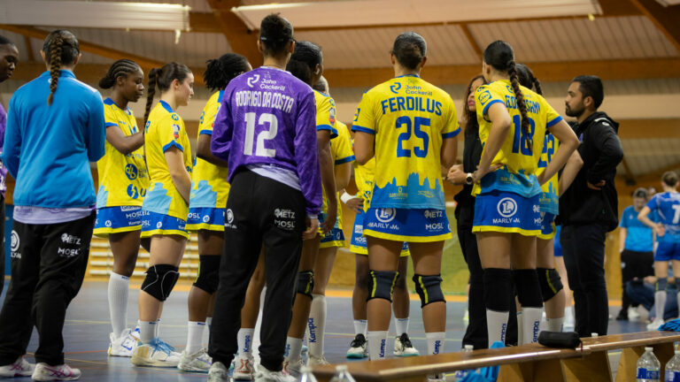1,4K L’équipe N1F de Metz Handball se déplaçait à Rosières St-Julien pour le dernier match de l’année 2024 ce samedi. C’est fait, l’équipe de Nationale 1 Féminine (N1F) de Metz Handball passera l’hiver au chaud avec une première place assurée suite à la victoire face à Rosières St-Julien ce samedi. Après leur dernière victoire de l’année à domicile, les jeunes Dragonnes ont fait honneur à leur dernier déplacement. Dans un match qui aurait pu être un véritable piège, car disputé sans résine, les protégées de Nina Kanto ont préservé leur invincibilité. La parade de Fatima Camara après 47 secondes de jeu a donné le ton : la coupure hivernale allait devoir attendre encore 60 minutes. Après une quinzaine de minutes peu prolifiques offensivement de part et d’autre (6-6, 11ème), ce sont pourtant les locales qui prenaient les devants dans la rencontre. Il n’en fallait pas plus pour réveiller Nelya Goval et Yvana Atangana, à l’initiative de trois buts en une minute pour remettre les jaunes et bleues sur de bons rails. Claire Koestner enfonçait le clou quelques instants plus tard (8-9, 20ème). Une suspension pour deux minutes de Délia Golvet offrait à Rosières l’opportunité de se refaire mais trois tirs manqués consécutivement laissaient les ambitions au placard. Les messines profitaient alors de la fin de période pour creuser l’écart.Mi-temps : 12-17 L’entame du second acte voyait les jeunes Dragonnes gérer leur avance. Le +5 tenait bon malgré les changements sur le terrain. Elea Ferdilus, Marie-Eve Holler, Clémence Castets ou encore Anais Ababsa trouvaient les filets tandis qu’Elihannah Rodrigo da Costa réalisait ses premières parades du jour. Sachant la situation maitrisée, Nina Kanto offrait même quelques minutes à sa troisième gardienne, Lilou Isabelinho qui terminait le match sur deux parades alors qu’Ivana Atangana, inscrivait le dernier but de la partie.Score final de ce Rosières St-Julien – Metz Handball : 27 – 32 Les jeunes Dragonnes sont donc premières et invaincues au terme de cette première phase de championnat N1F. En 2025, elles tenteront de conquérir une dixième victoire avec la réception de Villemomble le 11 janvier, une équipe qui avait su les surprendre la saison passée… Les stats de la rencontre Metz HandballCamara (10 parades), Rodrigo da Costa (3 parades), Isabelinho (2 parades)Ababsa (1 but sur 1 tir), Atangana (6/10), Castets (2/3), Etilopy (0/2), Ferdilus (2/4), Giliberto (1/1), Golvet (2/6), Goval (4/4), Holler (2/2), Kaakil-Talaba (1/3), Koestner (11/13). Rosieres St-JulienCossard (3 parades), Nairi (9 parades)Dadou-Drion (3/7), De Kanel (1/1), Diakhon (2/2), Duquesnoy, Hassine (2/4), Helaoui (4/10), Lambert (0/2), Mehdi Rejeb Sfar (3/4), Ngavouka (1/7), Simonnet (7/8), Thiri (4/4). Crédit photo : Julien Buret (archives)
