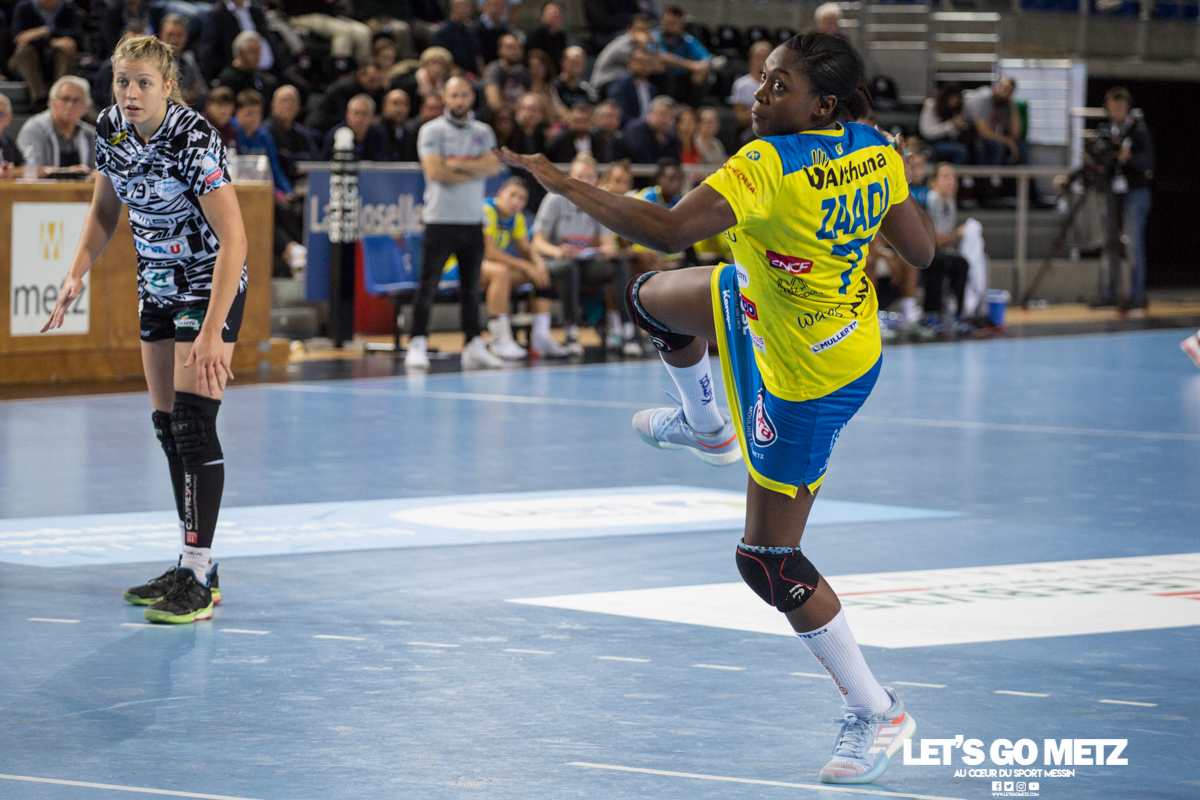 331 Mercredi, les Arènes de Metz retrouvaient la Ligue Butagaz Énergie, 6 semaines après avoir reçu la JDA Dijon, le 1er Septembre dernier. Pour le compte de la 7ème journée, le Metz Handball recevait l’ESBF Besançon, actuel 9ème du championnat. Avec cette rencontre, les Dragonnes comptaient évidemment poursuivre leur dynamique positive et confirmer l’état d’esprit et d’engagement entrevu contre Podravka Vegeta, 3 jours plus tôt. Devant les caméras de Sport en France et les 3015 spectateurs ayant fait le déplacement, elles s’imposent finalement 28 à 24 à l’issue d’un match très musclé. Une sérieuse entame de match gâchée par un manque de réalisme Malgré le retour des 3 internationales françaises (Laura Flippes, Laura Glauser et Orlane Kanor) Emmanuel Mayonnade décide de débuter la rencontre avec Ivana Kapitanovic dans les buts, Méline Nocandy sur le côté gauche et Ailly Luciano à l’aile droite. S’ajoutent à ces trois joueuses, Olga Perederiy, Louise Burgaard, Grâce Zaadi et Manon Houette. Comme dimanche, les Messines donnent le coup d’envoi et Olga Perederiy ne tarde pas à ouvrir la marque de cette rencontre malgré toutes les tentatives d’encerclement des Bisontines. La pivot ukrainienne peut déjà commencer son festival offensif. Les Bisontines veulent répondre à leurs rivales du jour mais Line Uno Jensen et Lara Gonzalez laissent passer cette opportunité coup sur coup et permettent à Metz de faire le break au bout de 2′ de jeu. Après les 2 tentatives infructueuses de ses coéquipières, Alizée Frécon parvient à tromper Ivana Kapitanovic et lance enfin le match de Besançon. Malgré tout, elles ne profitent pas de ce poteau de Ailly Luciano et concèdent même un jet de 7m avec une faute défensive sur Olga Perederiy très en vue en ce début de rencontre. Marie-Hélène Sajka ne tremble pas comme à son habitude et conclut ce 7m pour permettre à Metz de garder un avantage de 2 buts. Besançon ne compte pas se faire distancer si rapidement et provoque une faute sur Ailly Luciano qui leur permet d’obtenir un jet de 7 mètres. Laura Glauser fait alors son retour sur les terrains pour tenter de repousser le tir de Marine Dupuis. La portière messine aurait pu faire une entrée remarquée mais le ballon rebondit sur son doigt pour finalement entrer dans le but. Dupuis exulte et permet à Besançon de rester au contact des Dragonnes (3-2, 5′). Les 5 prochaines minutes voient des Messines dominatrices dans tous les secteurs de jeu (7-3, 10′). À partir de ce moment là, nous pouvions penser que Metz retrouvait son handball pour se détacher comme pour les 6 dernières journées. Malheureusement une mauvaise passe et un but arrêté donnent le ton sur la physionomie future du match messin et les Bisontines parviennent à revenir à -1 puis à l’égalisation. Orlane Kanor fait son entrée à la 16´mais manque encore de rythme, son mauvais placement permet à l’ESBF de récupérer un tir de Grâce Zaadi pour revenir à hauteur (9-9). Les Bisontines sont très appliquées en défense et vives en contre-attaques sur les maladresses Messines. L’égalisation de Ilona Kieffer pousse le technicien Lorrain à poser son temps mort afin de retrouver une constance appliquée. Malheureusement, les Mosellanes continuent à perdre des balles et se font punir par des Bisontines plus réalistes qui ont vaillamment inversé la tendance depuis la 11ème minute du match (11-12, 22′). Comme souvent lorsque son équipe vacille, Ivana Kapitanovic se mue en rempart infranchissable, ce qui la rend très précieuse en cette fin de première mi-temps (8 arrêts). Héroïque, elle effectue une fabuleuse parade sur une balle de kung-fu attrapée par Alizée Frécon. La grande forme de la gardienne Croate permet à Metz de repartir au vestiaire avec 2 buts d’avance (14-12, 30′). Une seconde mi-temps irrespirable avec des individualités qui se démarquent La seconde période ne laisse aucun répit aux nerfs des spectateurs. Une vraie bataille se poursuit et Besançon n’est pas prêt à baisser les armes face aux Messines. D’entrée, le spectacle est au rendez-vous avec un kung-fu Frécon/Jensen, réussi cette fois. Luciano ne compte pas rééditer les erreurs de la 1ère période et distance Besançon par un décalage astucieux de Zaadi. Les Doubistes restent aussi imperturbables que leur célèbre citadelle et reviennent à hauteur avant que l’éclair de génie ne vienne du côté de Burgaard pour montrer la voie à ses coéquipières « jaune et bleu » après avoir eu des difficultés à revenir dans son match (16-15, 36′). Ce match devient irrespirable et très tendu jusqu’aux décisions arbitrales qui ne parviennent pas à se mettre au niveau du jeu. Cela ne déboussole en aucun Olga Perederiy qui offre toute une palette de buts avec un réalisme sans appel dos aux cages avec une vitesse de rotation impressionnante , elle en est à son 7ème but de la soirée (20-19, 41′). Malgré tout, l’impact physique fait complètement déjouer les Dragonnes : tout le monde assiste de nouveau à un manque de concentration et de justesse dans les passes, une défense trop perméable, des pertes de balle à répétition (12 au total), des distributions de balles très approximatives et une apathie étonnante face à l’efficacité de la jeune Roxanne Frank dans ses buts. Les Messines ne profitent jamais des fautes techniques de leurs adversaires pour creuser l’écart. Les 6 dernières minutes sont très importantes pour Metz qui se montre beaucoup plus agressif : un jet de 7m de la capitaine aura sonné la révolte et Ivana Kapitanovic retrouve sa solidité au moment le plus opportun. Les Franc-Comtoises semblent se fatiguer et reculer devant l’accélération locale. Une mauvaise gestion commence à se ressentir et les rivales ne parviennent plus à accrocher les joueuses de Emmanuel Mayonnade qui infligent un rude 4-0 (28-22, 59