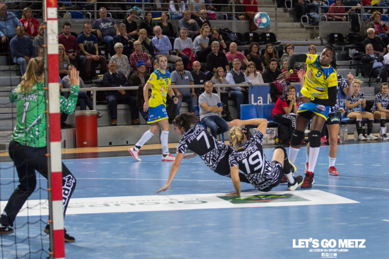 303 Mercredi, les Arènes de Metz retrouvaient la Ligue Butagaz Énergie, 6 semaines après avoir reçu la JDA Dijon, le 1er Septembre dernier. Pour le compte de la 7ème journée, le Metz Handball recevait l’ESBF Besançon, actuel 9ème du championnat. Avec cette rencontre, les Dragonnes comptaient évidemment poursuivre leur dynamique positive et confirmer l’état d’esprit et d’engagement entrevu contre Podravka Vegeta, 3 jours plus tôt. Devant les caméras de Sport en France et les 3015 spectateurs ayant fait le déplacement, elles s’imposent finalement 28 à 24 à l’issue d’un match très musclé. Une sérieuse entame de match gâchée par un manque de réalisme Malgré le retour des 3 internationales françaises (Laura Flippes, Laura Glauser et Orlane Kanor) Emmanuel Mayonnade décide de débuter la rencontre avec Ivana Kapitanovic dans les buts, Méline Nocandy sur le côté gauche et Ailly Luciano à l’aile droite. S’ajoutent à ces trois joueuses, Olga Perederiy, Louise Burgaard, Grâce Zaadi et Manon Houette. Comme dimanche, les Messines donnent le coup d’envoi et Olga Perederiy ne tarde pas à ouvrir la marque de cette rencontre malgré toutes les tentatives d’encerclement des Bisontines. La pivot ukrainienne peut déjà commencer son festival offensif. Les Bisontines veulent répondre à leurs rivales du jour mais Line Uno Jensen et Lara Gonzalez laissent passer cette opportunité coup sur coup et permettent à Metz de faire le break au bout de 2′ de jeu. Après les 2 tentatives infructueuses de ses coéquipières, Alizée Frécon parvient à tromper Ivana Kapitanovic et lance enfin le match de Besançon. Malgré tout, elles ne profitent pas de ce poteau de Ailly Luciano et concèdent même un jet de 7m avec une faute défensive sur Olga Perederiy très en vue en ce début de rencontre. Marie-Hélène Sajka ne tremble pas comme à son habitude et conclut ce 7m pour permettre à Metz de garder un avantage de 2 buts. Besançon ne compte pas se faire distancer si rapidement et provoque une faute sur Ailly Luciano qui leur permet d’obtenir un jet de 7 mètres. Laura Glauser fait alors son retour sur les terrains pour tenter de repousser le tir de Marine Dupuis. La portière messine aurait pu faire une entrée remarquée mais le ballon rebondit sur son doigt pour finalement entrer dans le but. Dupuis exulte et permet à Besançon de rester au contact des Dragonnes (3-2, 5′). Les 5 prochaines minutes voient des Messines dominatrices dans tous les secteurs de jeu (7-3, 10′). À partir de ce moment là, nous pouvions penser que Metz retrouvait son handball pour se détacher comme pour les 6 dernières journées. Malheureusement une mauvaise passe et un but arrêté donnent le ton sur la physionomie future du match messin et les Bisontines parviennent à revenir à -1 puis à l’égalisation. Orlane Kanor fait son entrée à la 16´mais manque encore de rythme, son mauvais placement permet à l’ESBF de récupérer un tir de Grâce Zaadi pour revenir à hauteur (9-9). Les Bisontines sont très appliquées en défense et vives en contre-attaques sur les maladresses Messines. L’égalisation de Ilona Kieffer pousse le technicien Lorrain à poser son temps mort afin de retrouver une constance appliquée. Malheureusement, les Mosellanes continuent à perdre des balles et se font punir par des Bisontines plus réalistes qui ont vaillamment inversé la tendance depuis la 11ème minute du match (11-12, 22′). Comme souvent lorsque son équipe vacille, Ivana Kapitanovic se mue en rempart infranchissable, ce qui la rend très précieuse en cette fin de première mi-temps (8 arrêts). Héroïque, elle effectue une fabuleuse parade sur une balle de kung-fu attrapée par Alizée Frécon. La grande forme de la gardienne Croate permet à Metz de repartir au vestiaire avec 2 buts d’avance (14-12, 30′). Une seconde mi-temps irrespirable avec des individualités qui se démarquent La seconde période ne laisse aucun répit aux nerfs des spectateurs. Une vraie bataille se poursuit et Besançon n’est pas prêt à baisser les armes face aux Messines. D’entrée, le spectacle est au rendez-vous avec un kung-fu Frécon/Jensen, réussi cette fois. Luciano ne compte pas rééditer les erreurs de la 1ère période et distance Besançon par un décalage astucieux de Zaadi. Les Doubistes restent aussi imperturbables que leur célèbre citadelle et reviennent à hauteur avant que l’éclair de génie ne vienne du côté de Burgaard pour montrer la voie à ses coéquipières « jaune et bleu » après avoir eu des difficultés à revenir dans son match (16-15, 36′). Ce match devient irrespirable et très tendu jusqu’aux décisions arbitrales qui ne parviennent pas à se mettre au niveau du jeu. Cela ne déboussole en aucun Olga Perederiy qui offre toute une palette de buts avec un réalisme sans appel dos aux cages avec une vitesse de rotation impressionnante , elle en est à son 7ème but de la soirée (20-19, 41′). Malgré tout, l’impact physique fait complètement déjouer les Dragonnes : tout le monde assiste de nouveau à un manque de concentration et de justesse dans les passes, une défense trop perméable, des pertes de balle à répétition (12 au total), des distributions de balles très approximatives et une apathie étonnante face à l’efficacité de la jeune Roxanne Frank dans ses buts. Les Messines ne profitent jamais des fautes techniques de leurs adversaires pour creuser l’écart. Les 6 dernières minutes sont très importantes pour Metz qui se montre beaucoup plus agressif : un jet de 7m de la capitaine aura sonné la révolte et Ivana Kapitanovic retrouve sa solidité au moment le plus opportun. Les Franc-Comtoises semblent se fatiguer et reculer devant l’accélération locale. Une mauvaise gestion commence à se ressentir et les rivales ne parviennent plus à accrocher les joueuses de Emmanuel Mayonnade qui infligent un rude 4-0 (28-22, 59