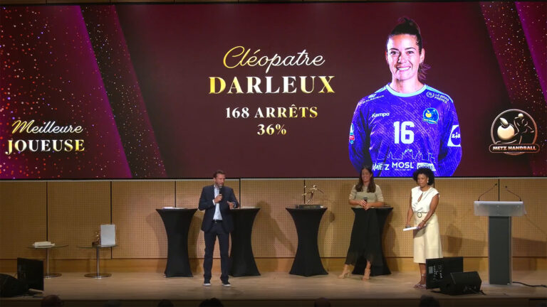 1,4K Metz Handball était fortement attendu à la cérémonie des trophées LFH et a finalement remporté huit récompenses. C’était attendu, c’est désormais officiel. Au terme d’une saison où Metz Handball s’est montré intraitable sur le plan national, il semblait évident que les Dragonnes remporteraient une bonne partie des trophées individuels décernés par la Ligue Féminine de Handball. Apparaissant à douze reprises sur dix catégories, Metz Handball, a finalement remporté huit trophées. Détail du palmarès : Meilleur entraîneur de LBE : Emmanuel Mayonnade Meilleure demi-centre de LBE : Petra Vamos Meilleure arrière droite de LBE : Laura Flippes Meilleure ailière droite de LBE : Lucie Granier Plus beau but de la saison : Lucie Granier Meilleure pivot de LBE : Sarah Bouktit Meilleure gardienne de LBE : Cléopâtre Darleux Meilleure joueuse de LBE : Cléopâtre Darleux Avec ce format de cérémonie, la LFH a tenté d’innover. La saison passée les trophées avaient été remis à l’occasion de la conférence de presse de rentrée, en septembre. En organisant l’évènement au cœur du mois de juin, la Ligue s’est privée de la présence de nombreuses joueuses qui profitent actuellement de vacances après la fin de toutes les compétitions. La récolte n’en est pas moins belle pour Metz Handball qui est toujours une entité remarquée de ces remises de trophées LFH.