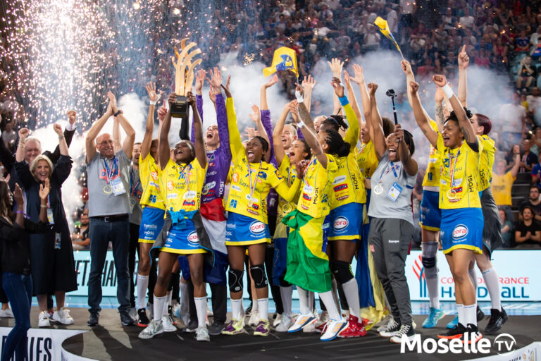 373 Comme en 2019, Metz Handball réalise le doublé Championnat – Coupe de France. Grâce à leur succès 33-23 contre Besançon à Bercy, les Dragonnes ont glané leur 10ème coupe nationale. Découvrez les réactions de Laura Kanor, Tamara Horacek, Emmanuel Mayonnade, Méline Nocandy et Mélanie Halter. Metz Handball a tout raflé sur la scène nationale. Au terme d’une saison historique, marquée par une invincibilité en Ligue Butagaz Energie – avec 26 victoires en 26 matchs – les Dragonnes ont remporté la Coupe de France. Un succès 33-23 et une finale maîtrisée de bout en bout contre Besançon. Laura Kanor « On a essayé de faire le taf du début jusqu’à la fin. On savait que l’on devait vite switcher sur cette finale de Coupe de France. C’est la meilleure saison de Metz Handball depuis une décennie, je crois. On peut presque parler de triplé avec la médaille en Ligue des Champions. Notre but était de marquer l’histoire du club (…) Mon dernier match avec Orlane ? En arrivant à la salle, j’y ai pensé… C’étaient nos dernières ! Elle m’a fait des passes à l’aile, c’était extraordinaire ça (Rires) ! » Tamara Horacek « C’est juste extraordinaire de finir une saison comme cela. L’enchainement entre la finale de championnat, le Final 4 de Ligue des Champions et la finale de Coupe de France n’était pas facile. Mais on ne pouvait pas rêver mieux comme conclusion. On a su se reconcentrer sur cette finale que l’on n’a pas joué avec le corps, mais avec la tête et les tripes. C’était facile de se motiver pour une finale à Bercy (…) Mon carton rouge ? C’est pas grave, ça arrive. Ce n’est que mon premier rouge en carrière. J’ai joué avec le feu mais c’était totalement involontaire, je me suis excusée. Mon équipe a gagné et j’ai le sourire. Je ne me casse pas la tête avec ce carton rouge. » Méline Nocandy « Aucune frustration de ne pas avoir pu jouer ce soir, je savais que les filles allaient faire le boulot. On a fait une saison historique, la meilleure de Metz Handball. En plus, j’étais la capitaine de ce groupe, je suis extrêmement heureuse. J’ai parlé avec le président pendant tout le match, on s’est remémoré toutes nos victoires. On part la tête haute. J’ai réussi à aller chercher tout ce que je voulais à Metz Handball. Quand on signe un contrat à Metz Handball, on veut absolument gagner tout le temps (…) Je te promets que mon équipe déteste la défaite. Même à l’entraînement, dès qu’on perd un vieux jeu de merde, ça se passe très mal. Je te promets qu’on n’allait pas lâcher l’affaire comme ça (sic). Après le Final 4, on a vite switché sur cette finale. » Emmanuel Mayonnade « Ce soir, je suis super content. J’étais soulagé après la finale contre Brest. Au Final 4, on prend une claque en demi-finale et on réussit à finir sur une victoire en petite finale. On s’est permis de fêter cette médaille avec nos supporters, même très tard dans la nuit. C’est le seul moment festif qu’on s’est octroyé dans l’année. Il ne fallait pas le regretter aujourd’hui. On devait donc montrer que l’on pouvait faire une finale de Coupe qualitative (…) J’ai une énorme pensée pour les filles qui vont partir après le match et qui ont marqué ce club. Cette 10ème Coupe de France était très importante pour nous, pour clôturer un beau chapitre de Metz Handball. On ne voulait pas se reprocher d’avoir eu cette communion avec les supporters. C’est notre saison la plus aboutie. » Mélanie Halter « C’est juste incroyable, un doublé pour une première saison avec les pros. Pour un début, franchement c’est pas mal (Rires) ! Si j’ai réussi à me mettre au niveau de l’équipe ? Je n’ai pas eu trop le choix. Quand tu arrives dans un tel collectif, tu donnes tout. Que tu rentres ou non, tu te dois d’être toujours présente. C’est ce que j’ai essayé de faire au mieux cette saison. J’ai essayé de jouer avec du plaisir, de tout donner pour ne rien regretter. Comme tout le monde joue avec cette mentalité, on parvient à gagner. Les victoires appellent les victoires et ainsi de suite… On a envie de refaire une saison pareille l’année prochaine ! » Crédit photo : Matthieu Henkinet (Moselle TV)