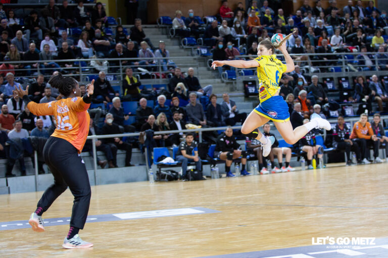473 La belle série se poursuit pour Metz Handball face à Fleury ! Les Dragonnes n’ont pas raté leur interrogation et se sont imposées 40-29 à domicile. Ca fait 20/20 en Ligue Butagaz Energie pour les Jaunes et Bleues. Retour au pain quotidien pour Metz Handball. Sur leur nuage après leur qualification au Final 4 de la Ligue des Champions, les Dragonnes recevaient Fleury, bon dernier de Ligue Butagaz Energie, ce mercredi aux Arènes. Emmanuel Mayonnade devait composer une nouvelle fois sans Bruna De Paula mais également sans Méline Nocandy, laissée au repos.Bouktit lançait les hostilités, ouvrant le score contre son ancienne équipe. Cardoso l’imitait quelques instants plus tard avant que Mélanie Halter, qui fêtait sa première titularisation avec les pros, n’effectue son premier arrêt de la soirée. Si Ekoh maintenait les Fleuryssoises dans la partie, Orlane Kanor réalisait elle aussi une grosse entame de match (10-8, 15’).Les Dragonnes allaient prendre jusqu’à 6 buts d’avance grâce au bon passage de Tamara Horacek. Mélanie Halter se montrait elle toujours impeccable dans la cage. Quant à Orlane Kanor, elle poursuivait son festival en attaque. Metz Handball regagnait les vestiaires avec une avance de 18-14 à la pause. Les Dragonnes en gestion Comme en première période, Tamara Horacek scorait et dictait le tempo messin. Côté Fleury, Julie Le Blévec, prêtée par Metz Handball, répondait à son adversaire directe Laura Kanor. Mélanie Halter franchissait quant à elle la barre des 10 arrêts. Chloé Valentini et Emma Jacques en profitaient pour se régaler sur grand espace (28-22, 45’).L’écart était fait, Zaadi et Valentini offraient alors aux 1867 spectateurs des Arènes un superbe kung fu. Showtime ! Les Dragonnes géraient tranquillement leur avance dans les dix dernières minutes de la rencontre, malgré l’agacement du perfectionniste Emmanuel Mayonnade, qui aurait souhaité voir son équipe encaisser moins de buts. Orlane Kanor en profitait néanmoins pour faire grimper son compteur et terminer meilleure buteuse de la partie.Score final 40-29 pour Metz Handball, qui n’aura fait qu’une bouchée de son modeste adversaire du soir, Fleury. Les Dragonnes signent leur 20ème succès en autant de matchs de Ligue Butagaz Energie. Metz Handball 40-29 Fleury Metz HandballHalter (15 arrêts / 44 tirs)Valentini (5 buts / 5 tirs), Zaadi (0/1), N’Gouan (2/2), Horacek (7/8), Bont (1/1), O.Kanor (8/10), Burgaard (0/2), L.Kanor (4/5), Jacques (5/7), Bouktit (6/6), Cardoso (2/3)FleuryVind (3 arrêts / 30 tirs), Toubissa (0/13)Gassama (1 but / 1 tir), Agathe (1/4), Chambonnier (5/8), Le Blévec (3/3), Perez Buforn (2/3), Techer (3/9), Peillon (3/4), Rizo Gomez (3/4), Mumbongo (3/6), Ekoh (5/9) Crédit photo : Julien Buret/LGM