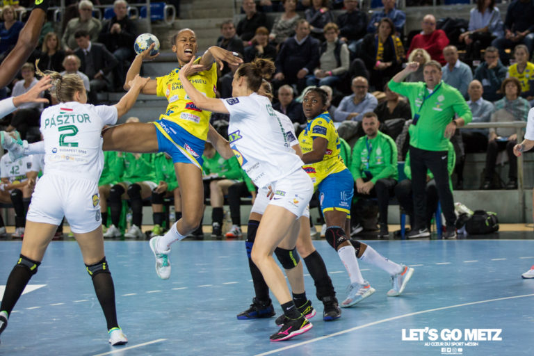 353 Ce samedi 16 novembre, le Metz Handball accueillait la dernière rencontre de la phase préliminaire de la Ligue des Champions. Déjà qualifiées pour le tour principal et premières de leur groupe, les protégées d’Emmanuel Mayonnade avaient à cœur d’enfoncer le clou et de terminer avec 7 points au compteur face au FTC Rail Cargo Hungaria avant d’entamer le tour principal. Tout ne s’est pas passé comme prévu pour les jaunes et bleues… Bien que certaines de finir cette phase de Champions League à la première place, les Messines sont animées par une soif de victoire insatiable. Véritable marque de fabrique de la maison Jaune et Bleue. Ainsi, que cela soit au niveau de l’équipe composée pour le match ou lors de l’entrée des joueuses sur le terrain pour l’échauffement, on ne perçoit aucun relâchement. Les visages sont fermés et la concentration palpable. Beaucoup des joueuses présentes aspirent à des échéances majeures en équipe nationale lors de la trêve qui débutera bientôt, pourtant dans les esprits seuls le match de ce soir importe afin de préserver l’invincibilité et continuer à faire tomber des records… Du côté Hongrois, cette rencontre est plus anodine et le coach ne s’en cache pas : le FTC Rail Cargo est venu à Metz avec pour seule ambition de réaliser un bon match de handball. Pourtant, avec l’intensité que l’on connait à cette équipe, toutes les surprises sont possibles… Première mi-temps : Le premier sept aligné par Emmanuel Mayonnade se compose d’Ivana Kapitanovic, Grâce Zaadi la capitaine, Manon Houette, Marie-Hélène Sajka, Orlane Kanor, Astride N’Gouan et Jurswailly Luciano. A noter ce soir la présence dans le groupe des jeunes Julie Le Blevec et Sarah Bouktit. C’est la hongroise Nadine Schatzl qui ouvre le score, et qui le double une minute plus tard. Le ton est rapidement donné côté Hongrois. Les Dragonnes peinent à poser leur jeu dans ce début de période. De son côté, le public messin lutte lui aussi et donne de la voix pour répondre à la centaine d’ultras venus de Budapest pour encourager le FTC. Ambiance des grands soirs aux arènes ce Samedi. Pourtant sur le parquet, il faut attendre la 5ème minute de jeu pour voir Manon Houette débloquer le compteur des Dragonnes, qui démarrent ce match en grande difficulté. On sent assez tôt un plan de jeu qui vise à chercher Astride N’Gouan en jouant sur un mismatch au poste de pivot, mais aucune balle ne lui parvient convenablement. Le premier temps mort est rapidement posé et le coach Mayonnade bouscule son effectif pour changer la donne. Alors menées 1-6, les Messines s’appuient sur Olga Perederiy pour tenter de sonner la révolte et réduisent la marque avant qu’Orlane Kanor ne soit temporairement exclue. Réduites à 6, les Dragonnes réussissent pourtant à marquer à nouveau par l’intermédiaire de Méline Nocandy, mais ce soir la défense Hongroise est bien en place et les Messines manquent de précision dans le dernier geste. Heureusement, Manon Houette est en forme, à l’instar de Jurswailly Luciano. Malgré un premier jet de 7 mètres loupé par Marie-Hélène Sajka, les Messines semblent recoller à 6-8. Mais Blanka Biro se dresse face à cette remontée et multiplie les arrêts de grande classe du côté de Budapest, et le score passe à 8-12 à 5 minutes de la mi-temps. Les approximations s’enchaînent, tout comme les décisions arbitrales qui font hurler les supporters jaunes et bleus. Le match est très musclé, et au jeu des mauvais gestes les hongroises sont également largement devant les messines. C’est la mi-temps et les visiteuses mènent 10-14, portées par une Nadine Schatzl infernale qui a déjà inscrit 5 buts. Deuxième mi-temps : Après avoir testé toutes les combinaisons possibles en première période, Emmanuel Mayonnade a décidé de démarrer la seconde période avec Marion Maubon, Méline Nocandy, Jurswailly Luciano, Louise Burgaard, Grâce Zaadi, Olga Perederiy et Ivana Kapitanovic. Les 4218 spectateurs présents font trembler les arènes mais ce début de seconde période ressemble beaucoup à la fin de la première. Bien que revenues sur le terrain avec de l’énergie, trop d’imprécisions, et une agressivité parfois mal contrôlée font que les Dragonnes sont clairement dominées aussi bien sur le plan tactique que physique. Les Hongroises quant à elles sont en pleine réussite et l’écart passe à + 5 au bout de la 10ème minute, 14-19. Grâce Zaadi s’acharne pour prendre le match à son compte comme souvent dans les moments difficiles, avec un leadership et une attitude conquérante, mais les joueuses de Budapest ne lâchent absolument rien. Astride N’Gouan réduit l’écart à 18-21 au quart d’heure et Kapitanovic parvient à élever son niveau de jeu au moment opportun et effectue un arrêt décisif avant que N’Gouan réduise à nouveau l’écart à 19-21. + 2 pour les visiteuses, et il ne reste déjà plus que 10 minutes à jouer. Il y a énormément d’électricité dans l’air et Astride N’Gouan se fait attraper par la brigade. 2 minutes d’exclusion sous les contestations du public. Mais les Messines ont du cœur et Grâce Zaadi, encore elle, propulse son jet de 7 mètres au fond des filets Hongrois. Plus qu’un but d’écart à 8 minutes du terme de la rencontre, et les bénévoles commencent à distribuer des défibrillateurs dans les gradins. Le suspense est insoutenable alors que les jaunes et bleues asphyxient enfin les Hongroises. Manon Houette égalise mais les joueuses de Budapest sont décidément intraitables ce soir et reprennent l’avantage.21-22. Il reste 3 minutes. Louise Burgaard égalise à nouveau mais les Hongroises repassent encore devant. Le public se met debout pour accompagner les Dragonnes jusqu’au bout du suspense. Il ne reste qu’une minute à jouer quand les messines passent devant pour la première fois du match, nous sommes