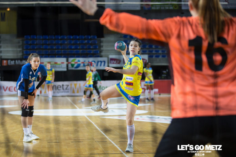 338 C’est un beau dimanche de handball qui se profilait aux Arènes de Metz. En lever de rideau des professionnelles, la réserve de Metz Handball était mise à l’honneur dans un match face à la réserve du JDA Dijon. Pour rappel, les deux équipes évoluent en Nationale 1, troisième échelon du handball français. Première mi-temps Les jeunes Dragonnes débutent timidement la rencontre, sans doute impressionnées par la grandeur de la salle. La pivot Sarah Bouktit se met toutefois rapidement en avant en concluant deux jolis mouvements collectifs. La capitaine Laura Portes, habituée des lieux avec l’équipe professionnelle, se distingue avec plusieurs parades et permet à ses coéquipières de prendre une avance de 3 buts. 6-3 Après deux premières minutes pour se mettre en route, Metz Handball a rapidement mis la main sur la rencontre et l’avance est déjà portée 7 buts au bout de 15 minutes de jeu grâce à l’ailière Julie Le Blevec. 12-5 Laura Portes continue son festival et va même s’offrir le luxe d’inscrire un but longue distance dans la cage dijonnaise, laissée vide lors d’une attaque sans gardienne. Devant l’impuissance de ses joueuses face à la machine messine, l’entraîneur de la JDA Dijon prend son premier temps-mort. 16-7 La jeune garde de Metz déroule son handball et passe la barre symbolique des 20 buts avant même la fin du premier acte. Les deux équipes rentrent finalement aux vestiaires avec un score de 22-11 à l’avantage de Metz Handball. Deuxième mi-temps Les 14 actrices reviennent sur le parquet avec un changement dans la cage. Après une première mi-temps exceptionnelle, Laura Portes est mise au repos par son entraîneur, en prévision du match des Dragonnes plus tard dans l’après-midi. Elle est remplacée par Mélanie Halter. Cela n’entame pas la marche en avant des Dragonnes qui maintiennent leur avance au-delà de la dizaine de buts après 10 minutes disputées dans le second acte. 28-16 Mélanie Halter montre qu’elle n’est pas sur le terrain par hasard en cette deuxième période puisqu’elle multiplie les arrêts ! Les jeunes messines déroulent et régalent même leur public avec un kung fu superbement conclu par Audrey Dembele ! 33-19 La fin de rencontre ne sera qu’une formalité et les filles de Clément Alcacer continuent leur marche en avant dans cette Poule 3 de Nationale 1 avec une brillante victoire 38-26 face à la réserve de la JDA Dijon et confirment avec la manière leur première place au classement. Crédit photo : Matthieu Henkinet