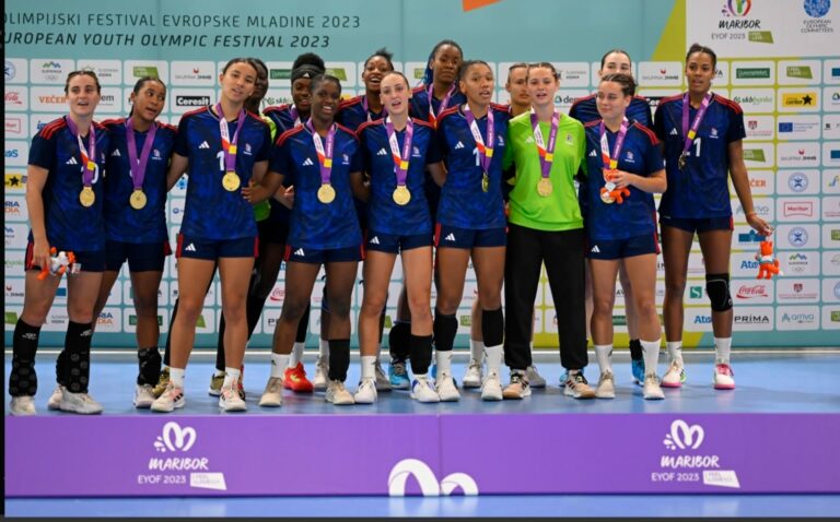 642 Samedi, l’Equipe de France u17 a remporté le FOJE face à la Roumanie avec Léane Gonzalez et Claire Koestner, deux jeunes pensionnaires du Metz Handball. Après le championnat d’Europe des moins de 19 ans, c’est au tour de la génération 2006/2007 d’être sur le pont, pour cet été 2023. Engagée pour l’Euro u17 entre le 3 et 13 Août, au Monténégro, l’Equipe de France jeune disputait le FOJE (Festival Olympique de la Jeunesse Européenne) avec, en son sein, Léane Gonzalez (gardienne en provenance de Villers) et Claire Koestner (Demi-Centre), deux membres du centre de formation de Metz Handball. La pivot Elea Ferdilus (Yutz et Pôle espoir de Metz) était également présente dans le groupe. Ce Festival est l’événement phare des jeunes athlètes âgés de 14 à 18 ans pour les préparer au plus haut niveau et surtout leur montrer les prémisses des Jeux olympiques. De fait, sport olympique, le Handball faisait partie des disciplines présentes, du 23 au 29 juillet, en Slovénie. Et quatre ans après leurs ainées de la génération Bouktit/Grandveau, les joueuses d’Olivier De Lafuente ont réitéré l’exploit de remporter un premier titre. De bons augures pour le championnat d’Europe malgré l’absence remarquée de la Hongrie. Un FOJE en toute domination Placées dans le groupe A avec l’Espagne, les Pays-Bas et la République Tchèque, les Bleuettes n’ont fait qu’une bouchée de leurs homologues durant le tour préliminaire. Elles ont facilement obtenu leur ticket pour les demi-finales en dominant les Néerlandaises (29 à 22), les Tchèques (40 à 21) et les Espagnoles (27 à 39). Arrivées en 1/2 finale, les u17 ont rapidement étouffé les Polonaises pour mener de 10 unités dès la première période avant de s’imposer 35 à 23. Le lendemain, elles ont fait face à une Roumanie tout aussi impérieuse qu’elles le long de la compétition. Cela s’est, en effet, ressenti sur le terrain lorsque les jeunes roumaines ont imposé une adversité plus coriace avec une seconde période très disputée. Finalement, les jeunes françaises ont fait preuve de caractère pour s’imposer 32 à 27. Crédit photo : EYOF Maribor 2023