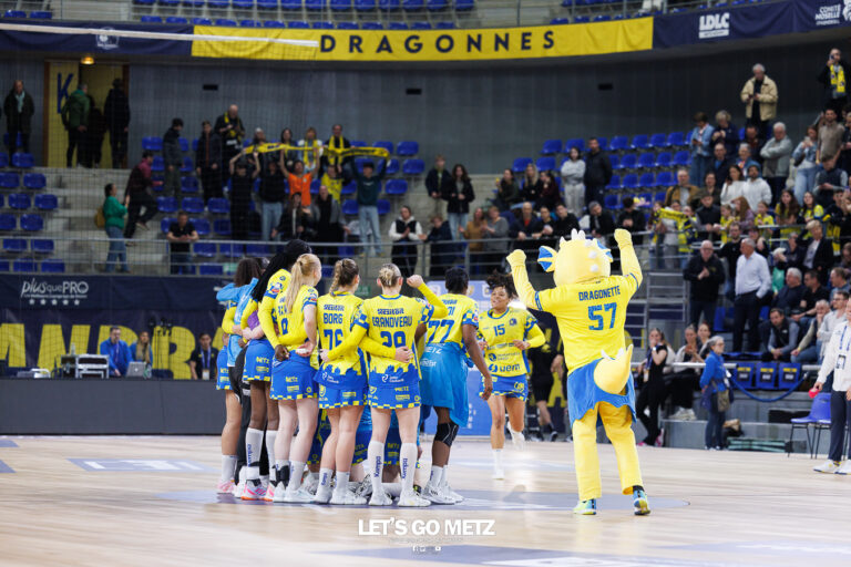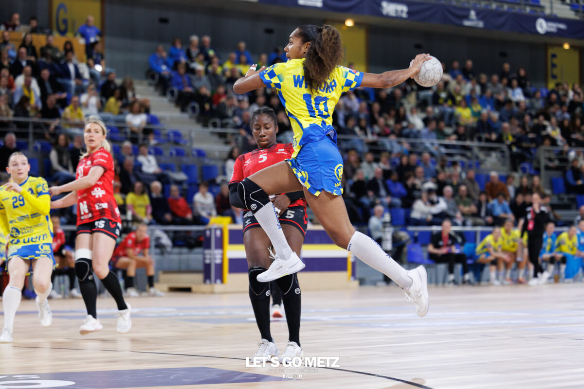 53 Après deux semaines sans match, Metz Handball s’est imposé de dix buts (33-23) face à Nice et se prépare sereinement à la Coupe de France. Si l’enchaînement des rencontres est parfois compliqué par la fatigue qui s’accumule, l’absence de compétition engendre souvent un manque de rythme. Alors que la plupart de ses adversaires en Ligue Butagaz Energie étaient sur le pont la semaine passée, Metz Handball ne s’était plus produit sur un parquet depuis son déplacement à Maubeuge le 18 mars dernier pour y défier Sambre Avesnois. Si les jours qui ont suivi ont permis de régénérer les corps et d’intégrer au mieux la revenante Grâce Zaadi, et que cette opposition face à Nice s’est soldée par une victoire large (33-23), ce succès ne fut pas linéaire. Comme souvent Sarah Bouktit lance Metz Handball Ce sont les Ayglones qui prenaient les devants d’entrée sous l’impulsion de Hanna Ahlen et Marie Fall (1-2, 4e) avant que Sarah Bouktit et Chloé Valentini ne permettent aux Jaune et Bleu de prendre trois longueurs d’avance (5-2, 8e). Metz Handball semblait lancé mais les visiteuses, bien que privées de leur meilleure artilleuse, Marie-Hélène Sajka, ne s’en laissaient pas compter. Grâce à leur capitaine Marine Dupuis, et à l’inusable Ehsan Abdelmalek, elles revenaient sur les talons des Dragonnes (7-6, 16e). C’est alors qu’Emmanuel Mayonnade procédait à des rotations, un luxe que ne pouvait se permettre son homologue azuréen qui ne pouvait compter que sur douze joueuses. Sans doute une des explications de l’écart au tableau d’affichage à l’issue des trente minutes initiales (17-10) de par la constance de sa pivot et l’efficacité de Betchaidelle Ngombélé notamment. Grâce Zaadi, comme si l’histoire ne s’était pas interrompue Une nouvelle réalisation de Sarah Bouktit lançait idéalement Metz Handball dans le second acte. C’est alors que Grâce Zaadi entrait en scène. La capitaine qui effectuait ce mercredi son retour aux Arène avec le maillot jaune et bleu sur les épaules inscrivait deux buts consécutifs et voyait Metz Handball compter neuf unités d’avance (21-12, 36e). Les championnes de France en titre semblaient lancées vers un succès large et aisé. Toutefois, les Rouge et Noir profitaient d’une baisse de régime des locales et de la précision d’Hana Ahlen, de Marine Dupuis et de Margot Le Blevec, sœur de Julie, pour revenir à cinq petites longueurs (21-16, 43e). La profondeur de banc messin a eu raison de Nice Le temps mort posé par Emmanuel Mayonnade (40e) n’avait donc pas produit d’effets immédiats mais, dès lors que les ajustements, notamment défensifs, étaient bien mis en pratique, Sabrina Novotna enchaînait les parades (7 au total), Suzanne Wajoka les interceptions qui se concluaient en contre-attaques victorieuses (4/4) et Betchaidelle Ngombele continuait à trouver la mire. Emma Rouly faisait son possible pour atténuer l’écart en inscrivant quatre buts dans les dix dernières minutes. L’avance messine est finalement de dix buts au final (33-23). Les Dragonnes peuvent désormais préparer sereinement la demi-finale de Coupe de France qui se déroulera ce samedi au Complexe Saint-Symphorien à 17 h face à Paris 92. Metz HandballBundsen (5 parades sur 15 tirs), Novotna (7/20)Valentini (Capitaine (1 but sur 1 tentative), Axner (1/4), Wajoka (4/4), Anne-Emmanuelle Augustine (1/1), Ngombele (5/7), Bouktit (9/11), Granier (3/4), Grandveau (3/5), Vamos (1/1), Borg (1/2), Zaadi (3/3), Errard (1/1).Exclusions : Ngombélé (33e), Augustine (48e) OGC Nice HandballErrin (1 parade sur 16 tirs), Colic (3/20)Rouly (5 buts pour 6 tentatives), Sy, Dupuis (5/8), Ahlen (4/9), Fall (1/2), Benezet (2/3), Pontoppidan (2/2), Semedo-Monteiro (1/5), Le Blevec (1/3), Abdelmalek (2/8)Exclusion: Benezet (55e) Crédit photos: Nicola Martino / Let’s Go Metz