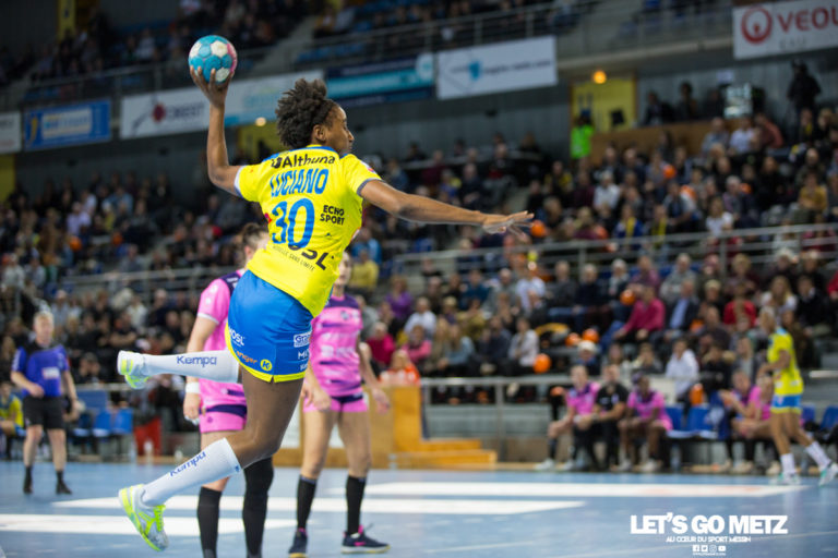 279 Les dragonnes reprenaient hier la compétition devant leur public, après une longue trêve internationale. Et pour ce premier match de la phase retour de ligue Butagaz Énergie face aux joueuses du Nantes Atlantique, les messines ont emmené les spectateurs jusqu’au bout du suspense. Retour sur ce match complètement fou… Ambiance des grands soirs lors du protocole pendant lequel Emmanuel Mayonnade et Ekaterina Andriouchina ont été mis à l’honneur pour leur médaille d’or aux championnats du monde, un « tifo » aux couleurs des Pays-Bas a même été déployé dans les tribunes. Pas de doute, les Arènes ont envie de faire la fête, sevrées de leurs vedettes depuis presque un mois. Et pas de surprise particulière pour le sept de départ aligné par Emmanuel Mayonnade : #7 Grâce Zaadi (Capitaine)#8 Laura Flippes#9 Astride N’Gouan#10 Méline Nocandy#11 Manon Houette#12 Ivana Kapitanovic#25 Marie-Hélène Sajka Après un début de match poussif de la part des deux équipes – Il faudra attendre plus de 2 minutes pour voir Laura Flippes ouvrir la marque – les Messines vont tenter de prendre l’ascendant sur leurs adversaires du jour. Manon Houette trouve le poteau sur son deuxième jet de sept mètres avant de se heurter à une excellente Adriana Placzek qui va ensuite arrêter coup sur coup les tentatives d’Astride N’Gouan puis de Laura Flippes par deux fois. Heureusement que la défense Messine est solide en ce début de match car devant, toutes les tentatives sont repoussées par le montant ou par la gardienne Nantaise. Au bout de dix minutes, le score est seulement de 2-2. La reprise semble bien difficile pour les deux équipes et le spectacle n’est pas à la hauteur des espérances du public. Et contre toute attente ce sont les protégées d’Allan Heine qui prennent les devants 4-6 à 16 minutes de jeu sur un kung-fu bien senti. Autant dire que ce n’est pas du goût d’Emmanuel Mayonnade qui demande un temps mort pour remobiliser ses troupes. Mais les dragonnes n’y sont pas et Nantes passe à + 4. Trop d’approximations, un manque flagrant de réussite et les premiers sifflets se font entendre alors qu’Olga Perederiy est exclue pour deux minutes. Louise Burgaard et Orlane Kanor sonnent la révolte et permettent aux Messines de recoller à + 3. Mais nos dragonnes sont décidément méconnaissables ce soir… La mire semble introuvable, même sur jets de 7 mètres où les montants semblent gigantesques tant ils stoppent de ballons. Comme si cela ne suffisait pas, Adriana Placzek dresse tel un mur devant les messines (10 arrêts sur 19 tirs en 1ère mi-temps) et à la pause le score est de 9 à 12 pour les joueuses de Nantes. Les 3914 spectateurs présents donnent de la voix en début de deuxième mi-temps pour pousser les dragonnes vers l’avant et espérer un meilleur rendement en attaque. Et ça commence plutôt bien avec un jet de Marie-Hélène Sajka pour revenir à 2 longueurs de Nantes, puis à une avec un nouveau but d’Astride N’Gouan. La délivrance arrivera à la 33ème minute sur l’égalisation de Marion Maubon qui va même donner l’avantage aux Messines quelques secondes plus tard. On imagine que le discours d’Emmanuel Mayonnade a dû être musclé dans les vestiaires car les joueuses du Metz Handball sont métamorphosées. Louise Burgaard puis Grâce Zaadi enfoncent le clou tandis qu’Ivana Kapitanovic enchaîne les arrêts. 38ème minute de jeu et les Messines ont repris le contrôle du match 16-14. Les visiteuses restent cependant dans le match et vont même recoller au score à la 42ème minute de jeu, 17-17. Mieux encore, elles reprennent l’avantage 17-19 sous les huées du public qui conteste certaines décisions arbitrales. C’est le moment idéal choisi par Jurswailly Luciano pour ouvrir son compteur ce soir, avant que Grâce Zaadi, la capitaine des dragonnes, n’égalise à nouveau. Mais il était écrit qu’aujourd’hui les joueuses du Nantes Atlantique ne faciliteraient pas la tâche des Messines, et c’est tout logiquement qu’elles reprennent encore une fois l’avantage à + 3 à la 49ème minute 19-22. L’ambiance devient irrespirable dans les arènes lorsque les dragonnes reviennent à nouveau dans la partie 22-22. Aucune des deux équipes ne semble prête à lâcher et les 5 dernières minutes sont stressantes comme jamais. 23-23 puis 24-24, grâce à Jurswailly Luciano par deux fois, c’est un véritable bras de fer auquel nous assistons. La dernière défense des jaunes et bleues est héroïque. Après deux tentatives repoussées par Ivana Kapitanovic, le ballon est dans les mains de Grâce Zaadi qui tergiverse, passe la balle à Orlane Kanor dont le tir subit un nouvel arrêt de la portière nantaise, il reste moins de dix secondes, les visiteuses repoussent l’attaque messine, le temps semble s’être arrêté, on se dirige vers un nouveau match nul, mais le ballon finit miraculeusement dans les mains de Jurswailly Luciano, qui s’élance et le propulse dans les filets Nantais. La foule se lève comme un seul homme et les dragonnes laissent échapper leur joie. Victoire miraculeuse, sur le buzzer !Que ce fût laborieux ! Si l’on est tenté de voir le verre à moitié plein et de savourer une victoire pleine de sens dans un match où les Messines ont su garder l’abnégation suffisante pour l’emporter sur le fil, force est de constater que les dragonnes ont fait preuve d’un cruel manque d’efficacité en attaque, car outre les 15 arrêts cumulés des deux gardiennes nantaises, c’est presque une dizaine de tirs qui ont fini leur course sur les montants adverses. Nul doute qu’en réglant un peu la mire, le score eût été bien plus élevé et la victoire plus sereine. Car la défense a quant à elle été particulièrement efficace avec notamment 14 arrêts d’Ivana Kapitanovic qui aura été comme souvent décisive et prouve une nouvelle fois qu’elle attend de pied ferme la con