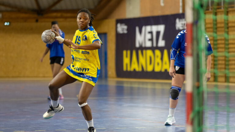 1,7K Pour le dernier match à domicile de l’année 2024 de l’équipe N1F de Metz Handball, la victoire était au rendez-vous face à Aubervilliers. C’est désormais la bonne habitude qu’ont pris les pensionnaires de l’équipe Nationale 1 Féminine (N1F) de Metz Handball : un week-end, une victoire. Confortablement installées en tête de la Poule 3 de la compétition avec sept victoires en autant de matchs et surtout après avoir écarté les concurrentes de Strasbourg Achenheim Truchtersheim la semaine passée, les jeunes Dragonnes n’ont pas relâché leurs efforts face à Aubervilliers.Privilégiant l’efficacité au suspens, les protégées de Nina Kanto mêlaient solidité défensive et efficacité dans le jeu sur grand espace pour creuser un écart conséquent dès l’entame. Si l’ex capitaine de Saint-Amand, Romane Frecon-Demouge et Asta Kante trouvaient les filets, c’est une pluie de buts qui s’abattait de toutes parts sur les visiteuses (16-02, 16ème). Profitant de remontées de balles maladroites et de replis fastidieux, les jaunes et bleues faisaient en effet parler leur vitesse d’exécution pour faire briller Elea Ferdilus, Clémence Castets, Maily Etilopy, Marie-Eve Holler ou encore Alice Giliberto.Si les joueuses d’Aubervilliers retrouvaient le chemin des buts en fin de période, l’avance messine ne cessait de croitre, jusqu’à atteindre un spectaculaire +20 à quelques secondes de la mi-temps via une réalisation de Claire Koestner.Mi-temps : 27 – 07 Le deuxième acte, dont l’issue apparaissait déjà comme décidée a vu les messines relâcher un peu plus leur jeu. Si Nina Kanto profitait de la situation pour donner du temps de jeu à ses joueuses de banc tout en proposant des schémas de jeux inhabituels, la rencontre a probablement paru trop simple aux jeunes Dragonnes, ce qui s’est traduit par un nombre accru d’erreurs et de déchets. Si la situation ne s’avérait jamais réellement dangereuse, elle poussait malgré tout la coach messine à utiliser ses temps morts (30-12, 42ème puis 30-15, 47ème) pour remettre l’équipe sur de bons rails. Au bout du compte, c’est Alice Giliberto qui inscrivait le dernier but d’une rencontre dominée par Metz Handball.Score final de ce Metz Handball – Aubervilliers en N1F : 38 – 19 Il ne reste désormais qu’un déplacement à négocier à l’équipe N1F de Metz Handball avant d’opérer une trêve jusqu’à janvier, il verra les jeunes Dragonnes se déplacer à Rosieres Saint-Julien le 23 novembre. La galerie du match Les stats de la rencontre Metz HandballCamara (3 parades), Rodrigo da Costa (3 parades)Ababsa (1 but sur 3 tirs), Atangana (2/6), Castets (5/8), Etilopy (2/4), Ferdilus (2/2), Giliberto (3/3), Golvet (5/9), Goval (6/8), Holler (4/6), Kaakil-Talaba (2/3), Koestner (6/9). AubervilliersFinck (16 parades)Abdellaoui (1 but sur 3 tirs), Ajavon, Atmaniou (0/2), Bamba (2/5), Bellakhdar (2/7), Frecon (5/7), Kante (2/3), Laissac, Mansari (1/1), Richardot (2/3), Tiramakan (1/2), Vetizout, Zedjaoui (3/5). Crédit photo : Matthieu Henkinet / Let’s Go Metz