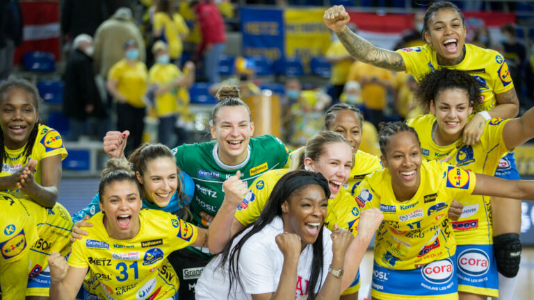 477 Avant la trêve internationale, Metz Handball recevait le promu Celles-sur-Belle. Sans vraiment dominer la première partie de la rencontre, les Dragonnes ont accéléré pour préserver leur invincibilité en championnat (38-23). Le leader et le 13ème de cet exercice 2021/2022 ne disputent pas le même championnat. Metz Handball, le premier, tente d’accrocher le haut du classement pour recevoir son dauphin en finale. Celles-sur-Belle, le second, est à la lutte pour le maintien devant Fleury (lanterne rouge) et derrière Plan de Cuques. Les 2 214 spectateurs messins présents assistaient à un duel d’opposées mais les Celloises ne comptaient pas faire figuration pour progresser et s’éloigner un peu plus des Fleuryssoises avant leurs prochaines confrontations. Le défi était de taille tant Metz Handball dompte même ses plus proches adversaires. Cette affiche avait des allures particulières pour Laura Godard et Laura Portes qui revenaient à Metz après avoir été tour à tour les capitaines de l’équipe réserve messine. Une première période âprement disputée Le scénario de cette confrontation aux apparences déséquilibrées aurait pu se dessiner dans les dix premières minutes comme ce fut souvent le cas, précédemment. Mais Celles-sur-Belle affichait de l’envie face aux vice-championnes de France. Du rythme, c’est ce qu’il y avait dans les deux camps alors que s’ensuivait des maladresses dans le jeu messin. Laura Portes ne manquait d’ailleurs pas de devenir le bourreau de Louise Burgaard. Entre mauvaises transmissions, pertes de balles et sanctions provisoires, les Messines n’étaient pas assez solidaires et Celles sur Belle en profitait pour faire le break, malgré l’impulsion donnée par Bruna de Paula et Astride N’Gouan (3-5, 8’38). Ne parvenant pas à jouer leurs partitions depuis le début du match, les Dragonnes ne paniquaient toutefois pas pour signer un 3-0 et reprenaient les devants avec une efficacité sur jet de 7m et jeu de transition. Cet assaut n’effrayait en aucun cas les Deux-Sévriennes qui tenaient la dragée haute aux locales, à l’instar de Hanna Ahlen, bien en vue durant cette première période. Au coude à coude pendant cinq minutes, les deux équipes se montraient volontaires et très joueuses. Un véritable mano à mano entre Messines et Celloises se mettaient en place sans qu’aucune des deux ne parvienne à reprendre le dessus sur l’autre. (8-8, 15’22). Mais un temps-mort de Emmanuel Mayonnade permettait à Metz Handball de se resserrer en défense. En haussant le ton, les Dragonnes récupéraient les bons ballons pour donner un coup de fouet à Celles sur Belles. Les coéquipières de Laura Portes tentaient une tactique à sept joueuses contre six pour contrecarrer les plans messins. Bon gré mal gré, la pression locale était trop importante pour tenir le rythme et Metz infligeait un 4-0 avant de rejoindre le vestiaire. Le plus gros écart depuis le début (15-11, 30′). Un retour de vestiaire à sens unique En revenant de sa pause, Metz Handball poursuivait la dynamique entrevue en fin de première période. Tamara Horacek et ses coéquipières avaient la volonté d’asseoir leur supériorité en leur royaume. Proposant des systèmes défensifs versatiles, les Messines ne laissaient aucun espoir aux visiteuses. Les Celloises ne remportaient aucun duel face au mur lorrain. Emmené par les parades de Ivana Kapitanovic et les courses rapides des ailières dont Chloé Valentini signant un triplé en moins de trois minutes, le vice-champion de France ne diminuait plus son intensité. A l’orée de la 45ème, Adriana Cardoso sonnait certainement déjà le glas en atteignant un écart de 10 buts (28-18, 43’28). Le manque de rotation sur le banc de Celles sur Belle se faisait ressentir. Le combat physique était perdu par rapport à des Messines rompues aux joutes internationales et européennes. Le dernier quart d’heure pouvait paraître long pour les joueuses de Thierry Vincent malgré une combativité palpable sur le terrain. Mais bien démunies devant le rouleau compresseur messin, elles ne pouvaient s’appuyer néanmoins que sur des exploits individuels pour exister à l’image de la Serbe Dijana Stevin, meilleur marqueuse du groupe cellois ou Joana Da Costa. Ces efforts étaient insuffisants avec des Messines affolant les compteurs devant leur public qui voyait dix buts convertis contre trois chez les concurrentes, durant les 15 dernières minutes. Dans une lutte opposant deux univers, le groupe messin a pu entièrement participer à la fête. Il repartait hier avec un 16ème succès en autant de rencontres avec la satisfaction d’avoir rempli le contrat, après deux mois intenses (38-23, 60′). La galerie du match Statistiques de la rencontre : Metz Handball : Ivana Kapitanovic (6 parades sur 22 tirs et 1 but), Mélanie Halter (6/13). Bruna de Paula (4 buts sur 4 tirs), Chloé Valentini (4/4), Astride N’Gouan (3/3), Méline Nocandy (3/3), Tamara Horacek (5/7), Debbie Bont (1/1), Orlane Kanor (4/6), Louise Burgaard (1/5), Laura Kanor (2/4), Emma Jacques (4/8), Sarah Bouktit (2/3), Adriana Cardoso (4/4). Celles-sur-Belle : Laura Portes (6 parades sur 18 tirs), Justine Hicquebrant (1/25). Laura Godard (2 buts sur 2 tirs), Lesly Briemant (0/3), Dijana Stevin (5/8), Goundou Guirassy (3/3), Hawa Kanté (3/6), Mirja Lyngs Jensen (1/2), Hanna Ahlen (3/8), Laurine Chesnau (1/3), Guillemette Cauly (2/7), Joana Da Costa (3/7). Crédit photo : Matthieu Henkinet
