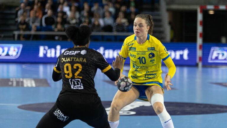 585 Ce mercredi, Metz Handball disputait son premier match de l’année face au Paris 92. Les Messines se sont imposées sur le score de 30 à 29 et prennent seules la tête du championnat. A peine le réveillon du Nouvel An terminé que le menu de Metz Handball est copieux dès la reprise. Après une fin d’année 2022 conclue sur une victoire à Zagreb, un mois de janvier dantesque attend l’équipe d’Emmanuel Mayonnade. Mais, contrairement au début de saison, elle a l’avantage de pouvoir disputer une grande partie des rencontres à la maison. Cela n’en reste pas moins une course effrénée pour les Dragonnes. Le point de départ de ce marathon ? Le Paris 92 de Yacine Massaoudi, une équipe ambitieuse qui se veut outsider chaque saison. Face à ce type d’équipes, la rigueur était de mise pour éloigner ses adversaires, en reprenant la première place perdue suite au forfait de Bourg de Péage. Quant aux Franciliennes (3èmes au classement avant le coup d’envoi), ces points étaient on ne peut plus importants pour rattraper le Brest Bretagne Handball et rester devant les Neptunes de Nantes, leurs concurrentes principales directes. Les Parisiennes ont pu longtemps y croire. Metz Handball s’est fait peur contre Paris 92. Mais les Messines ont du caractère à revendre. Un sujet mal maitrisé Les premières minutes de la rencontre prédisaient un combat. Les deux équipes se répondaient coup sur coup et Metz Handball ne parvenait pas à se détacher. S’ensuivirent des minutes de maladresses avec des Messines très peu inspirées, tombant dans le piège de l’agressivité parisienne. Moins appliqué en attaque, Metz manquait de liant en défense pour récupérer des ballons. Cette mauvaise phase permettait aux Franciliennes de prendre les devants après quasiment un quart d’heure de jeu (5 à 6, 11’30). Mais les deux collectifs manquaient de réalisme face aux buts. Non aidés par un arbitrage haché de part et d’autre du terrain, les Dragonnes et les Lionnes ne dépassaient toujours pas les dix buts au compteur alors que le chronomètre s’approchait de la 20ème minute. Alors qu’Emmanuel Mayonnade perdait temporairement Louise Vinter Burgaard, sortie sur blessure, Yacine Messaoudi donnait des leçons tactiques au banc messin. Désarçonnées par la sortie prématurée de leur arrière droite, les jaunes et bleues étaient prises de court avec une vitesse imposée par Laura Flippes et Déborah Lassource. De par cette mauvaise dynamique, Metz Handball voyait le Paris 92 s’envoler. Bruna de Paula et ses coéquipières ne trouvaient aucune solution face à la défense compacte de leurs adversaires. De l’autre coté, le manque de communication et d’engagement laissaient des intervalles bien trop espacés, régalant ainsi les Isséennes, bien avides d’exploit. Malmenées depuis la 15ème minute de jeu, les Messines rentraient au vestiaire avec un retard de 3 buts (12-15, 30′). La défense, le remède de tous les maux Emmanuel Mayonnade et son équipe étaient repoussés dans leur retranchement pour la première fois de la saison, en championnat. Paris 92 serait-elle la deuxième équipe à vaincre le Champion de France, toutes compétitions confondues ? Un véritable défi attendait ce jeune collectif messin. Une position psychologique inédite était présente aux Arènes mais les Lorraines ne semblaient pas avoir dit leur dernier mot. De retour de la pause, Metz Handball appuyait sur la pédale d’accélérateur pour revenir à une petite unité de Paris 92. Malheureusement, Laura Flippes et Déborah Lassource préservaient leur efficacité devant le filet. Mais un bloc défensif plus discipliné porté par Stelvia Pascoal, Kristina Jørgensen et Sarah Bouktit permettait à Camille Depuiset de faire les parades décisives. Les rangs messins sonnaient la révolte et revenaient sur le droit chemin avec l’égalisation de Laura Kanor (20 à 20, 40′). Sa défense retrouvée, le collectif messin poussait les Parisiennes aux fautes techniques, leur permettant de récupérer de bons ballons, sans toutefois creuser l’écart. Espiègles, les joueuses du Paris 92 mettaient la pression aux Messines en restant au contact, à la moindre attaque. Néanmoins, dans le sillage de la puissance de Louise Vinter Burgaard, la troisième meilleure équipe d’Europe prenait une véritable option sur la victoire en menant jusqu’à 4 buts dans le money-time. C’était bien évidemment sans compter le petit relâchement crispant qui tenait une salle entière en haleine. Jusqu’à la parade libératrice de Camille Depuiset, empêchant une égalisation fatale de Paris 92 (30 à 29, 60′). Statistiques de la rencontre Metz HandballCamille Depuiset (8 parades sur 23 tirs) – Hatadou Sako (4/17). Bruna de Paula (5 buts en 8 tentatives), Chloé Valentini (1/1), Kristina Jørgensen (4/6), Tamara Horacek, Debbie Bont (1/3), Louise Vinter Burgaard (4/5), Laura Kanor (4/4), Emma Jacques (4/5), Stelvia Pascoal (1/1), Sarah Bouktit (6/9), Noémie Barthelemy, Julie Le Blevec. Paris 92Roxanne Frank (2 parades sur 14 tirs) – Léa Serdarevic (2/20). Astride N’Gouan (1/2), Aminata Cissokho, Coura Kanoute (1/3), Jannela Blonbou (2/6), Alice Mazens (1/2), Laura Flippes (8/12), Déborah Lassource (10/13), Candy Jabateh, Lara Gonzalez Ortega, Namizata Fofana (2/6), Gnonsiane Niombla (4/9), Adja Ouattara (0/1). La Galerie du match Crédit photo : Julien Buret/Let’s Go Metz