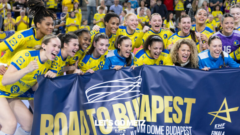 2,3K Ce dimanche, Metz Handball s’est qualifié pour le quatrième Final Four de son histoire après sa victoire d’un but (33-32) face à Brest. Samedi 19 avril, à l’issue d’une victoire de trois buts en Bretagne (26-29), bon nombre d’observateurs se disaient qu’une bonne partie du chemin vers Budapest et une quatrième qualification au Final Four étaient faites. Seulement, ceux qui avaient vécu le traumatisme du retournement de situation face à FTC en 2023 savaient que tout était possible tant que le buzzer du match retour n’a pas retenti. Et au terme d’une heure à haute intensité, Metz Handball l’emporte d’un but (33-32) et valide le premier objectif de la saison. Les Dragonnes retrouveront le MVM Dôme de Budapest le 31 mai prochain et tenteront de conquérir la première Champions League de leur histoire. Anne-Mette Hansen en fer de lance Si les filles du président Weizman se sont imposées lors des deux rencontres de ce quart de finale européen, ce fut au terme de deux combats. Comme ce fut le cas en Ligue Butagaz Energie et en Coupe de France, le Brest Bretagne Handball dirigé par Raphaëlle Tervel a prouvé qu’il avait les arguments pour contrarier les desseins de son rival lorrain. Mais contrairement à la première manche lors de laquelle les Bretonnes ont mené de cinq buts (14-9) au cours du premier acte, cette fois, elles n’ont eu qu’un but d’avance (5-6, 11e) après une réalisation de Méline Nocandy si l’on excepte les deux premiers buts du match inscrits par Pauline Coatanea et Clarisse Mairot. Anne-Mette Hansen, déjà décisive en championnat, a fait parler son expérience tant dans le jeu qu’aux jets de sept mètres au relais de Sarah Bouktit et Alison Pineau (7/9 au final). View this post on Instagram A post shared by Let's Go Metz (@letsgomtz) Metz Handball peut compter sur Laura Flippes dans le combat Sa partenaire Petra Vamos est restée sur son standard du match aller en faisant parler ses qualités de débordement et de tirs au travers. La Hongroise était une nouvelle fois impeccable au tir (5/5). L’autre joueuse jaune et bleue qui s’est mise en valeur en cet après-midi ensoleillé était Laura Flippes. L’arrière droite, revenue en Lorraine en début de saison, a sans aucun doute réalisé sa meilleure prestation depuis son retour. Son but sur le coup d’envoi du second acte permettant aux siennes de compter trois unités d’avance (16-13, 31e) en est un parfait exemple. Elle n’a pas hésité non plus à se frotter à la rugueuse défense bretonne, même si sa santé pouvait en pâtir. Ses six buts et son abnégation ont été un atout précieux vers la qualification dans le dernier carré. Anna Vyakhireva et Oriane Ondono contrarient Metz Handball Il faut dire que même si les Brestoises voyaient la qualification s’éloigner au fil des minutes, elles n’ont jamais lâché. Les partenaires de Pauletta Foppa avaient toujours l’objectif minimal de parvenir enfin à tenir en échec, à défaut de battre, un adversaire qui les a dominées déjà quatre fois depuis le début de l’année civile. Et, bien qu’annoncée diminuée, l’arrière droite russe, Anna Vyakhireva, a fait parler toute son expérience pour aider ses partenaires. Jusqu’à l’outrance parfois en tentant d’obtenir des coups de sifflet en sa faveur mais le duo arbitral hollandais ne s’est pas laissé impressionner. Elle parvenait tout de même à inscrire six buts. C’est deux de moins que sa compères au pivot Oriane Ondono qui a pu profiter à plein de ses caviars pour mettre à mal la défense messine et une Cléopâtre Darleux impuissante face à elle. Mais si elle a encaissé ses huit tirs et que l’écart final n’est que d’un but, l’ex gardienne internationale a multiplié les parades décisives notamment devant Méline Nocandy en fin de première période. Il le fallait car Katarina Filter n’était pas en reste. Zsofi Szemerey a également détourné un jet de sept mètres d’Anna Vyakhireva mais celui-ci n’a pas été comptabilisé dans les statistiques puisque le ballon est sorti en touche en faveur de Brest. Metz Handball retrouvera de bonnes connaissances à Budapest Qu’à cela ne tienne, Metz Handball peut savourer sa trente-cinquième victoire consécutive (pour un match nul) toutes compétitions confondues et préparer la cinquième levée du duel qui l’oppose à ses meilleures ennemies bretonnes. Prévue dans deux semaines (le 11 mai à 15 h), elle devrait sacrer championne de France celle qui la négociera le mieux. Trois semaines plus tard, Metz Handball se rendra à Budapest pour tenter de soulever sa première Ligue des champions. Pour cela, les Dragonnes devront se montrer plus fortes qu’Odense, Györ ou encore Esbjerg. Une chose est certaine, les Jaune et Bleu croiseront de veilles connaissances des Arènes lors de leur week-end magyare dont on connaîtra le programme ce lundi. La galerie de la rencontre Les stats du match Metz HandballDarleux (8 parades sur 38 tirs), Szemerey (0/2)Pineau (1 but sur 2 tirs), Hansen (7/9), Axner, Augustine, Flippes (6/8), Mlamali (0/2), Jacques (0/1), Bouktit (3/6), Granier (3/6), Grandveau (4/7), Chambertin (1/2), Vamos (5/5), Sollosi-Schatzl (2/2), Errard (1/1).Exclusions: Vamos (24e), Mlamali (34e), Pineau (39e) Brest Bretagne HandballAndré (1 parade sur 7 tirs), Filter (8/35)Coatanea (2 buts sur 2 tirs), Nocandy (3/7), Mairot (6/8), Lassource (4/4), Ondono (8/8), Vyakhireva (5/7), Faure (1/3), L. Kanor (1/3), Foppa (2/2), Novak, Delaye (0/2), Jarrige, A. Dembélé (0/1).Exclusions: Mairot (14e, 41e), Lassource (17e, 19e), Dembelé (29e), Nocandy (45e) Crédit photo : Matthieu Henkinet / Let’s Go Metz