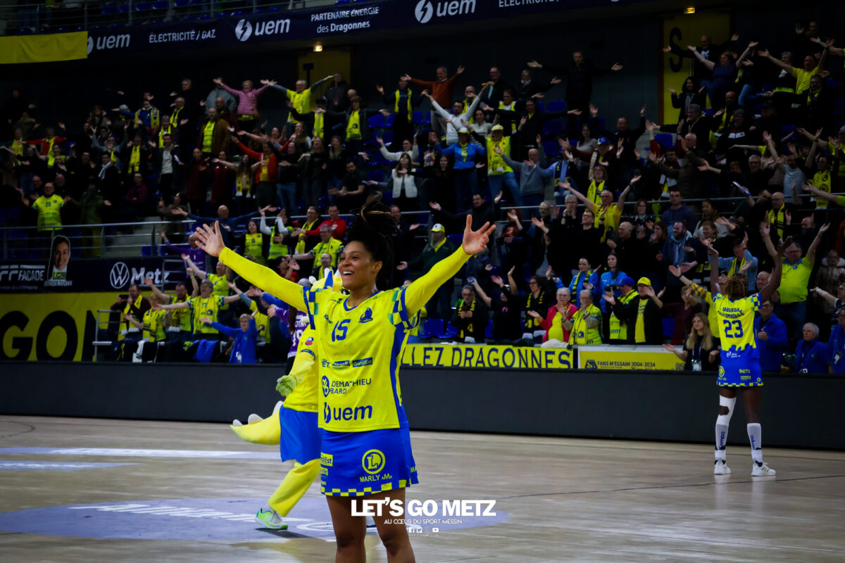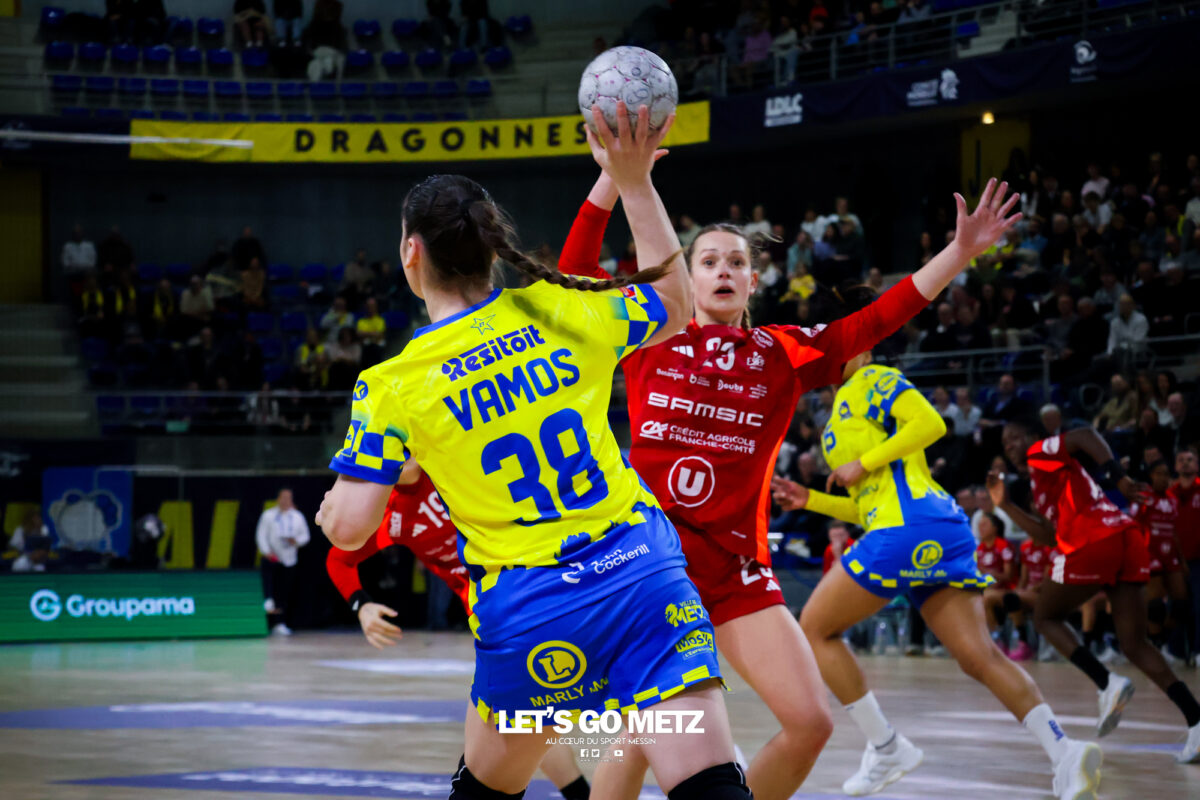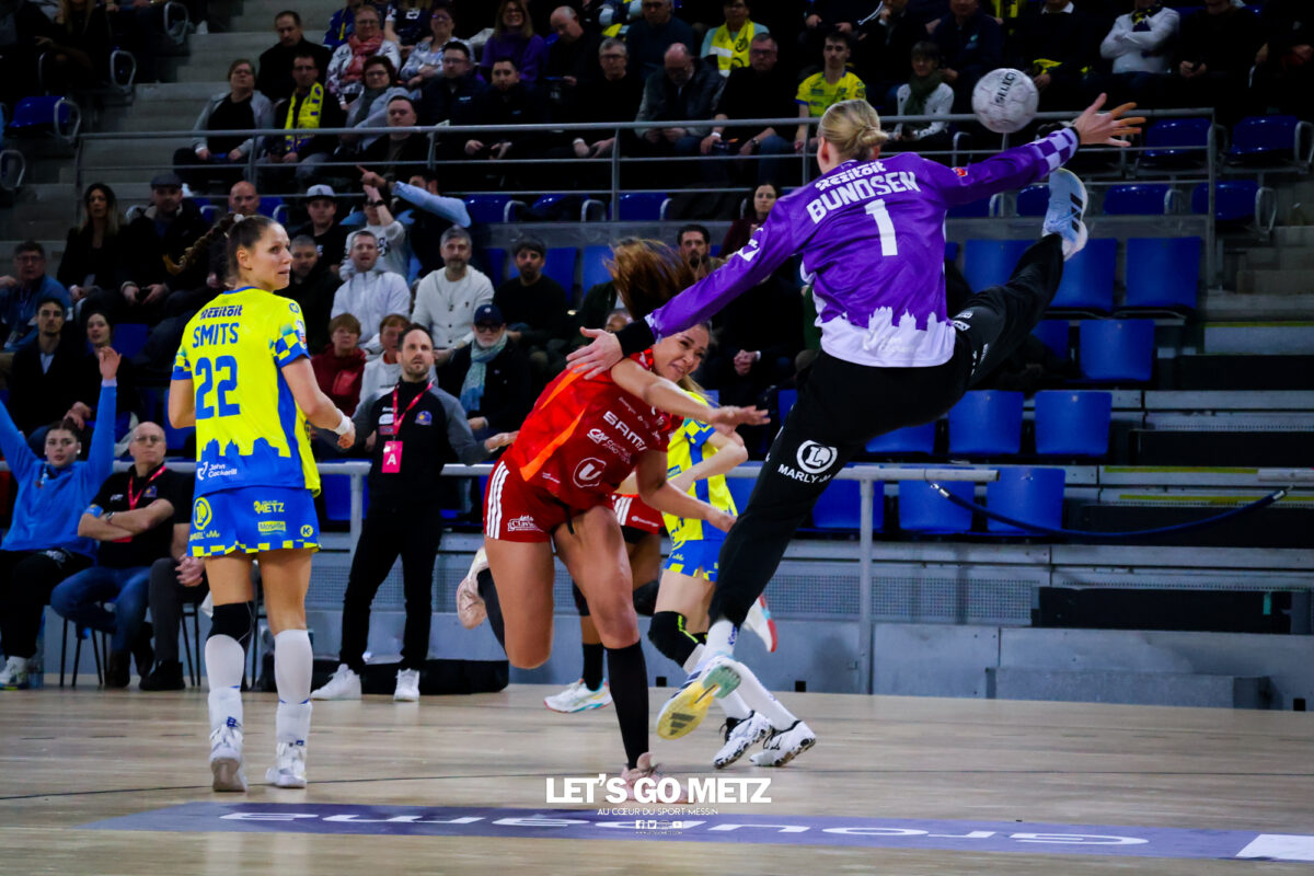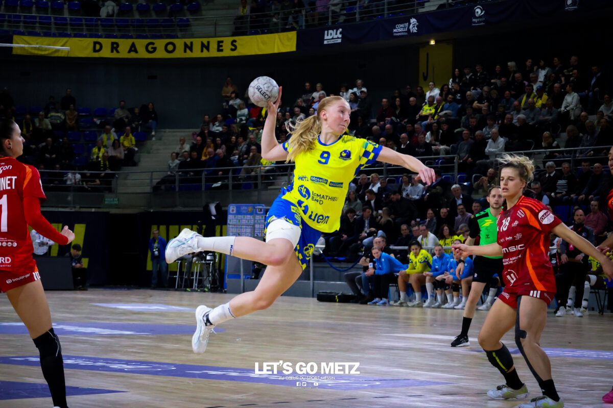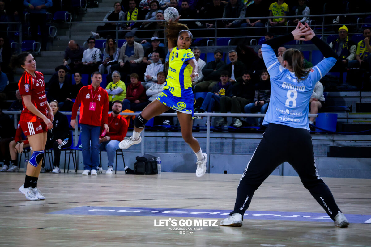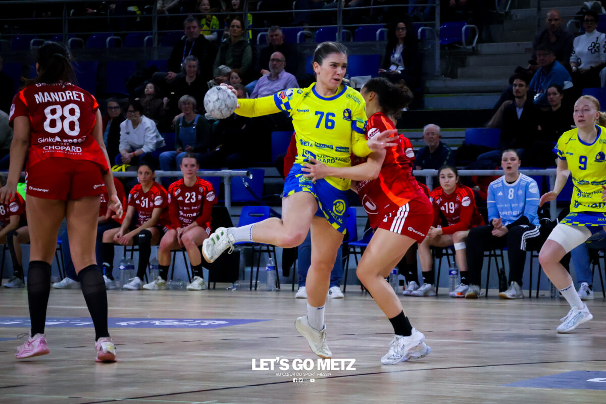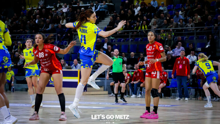 252 Défait lors de sa dernière sortie en Ligue Butagaz Energie à Brest, Metz Handball retrouve le chemin du succès au championnat contre l’ES Besançon Féminin (38-27). Dans la lignée de leur victoire à Podgorica en Ligue des Champions, les Dragonnes ont affiché un visage sérieux, malgré quelques moments de relâchement. De retour aux Arènes après un succès sérieux en déplacement à Podgorica, les Dragonnes avaient rendez-vous avec l’ES Besançon Féminin pour le compte de la 13e journée de Ligue Butagaz Energie. Déterminées à ne pas être les habituelles faire-valoir de leurs homologues jaune et bleu dans le Classique originel du handball français, les Bisontines attaquaient la rencontre pied au plancher (1-4). L’illusion n’aura malheureusement duré que dix minutes. Dix petites minutes où les deux formations ont fait jeu égal avant que Metz Handball ne prenne les commandes de la partie par l’intermédiaire de Lucie Granier (7-6, 10’), pour ne plus les lâcher. Appliquées et avec une confiance retrouvée après les victoires contre Storhamar et Podgorica, les Messines commençaient à dérouler leur handball dans le sillage d’Ana Albek (9-7, 12’). La Hongroise inscirvait quatre de ses cinq buts durant le premier acte, en à peine dix minutes. Même réussite pour son compère de la base arrière Tyra Anxer, autrice d’un sans-faute en première mi-temps (3/3 à la pause). La Suédoise terminera la partie avec dix réalisations. Rotations précoces Malgré un écart relativement maigre (10-8, 14’), Metz Handball semblait maitriser totalement son sujet. Si bien qu’Emmanuel Mayonnade ouvrait son banc assez rapidement, donnant notamment du temps de jeu à Lylou Borg au poste d’arrière droite. L’ancienne Girondine saisissait l’opportunité pour se montrer offensivement (12-9, 20’). Solide, le collectif messin faisait grimper l’écart à neuf unités à la mi-temps (22-13, 30’). Seule Betchaïdelle Ngombele, sanctionnée par deux fois d’une expulsion temporaire, paraissait en difficulté durant ce premier acte. La dynamique messine s’est poursuivie dès le retour des vestiaires, sous l’impulsion d’une Tyra Axner qui ajoutait quatre nouveaux buts à une feuille de statistiques déjà bien fournie (27-19, 42). Inspirée face à son ancienne équipe, la capitaine Chloé Valentini permettait à Metz Handball d’atteindre la barre des dix buts d’avance (30-20, 48’). Malgré la résistance de Bisontines qui ne laissaient pas le score trop enfler, les Dragonnes se dirigeaient tranquillement vers une nouvelle victoire en Ligue Butagaz Energie après la défaite à Brest lors de la précédente journée. Metz Handball 38-27 ES Besançon Féminin Metz HandballBundsen (4 arrêts/17 tirs), Novotna (7/21)Valentini (4 buts/5 tirs), Axner (10/11), Wajoka (2/2), Albek (5/10), Augustine (2/3), Smits, Ngombele (0/2), Bouktit (4/7), Granier (3/4), Grandveau (3/4), Vamos (2/3), Borg (3/4) ES Besançon FémininLerstad (9 arrêts/42 tirs), Gindro (2/6)Robert (1 but/1 tir), Bellonnet (1/2), Solstad (2/4), Mairot (1/4), Mladenovska (0/1), Mumbongo (1/1), Di Rocco (3/6), Zazaï-Ozil (8/12), Kingue (2/8), Bellec (3/3), Mandret (5/5), Mlamali (0/2) Classement Ligue Butagaz Energie Crédit photo : Zoé Keller / Let’s Go Metz