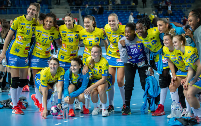 582 Les dragonnes de Metz Handball recevaient hier après-midi les Slovènes de Krim dans le cadre de leur 3ème match de ligue des champions de la saison. Après le report de la 3ème journée de ligue Delo EHF face aux hongroises du FTC Rail Cargo Hungaria et avant d’affronter l’équipe Slovène, les messines affichaient un bilan mitigé dans ce début de compétition : une défaite à Bucarest, une victoire aux arènes face à Bietigheim. Autant dire qu’une victoire était requise, d’une part pour prendre des points mais également pour maintenir une invincibilité record de 25 rencontres à domicile en ligue des champions. Hatadou Sako concentrée avant son matchLouise Buurgard à l’échauffement Le 7 majeur d’Emmanuel Mayonnade :17 : Orlane Kanor21 : Laura Kanor77 : Olga Perederiy19 : Louise Burgaard15 : Tjasa Stanko99 : Hatadou Sako14 : Debbie BontA noter l’absence dans le groupe de Melvine Deba, victime d’une rupture des ligaments croisés vendredi à l’entraînement. Une bien mauvaise nouvelle pour Metz Handball qui devra se passer de son ailière droite pendant au moins 6 mois. #RendezNousNotreHymne Première mi-temps :Si Hatadou Sako s’illustre d’entrée en arrêtant un jet de 7m, le match commence doucement et il faudra attendre 3mn pour voir Krim ouvrir le score. Ce faux départ aura pour vertu de réveiller les dragonnes qui vont rapidement imposer leur puissance avec notamment une Tjasa Stanko en feu et une Olga Perederiy intraitable avant que Laura Kanor ne fasse parler son talent, 6-2 (10′).Les slovènes tentent de réagir, mais les messines déroulent. Précises et virevoltantes les jaunes et bleues, poussées par un public des arènes venu en nombre, enchaînent les buts avec une facilité déconcertante 10-5 (16′). Le mur défensif des dragonnes semble insurmontable pour les joueuses de Krim qui n’arrivent pas à refaire leur retard. 14-8 (22′). Emmanuel Mayonnade en profite pour faire tourner l’effectif et donne sa chance à la jeune Julie Le Blevec pour le plus grand bonheur du public. La mi-temps s’achève sur un festival des messines. 19-11 Tjasa Stanko a de nouveau rendu une copie parfaite 2ème mi-temps :Malgré un retour un peu compliqué des vestiaires, les dragonnes vont continuer leur parcours de santé 20-14 (4′). Ivana Kapitanovic entre en jeu pour participer à la fête et sort un jet de 7m (5′). Les esprits s’échauffent et le public contestent les décisions de l’arbitre. L’écart reste à + 6 grâce à Debbie Bont et à une paire Orlane Kanor – Tjasa Stanko irrésistible. Astrid N’Gouan, véritable chef d’orchestre du Metz Handball, donne de la voix et amène le score à +8, 28-20 (17′). Rien ne semble pouvoir arriver aux dragonnes qui se dirigent vers leur 25ème match sans défaite à domicile en ligue des champions, leur 23ème victoire. La jeunesse messine participe au spectacle, à l’image d’Emma Jacques qui inscrit 2 buts coup sur coup. 32-21 (21′) les Slovènes sont à bout mais donnent tout jusqu’à la fin.Score final : 33-27 Invincibles.Une 25ème rencontre sans défaite à domicile en ligue des champions et une 23ème victoire pour les messines du Metz Handball, le chiffre peut paraître incroyable, surtout pour une équipe que l’on a maintes et maintes fois enterrée, notamment cette année après le large renouvellement de l’effectif. Et pourtant Metz reste Metz, et le maillot jaune et bleu semble invincible en ses terres. Le groupe emmené par Emmanuel Mayonnade fût à nouveau intraitable, les Slovènes n’auront jamais trouvé la faille dans la défense et face à une Hatadou Sako à 31% d’arrêts. Peut mieux faire.Malgré la victoire, Emmanuel Mayonnade ne cachait pas un certain mécontentement lors de la conférence de presse. « On a fait une bonne première mi-temps mais en deuxième mi-temps on a fait beaucoup trop d’erreurs, et ce sera compliqué dès mercredi contre Fleury si l’on réitère ce genre de performance. » Les statistiques :Tjasa Stanko 8/8, Orlane Kanor 4/9, Louise Burgaard 3/5, Astride N’Gouan 3/5, Camila Micijevic 3/7, Maud-Eva Copy 3/4, Olga Perederiy 2/3, Méline Nocandy 2/3, Emma Jacques 2/5, Debbie Bont 1/1, Laura Kanor 1/1, Julie Le Blevec 1/1, Daphné Gautschi 0/1, Sarah Bouktit 0/0, Ivana Kapitanovic 1/2 (Arrêts), Hatadou Sako 12/38 (Arrêts). Récit : Gérald Russello / Crédit Photos : Lucas Deslangles