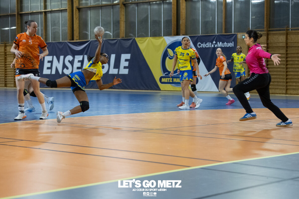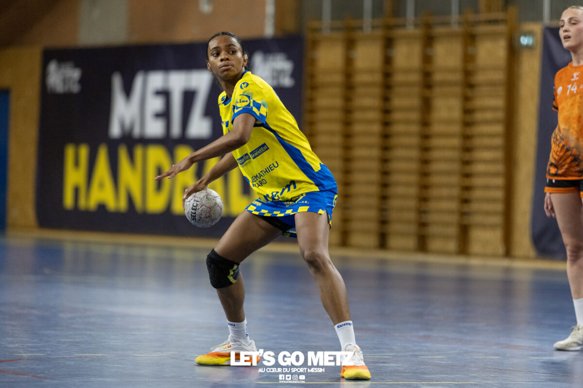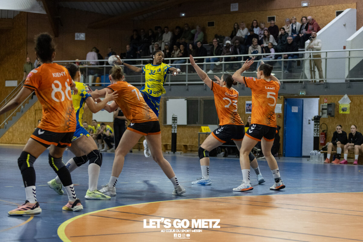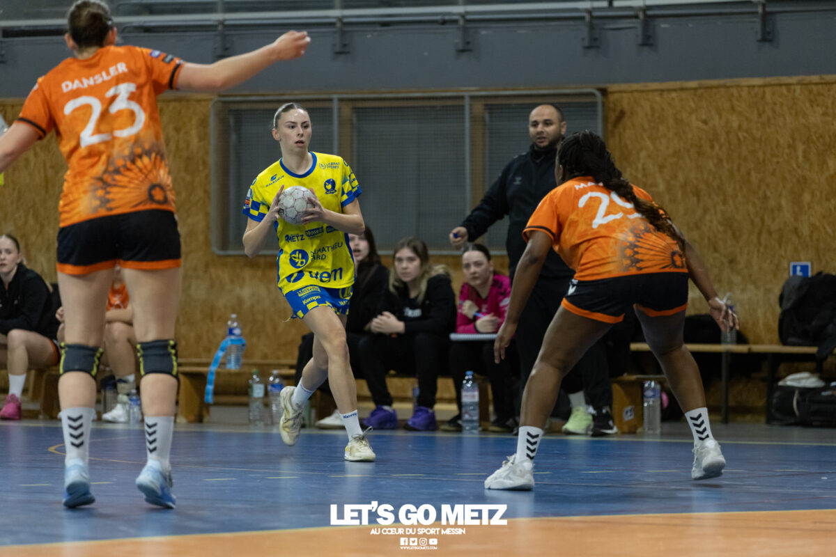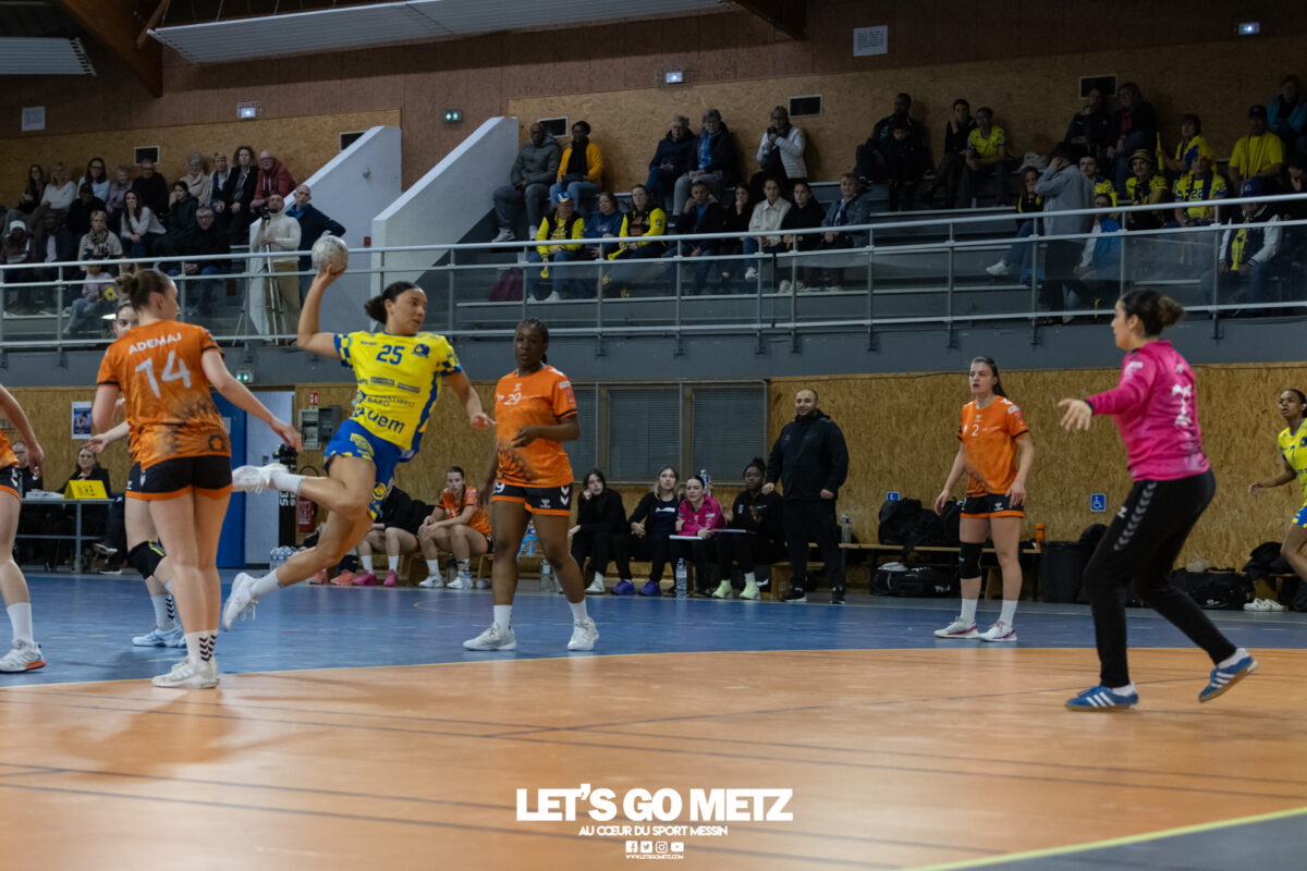 8,7K L’équipe de Nationale 1 Féminine (N1F) de Metz Handball recevait l’ASPTT Strasbourg dans le cadre de la 17ème journée de compétition. Les semaines se suivent mais ne se ressemblent pas. Défaites par Noisy-le-Grand il y a quelques jours et écartées de la première place de la poule, les jeunes pousses de Metz Handball retrouvaient déjà le gymnase du technopôle ce samedi pour tenter de se relancer face à l’ASPTT Strasbourg. Toujours privée de Blandine Gros, touchée à une épaule, Nina Kanto affichait devant son banc la posture fermée des jours où l’exigence est à son paroxysme. A Metz Handball la détestation de la défaite est souvent plus forte que l’amour des victoires l’exigence qui en découle se ressentait dès le début de rencontre. Les réalisations d’Yvana Atangana, Anais Ababsa et Nelya Goval donnaient une courte avance aux locales que les parades de Manuella Navarro venaient bonifier (06-03, 15ème). L’avance croissait jusqu’à cinq unités juste avant la pause, alors qu’Alice Giliberto et Marie-Eve Holler trouvaient les filets (14-09, mt). Un second acte peu convaincant C’est en deuxième période que les choses se gâtaient. Un manque de réussite au tir, mais surtout des erreurs grossières, offraient la possibilité à Strasbourg de recoller au score en seulement quelques minutes (15-14, 35ème). En trompe l’œil, des réalisations d’Elea Ferdilus et Maily Etilopy redonnaient de l’air aux jeunes Dragonnes (20-16, 43ème), malgré un niveau de jeu dégradé. Semblant manquer de ressources en dépit d’un banc plus fourni et des rotations fréquentes, les locales subissaient le regain d’énergie Strasbourgeois en se voyant être égalisées, puis menées pour la première fois de la partie à l’entame des dix dernières minutes (22-23, 51ème). Il fallait finalement une certaine dose de résilience et des réalisations de Nelya Goval, Clémence Castets, Ludyvine Kaakil Talaba et enfin Yvana Atangana pour assurer une victoire bien plus alambiquée que nécessaire. Score final de ce Metz Handball – ASPTT Strasbourg en N1F : 29 – 27 Pour leur prochain match, les jeunes Dragonnes se déplaceront à Besançon, ce sera le dimanche 19 avril. Le retour à domicile prendra la forme d’un « derby » face au Bassin Mussipontain le dimanche 03 mai. La galerie du match Les stats de la rencontre Metz HandballNavarro (8 parades), CinkuAbabsa (1 but sur 3 tir), Atangana (5/6, capitaine), Castets (4/6), Etilopy (3/4), Ferdilus (5/6), Giliberto (1/1), Gooroosamy (0/1), Goval (6/7), Holler (1/2), Kaakil Talaba (3/5), Nguon, Thevenot (0/1). Strasbourg ASPTTJid (5 parades), Fussler (2 parades)Ademaj, Bourniquel (3 buts sur 3 tirs), Burgmann (3/5), Dansler (2/2), Gruber (1/2), Kieny (10/12, capitaine), Lamy (3/9), Leleu (5/8), Madjidi. Crédit photo : Matthieu Henkinet / Let’s Go Metz