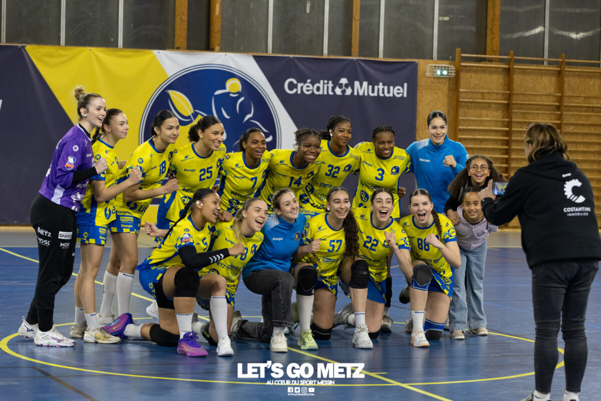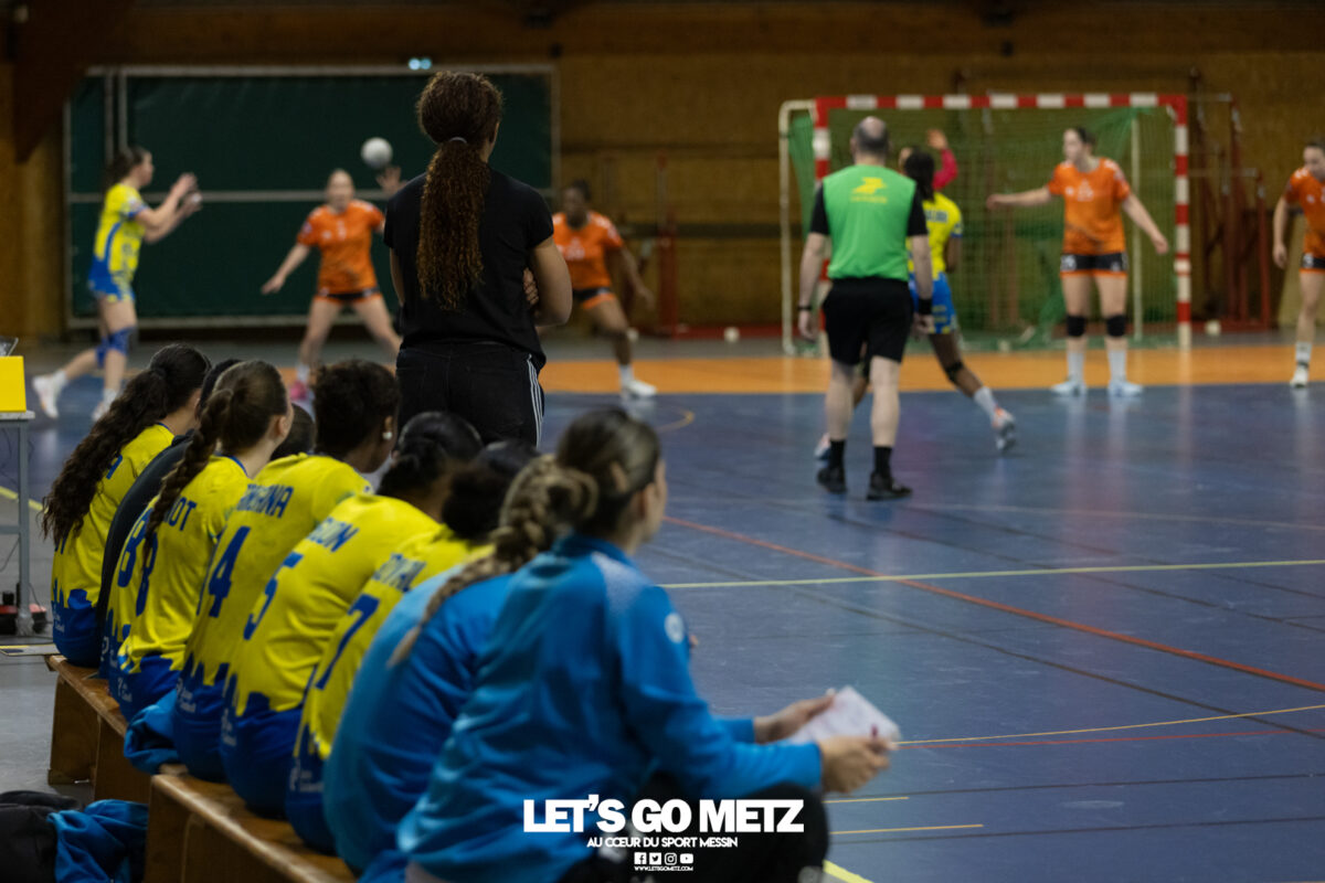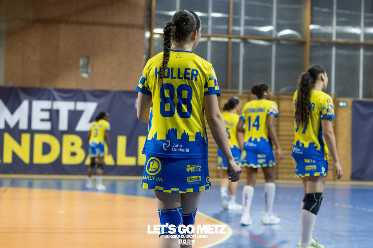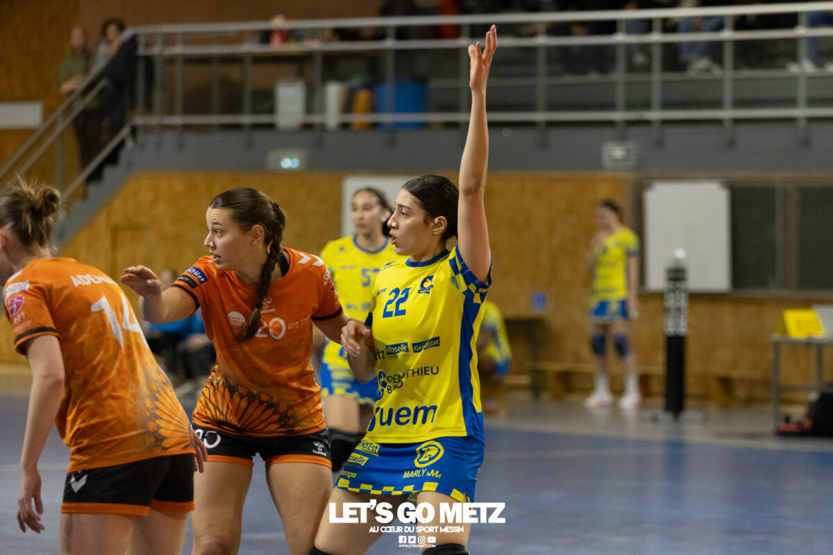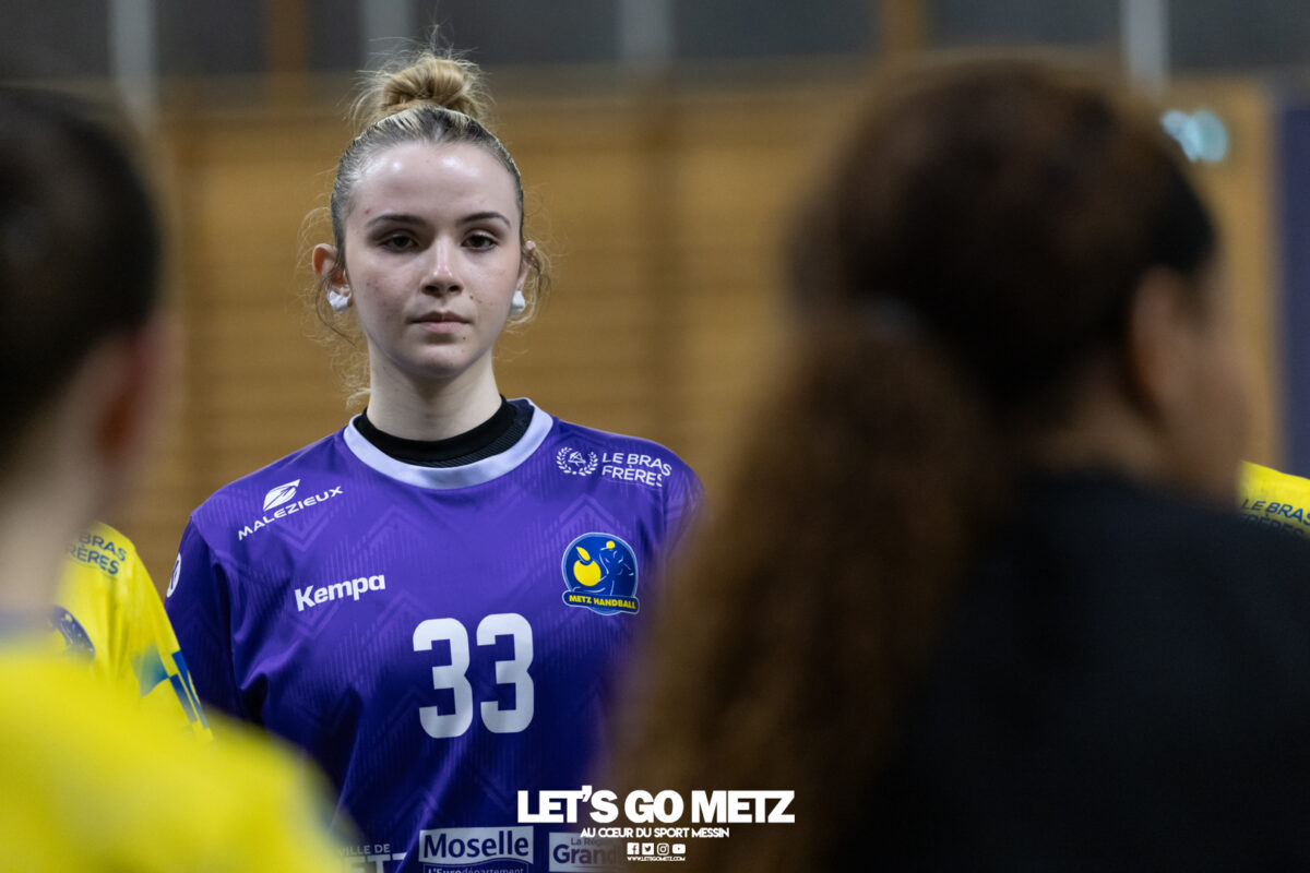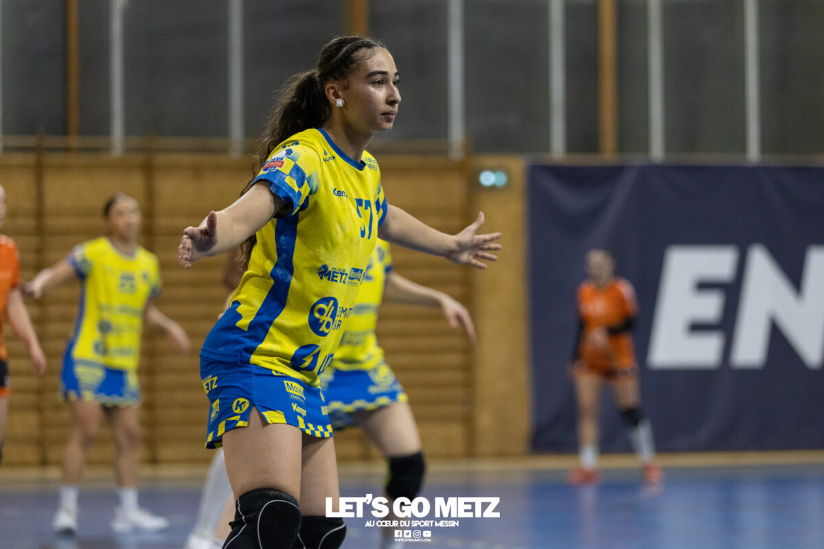 8,7K L’équipe de Nationale 1 Féminine (N1F) de Metz Handball recevait l’ASPTT Strasbourg dans le cadre de la 17ème journée de compétition. Les semaines se suivent mais ne se ressemblent pas. Défaites par Noisy-le-Grand il y a quelques jours et écartées de la première place de la poule, les jeunes pousses de Metz Handball retrouvaient déjà le gymnase du technopôle ce samedi pour tenter de se relancer face à l’ASPTT Strasbourg. Toujours privée de Blandine Gros, touchée à une épaule, Nina Kanto affichait devant son banc la posture fermée des jours où l’exigence est à son paroxysme. A Metz Handball la détestation de la défaite est souvent plus forte que l’amour des victoires l’exigence qui en découle se ressentait dès le début de rencontre. Les réalisations d’Yvana Atangana, Anais Ababsa et Nelya Goval donnaient une courte avance aux locales que les parades de Manuella Navarro venaient bonifier (06-03, 15ème). L’avance croissait jusqu’à cinq unités juste avant la pause, alors qu’Alice Giliberto et Marie-Eve Holler trouvaient les filets (14-09, mt). Un second acte peu convaincant C’est en deuxième période que les choses se gâtaient. Un manque de réussite au tir, mais surtout des erreurs grossières, offraient la possibilité à Strasbourg de recoller au score en seulement quelques minutes (15-14, 35ème). En trompe l’œil, des réalisations d’Elea Ferdilus et Maily Etilopy redonnaient de l’air aux jeunes Dragonnes (20-16, 43ème), malgré un niveau de jeu dégradé. Semblant manquer de ressources en dépit d’un banc plus fourni et des rotations fréquentes, les locales subissaient le regain d’énergie Strasbourgeois en se voyant être égalisées, puis menées pour la première fois de la partie à l’entame des dix dernières minutes (22-23, 51ème). Il fallait finalement une certaine dose de résilience et des réalisations de Nelya Goval, Clémence Castets, Ludyvine Kaakil Talaba et enfin Yvana Atangana pour assurer une victoire bien plus alambiquée que nécessaire. Score final de ce Metz Handball – ASPTT Strasbourg en N1F : 29 – 27 Pour leur prochain match, les jeunes Dragonnes se déplaceront à Besançon, ce sera le dimanche 19 avril. Le retour à domicile prendra la forme d’un « derby » face au Bassin Mussipontain le dimanche 03 mai. La galerie du match Les stats de la rencontre Metz HandballNavarro (8 parades), CinkuAbabsa (1 but sur 3 tir), Atangana (5/6, capitaine), Castets (4/6), Etilopy (3/4), Ferdilus (5/6), Giliberto (1/1), Gooroosamy (0/1), Goval (6/7), Holler (1/2), Kaakil Talaba (3/5), Nguon, Thevenot (0/1). Strasbourg ASPTTJid (5 parades), Fussler (2 parades)Ademaj, Bourniquel (3 buts sur 3 tirs), Burgmann (3/5), Dansler (2/2), Gruber (1/2), Kieny (10/12, capitaine), Lamy (3/9), Leleu (5/8), Madjidi. Crédit photo : Matthieu Henkinet / Let’s Go Metz