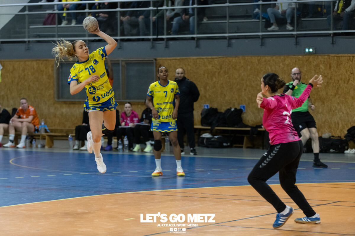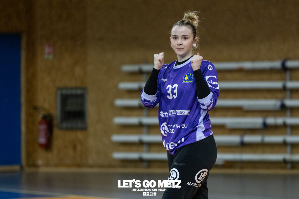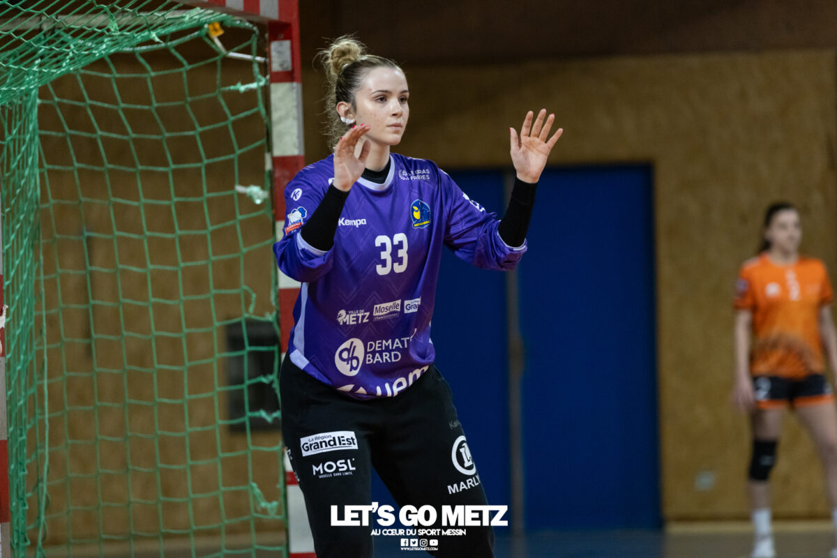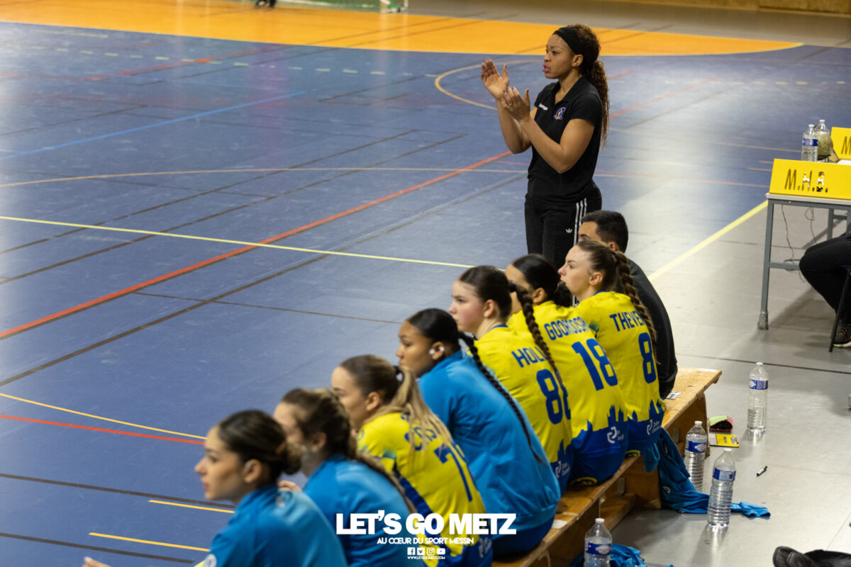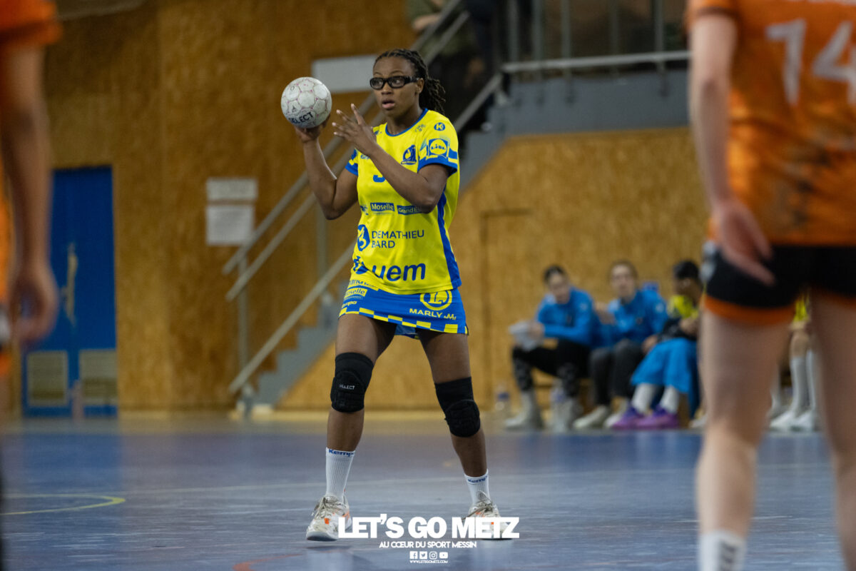 8,7K L’équipe de Nationale 1 Féminine (N1F) de Metz Handball recevait l’ASPTT Strasbourg dans le cadre de la 17ème journée de compétition. Les semaines se suivent mais ne se ressemblent pas. Défaites par Noisy-le-Grand il y a quelques jours et écartées de la première place de la poule, les jeunes pousses de Metz Handball retrouvaient déjà le gymnase du technopôle ce samedi pour tenter de se relancer face à l’ASPTT Strasbourg. Toujours privée de Blandine Gros, touchée à une épaule, Nina Kanto affichait devant son banc la posture fermée des jours où l’exigence est à son paroxysme. A Metz Handball la détestation de la défaite est souvent plus forte que l’amour des victoires l’exigence qui en découle se ressentait dès le début de rencontre. Les réalisations d’Yvana Atangana, Anais Ababsa et Nelya Goval donnaient une courte avance aux locales que les parades de Manuella Navarro venaient bonifier (06-03, 15ème). L’avance croissait jusqu’à cinq unités juste avant la pause, alors qu’Alice Giliberto et Marie-Eve Holler trouvaient les filets (14-09, mt). Un second acte peu convaincant C’est en deuxième période que les choses se gâtaient. Un manque de réussite au tir, mais surtout des erreurs grossières, offraient la possibilité à Strasbourg de recoller au score en seulement quelques minutes (15-14, 35ème). En trompe l’œil, des réalisations d’Elea Ferdilus et Maily Etilopy redonnaient de l’air aux jeunes Dragonnes (20-16, 43ème), malgré un niveau de jeu dégradé. Semblant manquer de ressources en dépit d’un banc plus fourni et des rotations fréquentes, les locales subissaient le regain d’énergie Strasbourgeois en se voyant être égalisées, puis menées pour la première fois de la partie à l’entame des dix dernières minutes (22-23, 51ème). Il fallait finalement une certaine dose de résilience et des réalisations de Nelya Goval, Clémence Castets, Ludyvine Kaakil Talaba et enfin Yvana Atangana pour assurer une victoire bien plus alambiquée que nécessaire. Score final de ce Metz Handball – ASPTT Strasbourg en N1F : 29 – 27 Pour leur prochain match, les jeunes Dragonnes se déplaceront à Besançon, ce sera le dimanche 19 avril. Le retour à domicile prendra la forme d’un « derby » face au Bassin Mussipontain le dimanche 03 mai. La galerie du match Les stats de la rencontre Metz HandballNavarro (8 parades), CinkuAbabsa (1 but sur 3 tir), Atangana (5/6, capitaine), Castets (4/6), Etilopy (3/4), Ferdilus (5/6), Giliberto (1/1), Gooroosamy (0/1), Goval (6/7), Holler (1/2), Kaakil Talaba (3/5), Nguon, Thevenot (0/1). Strasbourg ASPTTJid (5 parades), Fussler (2 parades)Ademaj, Bourniquel (3 buts sur 3 tirs), Burgmann (3/5), Dansler (2/2), Gruber (1/2), Kieny (10/12, capitaine), Lamy (3/9), Leleu (5/8), Madjidi. Crédit photo : Matthieu Henkinet / Let’s Go Metz