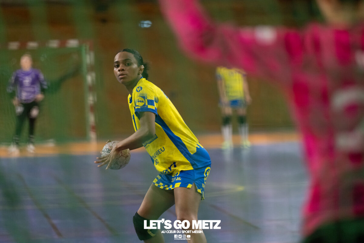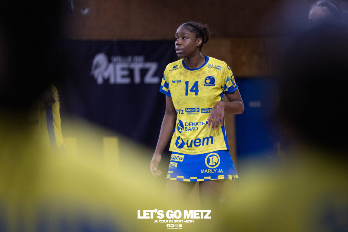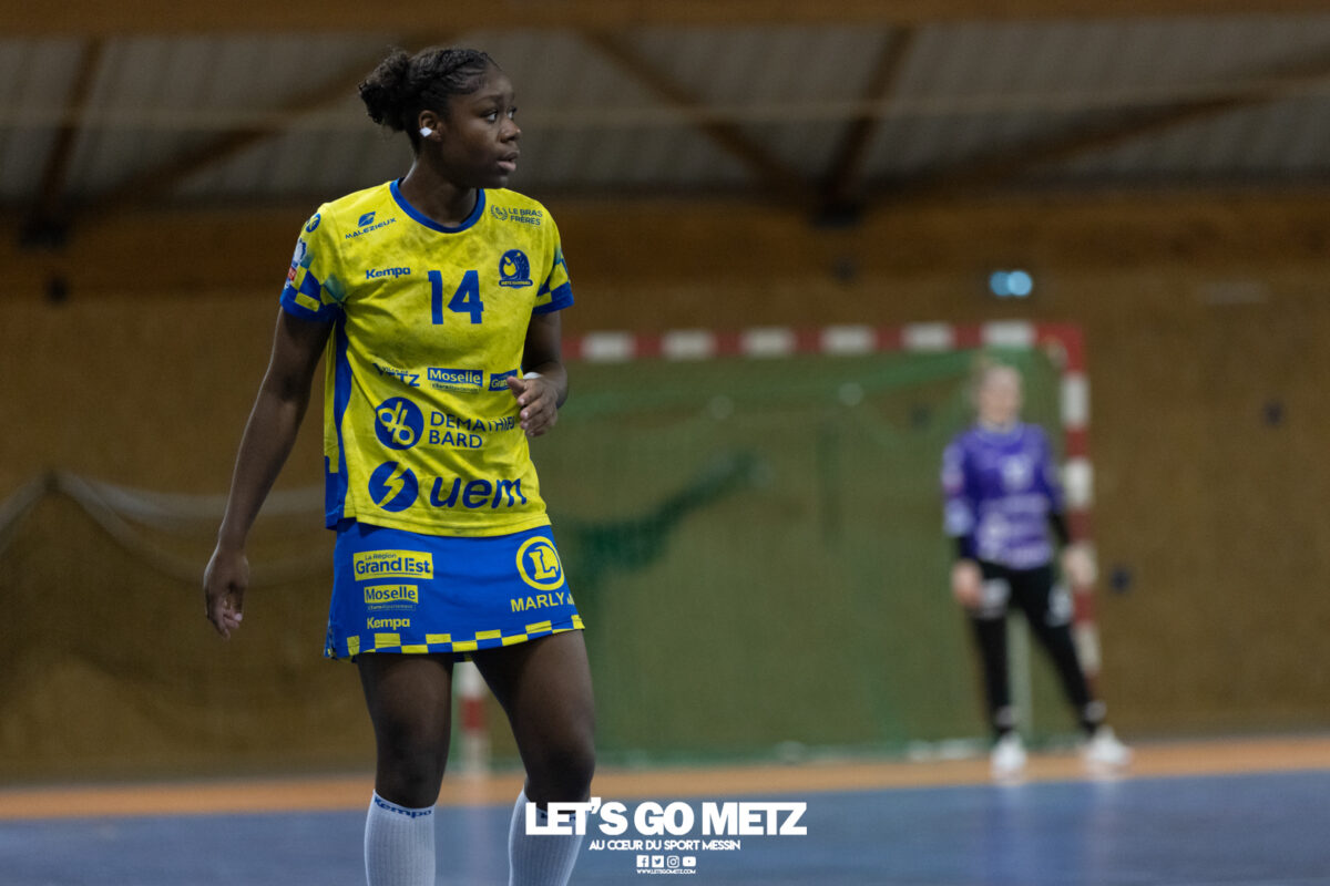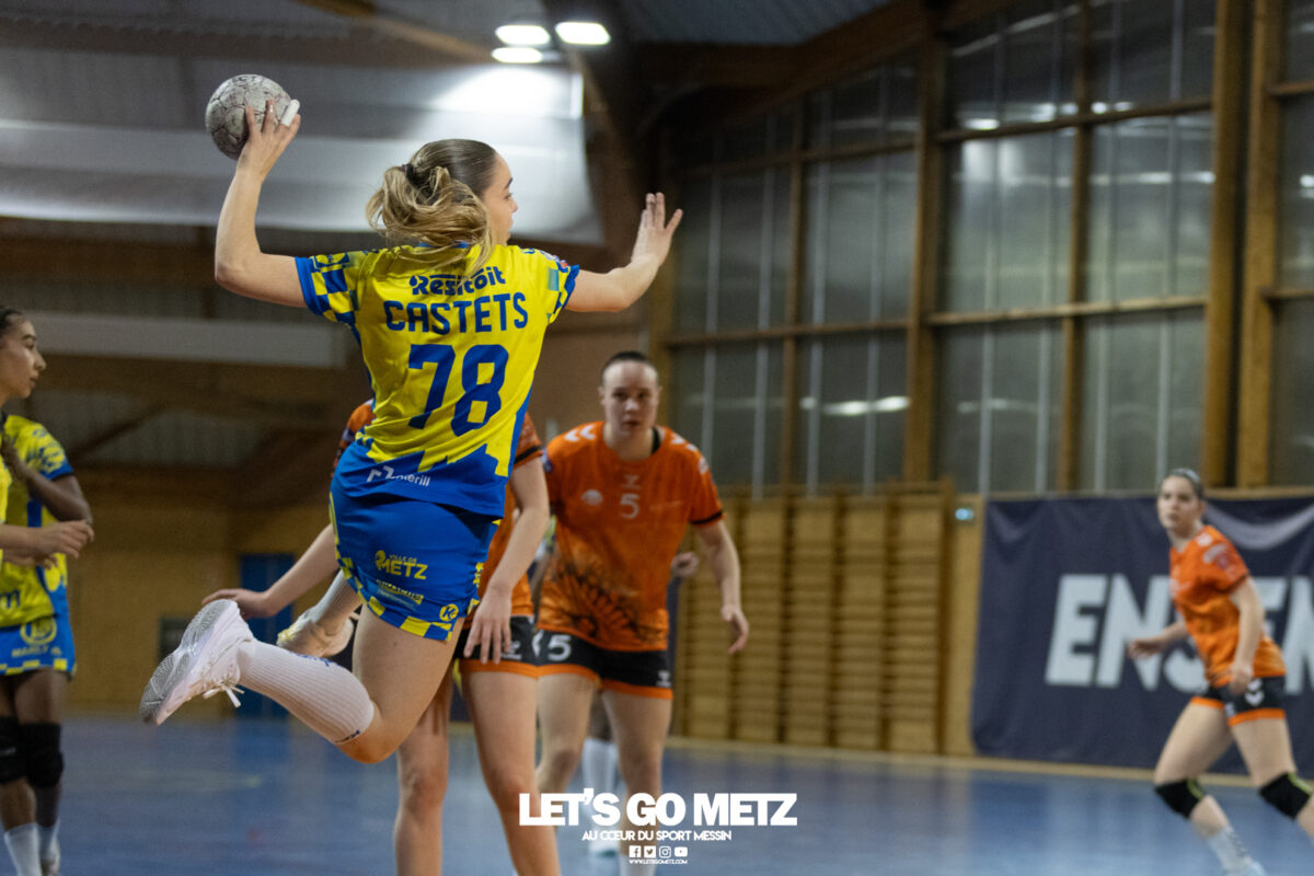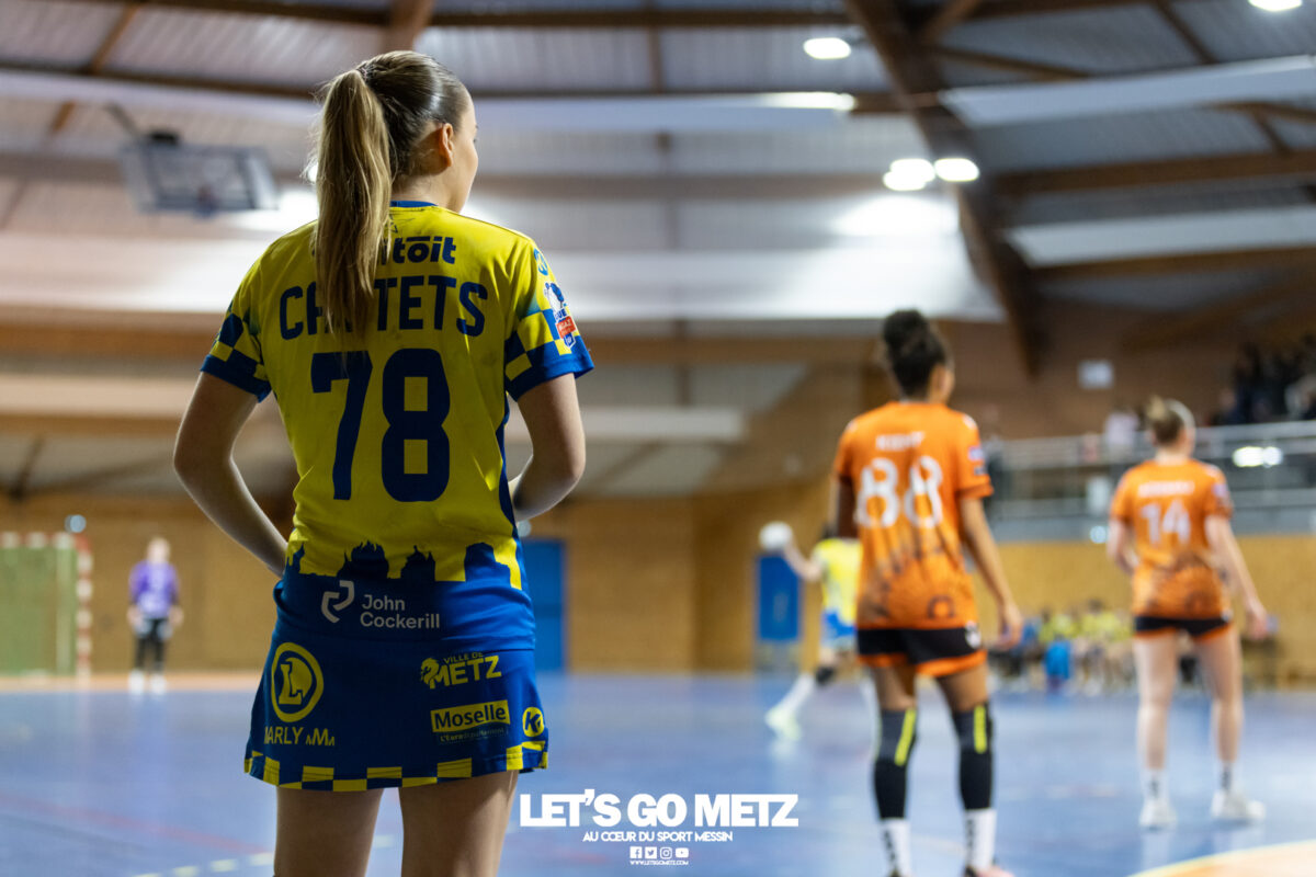 8,7K L’équipe de Nationale 1 Féminine (N1F) de Metz Handball recevait l’ASPTT Strasbourg dans le cadre de la 17ème journée de compétition. Les semaines se suivent mais ne se ressemblent pas. Défaites par Noisy-le-Grand il y a quelques jours et écartées de la première place de la poule, les jeunes pousses de Metz Handball retrouvaient déjà le gymnase du technopôle ce samedi pour tenter de se relancer face à l’ASPTT Strasbourg. Toujours privée de Blandine Gros, touchée à une épaule, Nina Kanto affichait devant son banc la posture fermée des jours où l’exigence est à son paroxysme. A Metz Handball la détestation de la défaite est souvent plus forte que l’amour des victoires l’exigence qui en découle se ressentait dès le début de rencontre. Les réalisations d’Yvana Atangana, Anais Ababsa et Nelya Goval donnaient une courte avance aux locales que les parades de Manuella Navarro venaient bonifier (06-03, 15ème). L’avance croissait jusqu’à cinq unités juste avant la pause, alors qu’Alice Giliberto et Marie-Eve Holler trouvaient les filets (14-09, mt). Un second acte peu convaincant C’est en deuxième période que les choses se gâtaient. Un manque de réussite au tir, mais surtout des erreurs grossières, offraient la possibilité à Strasbourg de recoller au score en seulement quelques minutes (15-14, 35ème). En trompe l’œil, des réalisations d’Elea Ferdilus et Maily Etilopy redonnaient de l’air aux jeunes Dragonnes (20-16, 43ème), malgré un niveau de jeu dégradé. Semblant manquer de ressources en dépit d’un banc plus fourni et des rotations fréquentes, les locales subissaient le regain d’énergie Strasbourgeois en se voyant être égalisées, puis menées pour la première fois de la partie à l’entame des dix dernières minutes (22-23, 51ème). Il fallait finalement une certaine dose de résilience et des réalisations de Nelya Goval, Clémence Castets, Ludyvine Kaakil Talaba et enfin Yvana Atangana pour assurer une victoire bien plus alambiquée que nécessaire. Score final de ce Metz Handball – ASPTT Strasbourg en N1F : 29 – 27 Pour leur prochain match, les jeunes Dragonnes se déplaceront à Besançon, ce sera le dimanche 19 avril. Le retour à domicile prendra la forme d’un « derby » face au Bassin Mussipontain le dimanche 03 mai. La galerie du match Les stats de la rencontre Metz HandballNavarro (8 parades), CinkuAbabsa (1 but sur 3 tir), Atangana (5/6, capitaine), Castets (4/6), Etilopy (3/4), Ferdilus (5/6), Giliberto (1/1), Gooroosamy (0/1), Goval (6/7), Holler (1/2), Kaakil Talaba (3/5), Nguon, Thevenot (0/1). Strasbourg ASPTTJid (5 parades), Fussler (2 parades)Ademaj, Bourniquel (3 buts sur 3 tirs), Burgmann (3/5), Dansler (2/2), Gruber (1/2), Kieny (10/12, capitaine), Lamy (3/9), Leleu (5/8), Madjidi. Crédit photo : Matthieu Henkinet / Let’s Go Metz