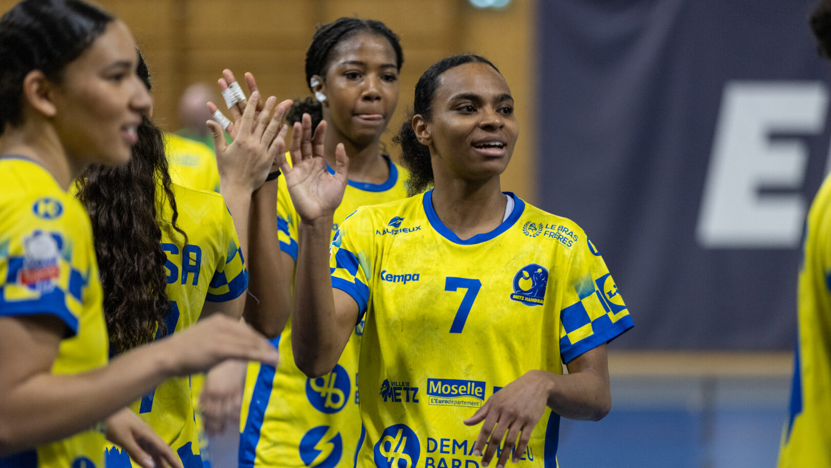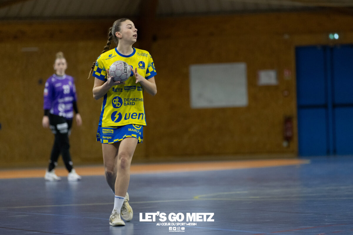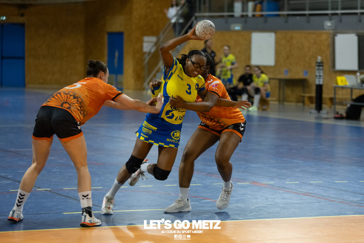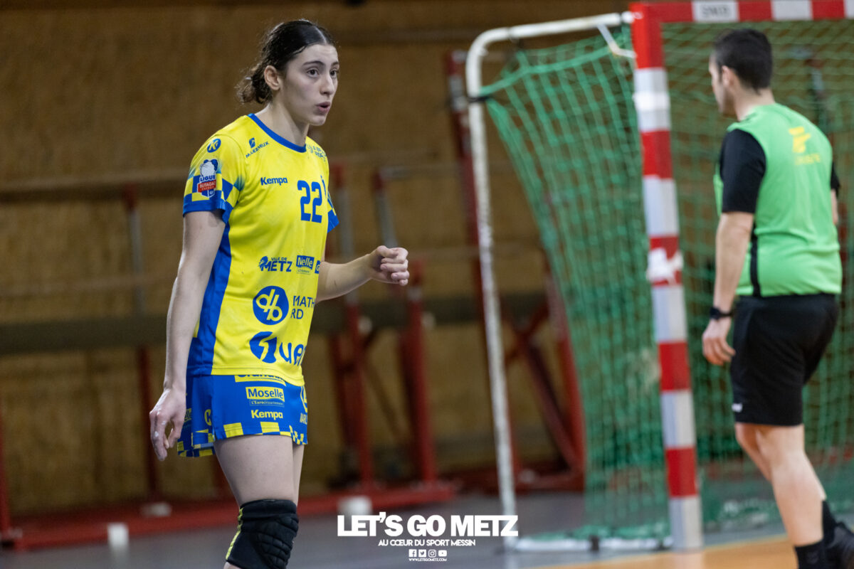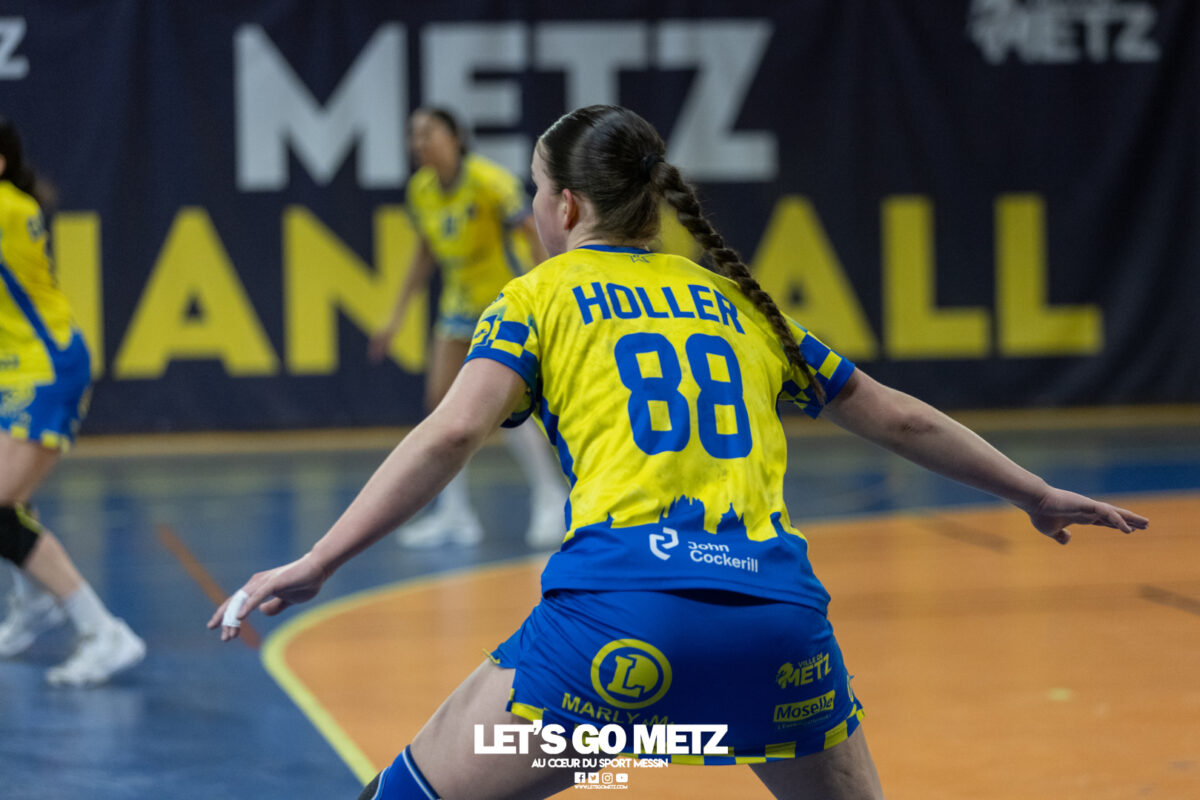 8,7K L’équipe de Nationale 1 Féminine (N1F) de Metz Handball recevait l’ASPTT Strasbourg dans le cadre de la 17ème journée de compétition. Les semaines se suivent mais ne se ressemblent pas. Défaites par Noisy-le-Grand il y a quelques jours et écartées de la première place de la poule, les jeunes pousses de Metz Handball retrouvaient déjà le gymnase du technopôle ce samedi pour tenter de se relancer face à l’ASPTT Strasbourg. Toujours privée de Blandine Gros, touchée à une épaule, Nina Kanto affichait devant son banc la posture fermée des jours où l’exigence est à son paroxysme. A Metz Handball la détestation de la défaite est souvent plus forte que l’amour des victoires l’exigence qui en découle se ressentait dès le début de rencontre. Les réalisations d’Yvana Atangana, Anais Ababsa et Nelya Goval donnaient une courte avance aux locales que les parades de Manuella Navarro venaient bonifier (06-03, 15ème). L’avance croissait jusqu’à cinq unités juste avant la pause, alors qu’Alice Giliberto et Marie-Eve Holler trouvaient les filets (14-09, mt). Un second acte peu convaincant C’est en deuxième période que les choses se gâtaient. Un manque de réussite au tir, mais surtout des erreurs grossières, offraient la possibilité à Strasbourg de recoller au score en seulement quelques minutes (15-14, 35ème). En trompe l’œil, des réalisations d’Elea Ferdilus et Maily Etilopy redonnaient de l’air aux jeunes Dragonnes (20-16, 43ème), malgré un niveau de jeu dégradé. Semblant manquer de ressources en dépit d’un banc plus fourni et des rotations fréquentes, les locales subissaient le regain d’énergie Strasbourgeois en se voyant être égalisées, puis menées pour la première fois de la partie à l’entame des dix dernières minutes (22-23, 51ème). Il fallait finalement une certaine dose de résilience et des réalisations de Nelya Goval, Clémence Castets, Ludyvine Kaakil Talaba et enfin Yvana Atangana pour assurer une victoire bien plus alambiquée que nécessaire. Score final de ce Metz Handball – ASPTT Strasbourg en N1F : 29 – 27 Pour leur prochain match, les jeunes Dragonnes se déplaceront à Besançon, ce sera le dimanche 19 avril. Le retour à domicile prendra la forme d’un « derby » face au Bassin Mussipontain le dimanche 03 mai. La galerie du match Les stats de la rencontre Metz HandballNavarro (8 parades), CinkuAbabsa (1 but sur 3 tir), Atangana (5/6, capitaine), Castets (4/6), Etilopy (3/4), Ferdilus (5/6), Giliberto (1/1), Gooroosamy (0/1), Goval (6/7), Holler (1/2), Kaakil Talaba (3/5), Nguon, Thevenot (0/1). Strasbourg ASPTTJid (5 parades), Fussler (2 parades)Ademaj, Bourniquel (3 buts sur 3 tirs), Burgmann (3/5), Dansler (2/2), Gruber (1/2), Kieny (10/12, capitaine), Lamy (3/9), Leleu (5/8), Madjidi. Crédit photo : Matthieu Henkinet / Let’s Go Metz