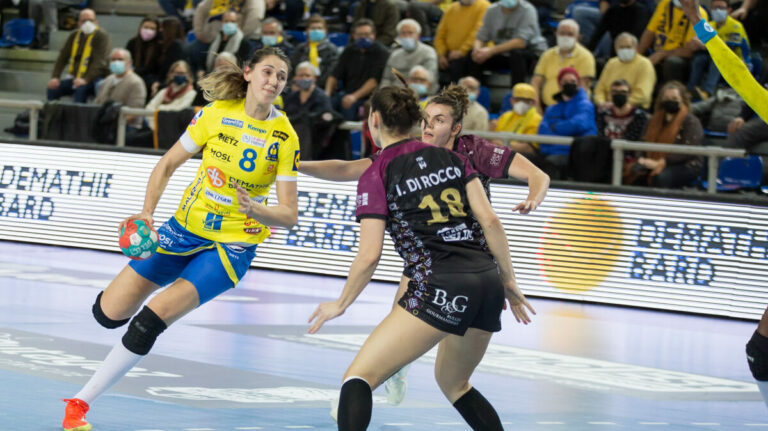 386 Metz Handball s’est compliqué la tâche face aux joueuses de Dijon avant de l’emporter sur le fil. C’est le plus petit écart des Messines depuis le début de la saison. De retour à la compétion après une trêve internationale, les Dragonnes ont peiné à remettre la machine en route face à une équipe de Dijon ambitieuse. À noter le retour dans le groupe de Bruna de Paula après avoir manqué plusieurs matchs. Tamara Horacek était quand à elle absente de ce déplacement, la feuille de match en championnat étant limitée à 14 joueuses. Metz Handball a connu des couacs d’entrée de jeu. Sarah Valero Jodar et Rosario Urban tiraient profit de premières minutes marquées par les imprécisions pour infliger un 3-0 en 6 minutes. Les réponses de Zaadi sur jet de 7 mètres puis de Nocandy ne suffisaient pas à rattraper ce mauvais départ et l’avance Dijonnaise s’étendait jusqu’à un sévère 7-2. La suspension pour deux minutes de Camila Micijevic n’arrangeait rien et il fallait attendre que la tendance s’inverse avec les sorties successives de Di Rocco et Clement pour que les Dragonnes retrouvent du mordant. Le score restait malgré tout défavorable après le passage de la marque des 20 minutes de jeu : 8-5. Toujours menées Les joueuses d’Emmanuel Mayonnade continuaient à oeuvrer à un retour collectif et ce malgré une nouvelle suspension de deux minutes, pour Sarah Bouktit cette fois, mais il fallait attendre la 26ème minute pour assister à un premier tournant du match. Charlène Guerrier écopait d’un carton rouge immédiat pour une faute au visage sur Bruna de Paula, contrainte de quitter le terrain sur blessure. Metz Handball en profitait pour resserrer l’écart dans les dernières minutes et revenir à 11-9 alors que l’arbitre sifflait la fin de la mi-temps. Un bras de fer Rapidement réduites à 6 en raison d’une faute de Valero Jodar, les Dijonnaises se faisaient rapidement rattraper au score (11-11, 33eme) et un bras de fer s’engageait durablement. Il fallait ainsi attendre la 48ème minute pour qu’un premier break messin se matérialise : 17-19. Les efforts de Manon Gravelle et Ilona Di Rocco le résorbaient mais l’entrée en jeu de Mélanie Halter brouillait les lignes alors que Chloé Valentini et Louise Burgaard scellaient l’avance et la victoire. Un ultime coup d’accelerateur bienvenu dans une rencontre maladroite qui aurait pu, sans complexe, basculer en faveur des Bourguignonnes. Score final : 22-25 Les stats de ce Dijon – Metz Handball Metz HandballIvana Kapitanovic (5 parades sur 25 tirs), Mélanie Halter (1/3) – Bruna de Paula, Chloé Valentini (1 buts sur 3 tentatives), Grace Zaadi (2/4), Camila Micijevic (3/4), Astride N’Gouan (3/4), Méline Nocandy (5/10), Debbie Bont, Orlane Kanor (5/7), Louise Burgaard (3/5), Laura Kanor (1/2), Sarah Bouktit (1/1), Adriana Cardoso (1/2). JDA Dijon HandballKristy Zimmerman (0 parade sur 1 tir), Petra Kudlackova (13/37) – Elise Delorme (1 buts sur 2 tirs), Alice Mazel, Manon Gravelle (4/7), Carmen Campos (1/2), Mégan Ribeiro (1/3), Charlène Guerrier, Anouck Clément, Ilona Di Rocco (2/8), Rosario Urban (7/10), Luna Marin, Sarah Valero Jodar (3/6), Celine Sivertsen (3/7). Crédit photo : Matthieu Henkinet (archive)