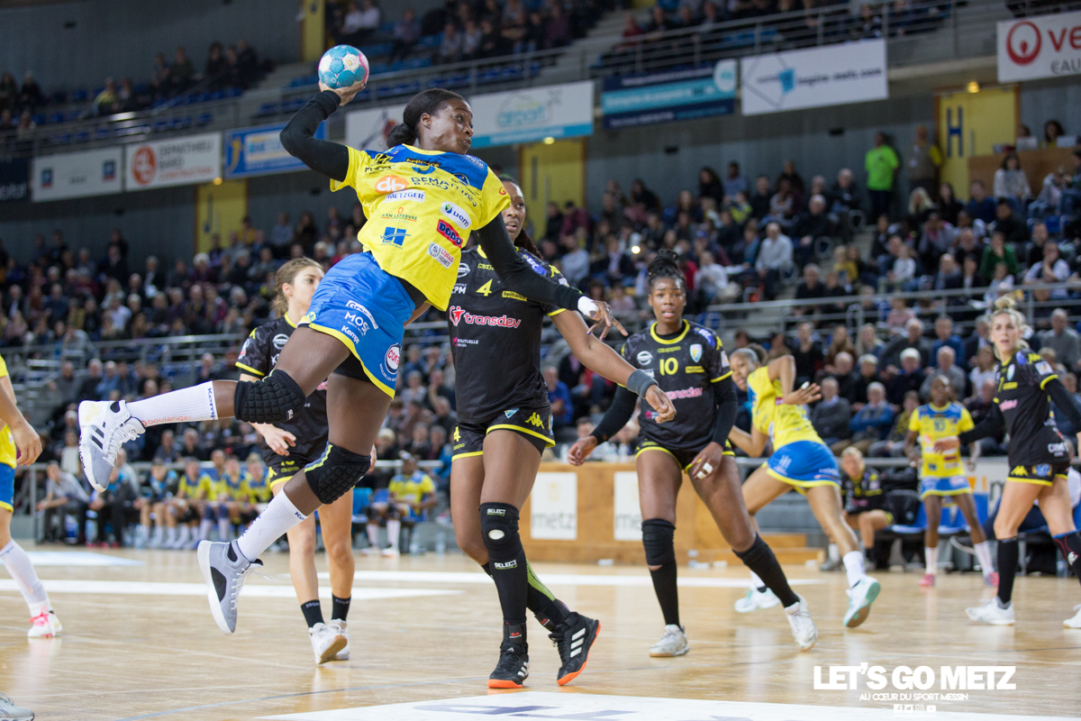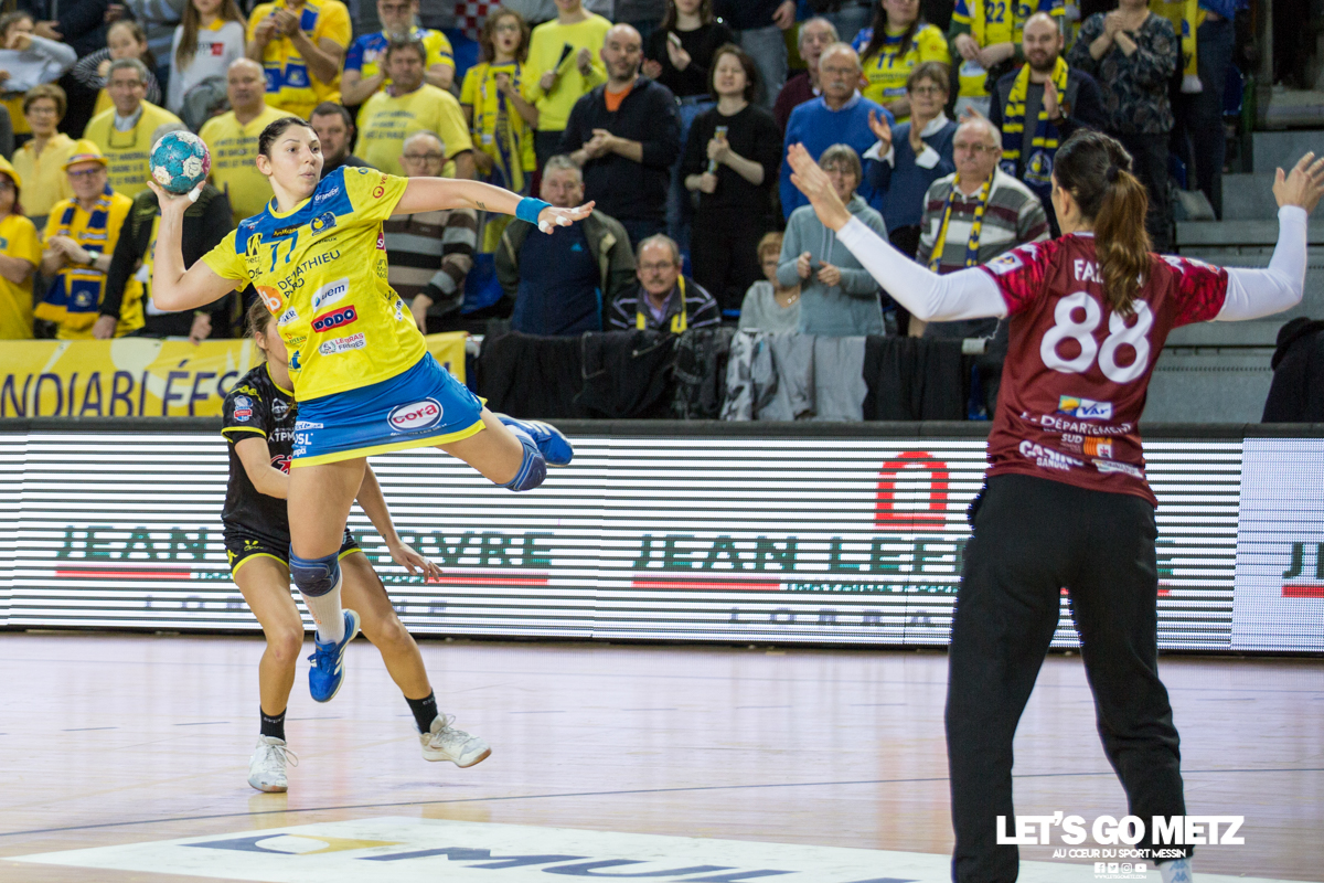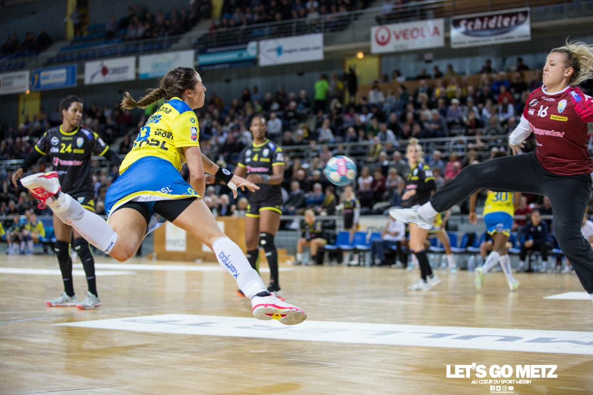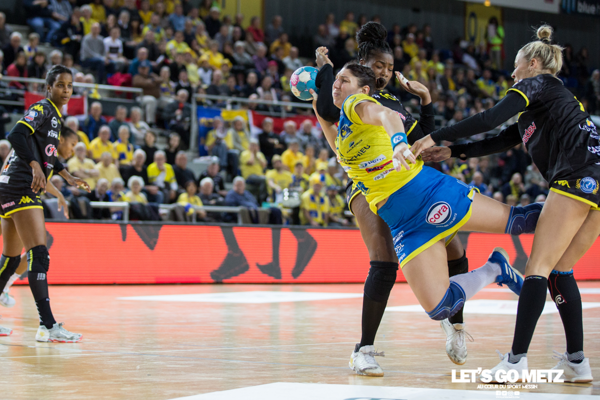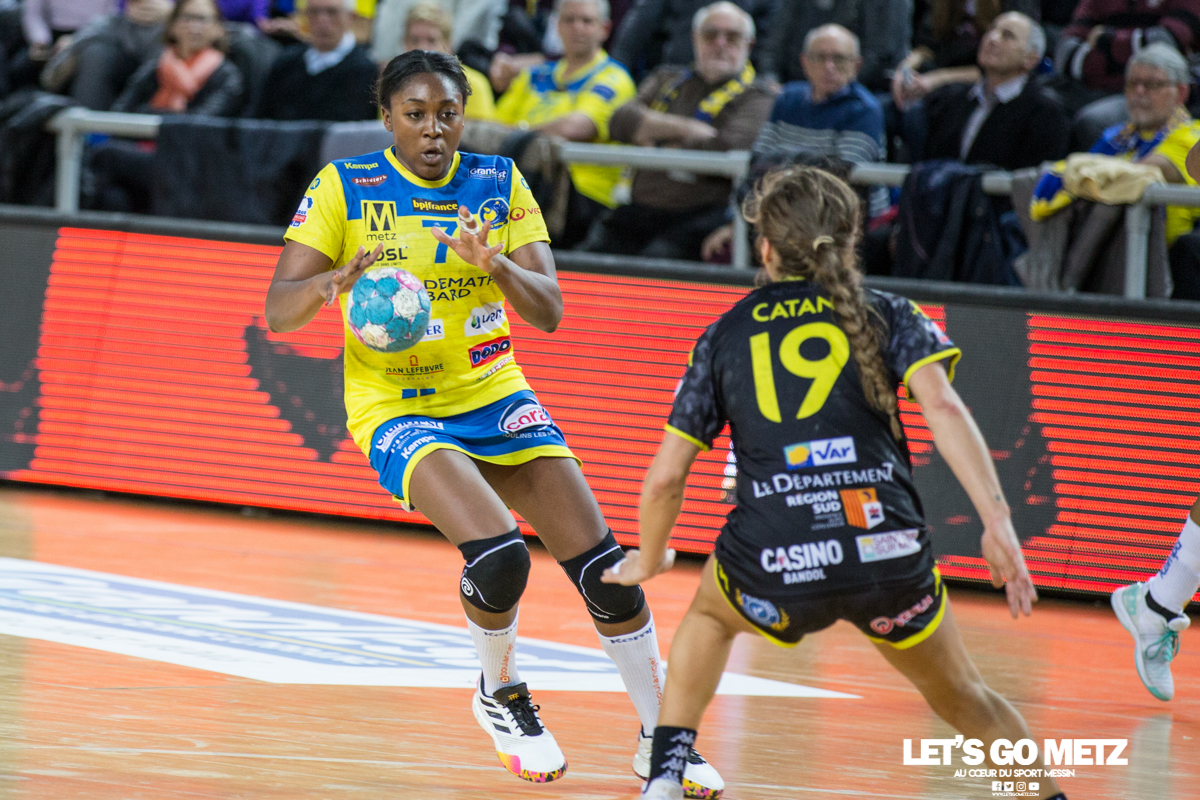 330 Elles étaient attendues au tournant et elles n’ont pas déçu. Les Dragonnes du Metz Handball ont su se défaire de l’équipe de Toulon Saint Cyr pour reprendre la première place de Ligue Butagaz Énergie ce Dimanche. C’est une belle après midi de handball qui s’est déroulée ce Dimanche aux Arènes. Après la belle victoire de la réserve face aux joueuses du JDA Dijon, c’était autour des professionnelles de faire le job face à Toulon Saint Cyr, avec un enjeu de taille : reprendre la tête du championnat. En effet, Brest ayant concédé un match nul la veille sur le parquet de Besançon, une victoire permettait à Metz de retrouver son fauteuil de leader. Première mi-temps C’est avec un 7 de départ revisité que Metz entame la rencontre. On sent là une volonté d’Emmanuel Mayonnade et d’Ekaterina Andryushina de faire respirer leur groupe. Les Dragonnes frappent les premières dans ce match avec un but de l’inévitable Orlane Kanor, dans son style aérien bien caractéristique. Marion Maubon semble elle en difficulté dans ces premières minutes avec deux face-à-face manqués alors qu’Ivana Kapitanovic se signale en repoussant un premier jet de 7 mètres. La gardienne toulonnaise, Léa Serdarevic semble décidée à stopper les ailières messines puisqu’elle repousse la tentative de Laura Flippes dans un nouveau face-à-face. Marion Maubon débloque enfin son compteur et inscrit 2 buts de suite. 4-2 Metz Les deux gardiennes affichent un pourcentage d’arrêts insolant en ce début de match, avoisinant les 50%. Metz prend une petite avance de 7-5 au bout de 15 minutes de jeu, Sandor Rac prend temps mort pour éviter de voir son équipe distancée. En sortie de temps-mort, Toulon se procure un jet de 7 mètres très discutable. Ivana Kapitanovic sort le grand jeu avec une double parade exceptionnelle pour réparer l’injustice ! La gardienne Croate est rentrée dans la tête des toulonnaises puisque quelques secondes plus tard un nouveau jet de 7 mètres, tenté par Jessy Kramer passe largement au-dessus de la cage. De son côté, Serdarevic imite son homologue messine avec un arrêt de grande classe devant Astrid N’Gouan. Il se passe alors près de 5 minutes sans que le moindre but ne soit marqué ! Il faudra une réalisation de Méline Nocandy pour arrêter cette série. 8-5 Metz Metz Handball trouve de plus en plus de solutions dans cette défense toulonnaise. Grâce Zaadi sert Astrid N’Gouan d’une passe aveugle sublime et lance sur orbite Ailly Luciano sur l’attaque suivante, pour deux buts. 13-7 Metz C’est sur ce score de 13-7 en faveur de Metz que les deux équipes regagnent les vestiaires. Les Dragonnes mènent logiquement de 6 buts, au cours d’une première période globalement maîtrisée. Deuxième mi-temps Ce début de deuxième période laisse penser que les Dragonnes ne sont pas totalement revenues des vestiaires, Toulon en profiter pour scorer par deux fois. Il faudra attendre 4 minutes 30 pour voir Metz débloquer son compteur grâce à Louise Burgaard. L’internationale danoise est clairement la joueuse en forme de ce début de second acte, avec 3 des 4 buts messins dans ces 10 premières minutes de jeu. 17-10 Metz Ce léger flottement au retour des vestiaires n’aura pas entamé la domination des Dragonnes sur ce match, notamment en défense où Ivana Kapitanovic continue son show, valorisant le travail de ses coéquipières devant elle, qui contestent beaucoup de tirs toulonnais. Méline Nocandy inscrit elle son 4ème but du match sur un jet de 7 mètres et porte l’avance messine à 8 buts à la 45ème minute de jeu. 19-11 Metz Metz Handball maîtrise son sujet mais la soirée sera ternie par une triste blessure… Touchée au genou, Manon Houette est contrainte de quitter les siennes, portée vers les vestiaires par le président Thierry Weizmann et la kiné Ines Fontanarosa. On croise les doigts pour l’ailière internationale… Cependant, show must go on aux Arènes et les Dragonnes finissent le match avec Méline Nocandy à l’aile gauche, étant donné que Marion Maubon est également sortie sur blessure en première mi-temps. A noter également l’entrée de Laura Portes, qui va finir la rencontre après avoir disputé 30 minutes plus tôt dans l’après-midi avec la réserve. Les Dragonnes portent tranquillement leur avance autour de la dizaine de buts, la jeune Ilona Di Rocco participe également à la fête avec 2 buts. Metz s’impose finalement 31-18 dans une rencontre dominée de la tête et des épaules et reprend donc son fauteuil de leader, aux dépends de Brest. La Dragonne du match Nous l’avions nommée « Joueuse en forme » dans notre Avant Match et elle n’a pas déçu. Avec 6 buts à 100% de réussite, Méline Nocandy a fait honneur à sa titularisation dans le « 7 de départ » en terminant meilleure buteuse du match, c’est tout logiquement qu’elle est notre Dragonne du match. La jeune demi-centre est particulièrement en forme ces dernières semaines, ce qui est de bonne augure pour le tour principal de Ligue des Champions qui va arriver prochainement. Elle a par ailleurs accepté de répondre à nos questions à l’issue de la rencontre. Les stats Metz Handball Kapitanovic (13 arrêts / 26 tirs), Portes (2/7) ;Zaadi (0 buts / 3 tirs), Flippes (1/3), N’Gouan (4/7), Nocandy (6/6), Houette (1/3), Kanor (2/4), Di Rocco (2/2), Burgaard (4/7), Sajka (4/7), Maubon (2/4), Luciano (2/2), Perederiy (3/4) Toulon St Cyr Serdarevic (15 arrêts / 40 tirs), Falcon (0/6)Gnabouyou (1 but / 4 tirs), Rozemalen (2/5), Kramer (2/4), N’Diaye (5/8), Surmely (3/4), Catani (3/5), Abdourahim (1/6), Eradze (1/1), Cvijic (0/2) Crédit Photo : Matthieu Henkinet