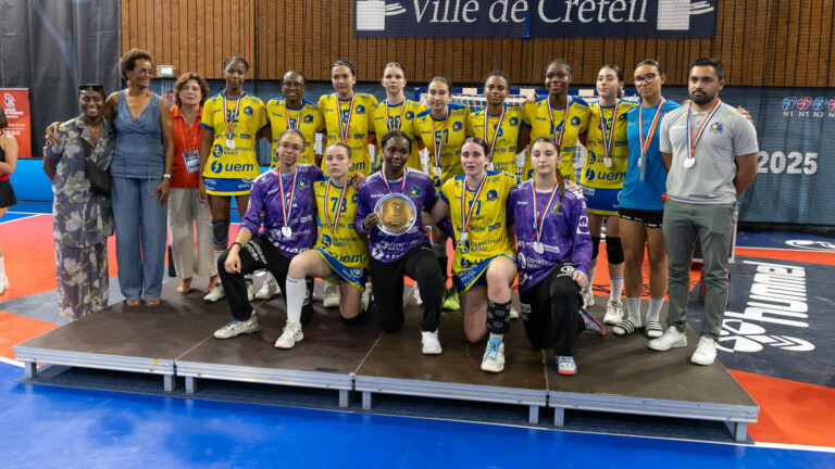 2,1K Pour la première fois depuis 2019, l’équipe du centre de formation de Metz Handball disputait la finale de Nationale 1 Féminine (N1F) ce samedi 14 juin 2025. C’est un évènement qui laissera certainement des remords à tout l’effectif. Après avoir récolté 22 victoires en 22 matchs de saison régulière, l’équipe de Nationale 1 Féminine de Metz Handball s’attelait à une finale face aux championnes ultramarines de la Case Cressonnière. En ligne de mire, un sacre de championnes de la division, mais le rêve n’a pas été au rendez-vous. Bien préparées, les jeunes Dragonnes sont arrivées à Créteil le couteau entre les dents, cela ne les a pas empêché de prendre l’enjeu de l’évènement en plein visage au coup d’envoi de la rencontre. Dans une salle bouillante en terme de thermostat comme en terme d’ambiance, les jeunes femmes ont perdu leur handball. Passes dans les pieds, cafouillages dans les remplacements, tirs maladroits et défense perméable, jusqu’à accuser un retard de cinq buts (14-09, 23ème). Malgré un sursaut, permis par plusieurs parades de Fatima Camara, le retard à la pause restait important (15-11, mt). Du mieux dans le second acte Après des échanges musclés dans le vestiaire à la mi-temps, l’équipe revenait avec un visage bien différent. Dans un premier temps il s’agissait de rendre coup pour coup face au but pour stabiliser l’écart à deux unités (18-16, 37ème). Progressivement l’ouverture se créait et une première égalisation se présentait (18-18, 38ème). Cressonnière ne se laissait pas renverser si facilement et reprenait un avantage de deux buts (20-18, 42ème). Il fallait piocher dans les ressources de Ludyvine Kaakil-Talaba et surtout d’Yvana Atangana pour remettre le score de niveau (21-21, 51ème) avant que Claire Koestner parvienne enfin à donner l’avantage aux joueuses en jaune et bleu (21-22). Plusieurs ballons de +2 se présentaient, comme autant d’occasions de casser définitivement le moral des ultramarines, mais Metz Handball ne parvenait pas à concrétiser et la partie se terminait sur un score nul : 27-27. Le format de la compétition ne prévoyant pas de prolongation, c’est aux jets de sept mètres que la victoire s’est alors disputée. A bout de ressources physiques, mais surtout mentales, Metz Handball passait à travers, permettant à la Case Cressonnière de soulever le trophée au terme des échanges.Score final de cette finale de N1F entre Case Cressonnière et Metz Handball : 31-28 (après jets de sept mètres) Ce résultat cruel de la finale entre ultramarines et métropolitaines laissera naturellement un souvenir amer aux participantes comme à leur encadrement, mais ne doit pas venir entacher le bilan incroyable de la saison des jeunes Dragonnes. Meilleure équipe des quatre poules en saison régulière avec un bilan parfait, la « réserve » de Metz Handball a surpassé les attentes de début de saison. S’il manque évidement un trophée au retour à Metz, les joueuses repartent avec une véritable leçon à digérer. Celles qui débuteront leur carrière au niveau professionnel la saison prochaine, comme Fatima Camara et Claire Koestner, ne manqueront pas d’en tirer les enseignements.Dans quelques semaines, le centre de formation de Metz Handball s’animera à nouveau, avec un groupe remanié, pour tenter de défier à nouveau les attentes et continuer d’incarner une menace pour sa poule de Nationale 1 Féminine. Les stats de la rencontre Metz HandballCamara (18 parades), Rodrigo da Costa, IsabelinhoAbabsa (1 but sur 1 tir), Atangana (11/15), Castets (1/4), Etilopy (1/3), Giliberto (0/1), Gooroosamy, Goval (4/9), Holler (3/5), Kaakil-Talaba (3/3), Koestner (4/10). Case CressonnièreFourez (13 parades), Turpin (1 parade)Babou-Carimbacasse (3 buts sur 4 tirs), Apavou, Dewez (9/17), Francomme, Hivanoe (2/2), Kerbidi (1/2), Nice (5/9), Payet (3/5), Pidolphe (5/9), Randrianasolo, Simon (2/4), Ziegler (1/7). Crédit photo : Matthieu Henkinet