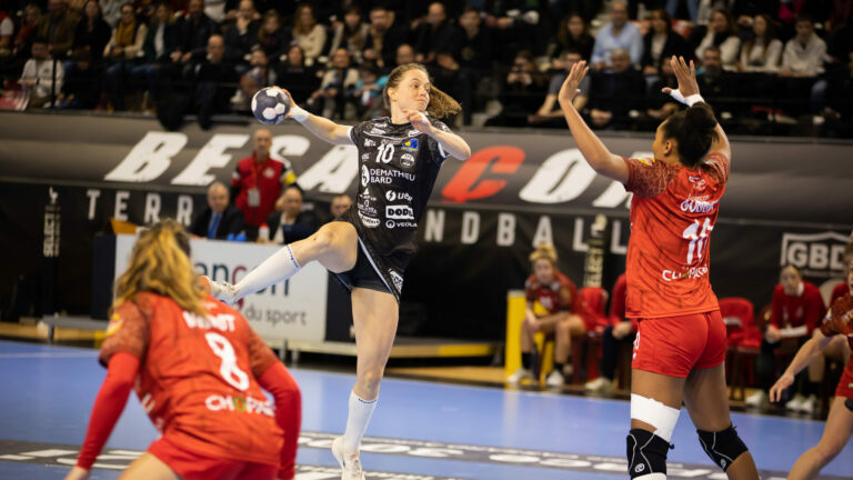 621 Quelques jours après un déplacement compliqué en Norvège, les Dragonnes de Metz Handball sont parvenues à s’imposer 29-37 face à l’ES Besançon. En déplacement mercredi soir en Franche-Comté pour y retrouver un historique adversaire, les Messines se sont logiquement imposées face à l’équipe Bisontine. Les « Engagées » auront montré quelques signes de souffrance et de manque de moyen physique. Privées notamment d’Audrey Dembelé et d’Alizé Frecon ainsi que de Camille Aoustin et Ivana Dezic, l’équipe de Sebastien Mizoule a pourtant essayé de résister et d’exister de la plus belle des manières, sans pour autant trouver de la réussite. Sous l’impulsion d’une Kristina Jorgensen de feu, Metz Handball a globalement réussi sa rencontre. Même si quelques points restent perfectibles, notamment dans la gestion des émotions en fin de rencontre, les Dragonnes s’imposent avec la manière. Metz Handball, moteur diesel En début de rencontre, les deux équipes se rendaient coup pour coup pendant plus de dix minutes. Les messines, défensivement un poil trop tendre, laissaient Lucie Granier et ses coéquipières en profiter quelques instants. Devant plus de 2000 personnes, les Franc-Comtoises obligaient Metz Handball a élever son niveau de jeu. Mais la bataille était de courte durée. Debbie Bont et Louise Burgaard permettaient aux Messines de prendre les devants au quart d’heure de jeu pour s’envoler définitivement.Jamais inquiété, mais pas forcément toujours rassuré, Emmanuel Mayonnade effectuait quelques rotations, qui auront donné de bonnes surprises, notamment dans le cas de Valeriia Maslova, plus libérée qu’à l’accoutumée. Avec un avantage de six buts à la mi-temps, les Dragonnes continuaient d’appuyer sur l’accélérateur. Score à la mi-temps : 13 – 19 Face à un adversaire généreux offrant de nombreuses balles de contre, Metz Handball passait alors la seconde. La solution aura finalement été un jeu rapide, notamment par l’intermédiaire de Chloé Valentini, laissant Besançon, loin derrière dans le rétroviseur. Malgré une Sakura Hauge des grands soirs, les errements défensifs bisontins s’avéraient trop maladroits. Manque de concentration ou trop attentistes, les partenaires de Pauline Robert subissaient les assauts messins. Sanctionnées de deux minutes à huit reprises, les joueuses de l’ESBF n’ont pas pu développer leur jeu comme espéré. Contraintes à courir derrière le score tout au long du match, jamais les joueuses de Sébastien Mizoule ne sont parvenues à recoller. Metz Handball continue sa course en tête avec une treizième victoire en autant de rencontres. Score final de ce Besançon – Metz Handball : 29 – 37 Les stats de la rencontre Metz HandballDepuiset (9 parades sur 28 tirs), Sako (0/9)de Paula (5 buts sur 6 tirs), Valentini (6/9), Jorgensen (10/15), Horacek (3/3), Bont (3/3), Burgaard (3/3), Kanor (0/3), Bouktit (1/2), Schulze (1/1), Maslova (4/8), le Blevec (1/1) BesançonHauge (9 parades sur 32 tirs), Lerstad (2/14)Roy (3 buts sur 6 tirs), Mairot (9/11), Cuenot (0/1), Cusset (3/3), Tshimanga (2/4), Robert (1/1), Granier (2/3), Faure (2/2), Zazai (2/5), Nosek (0/4), Corovic (5/7) Crédit photos : Lucas Deslangles/ Let’s Go Metz