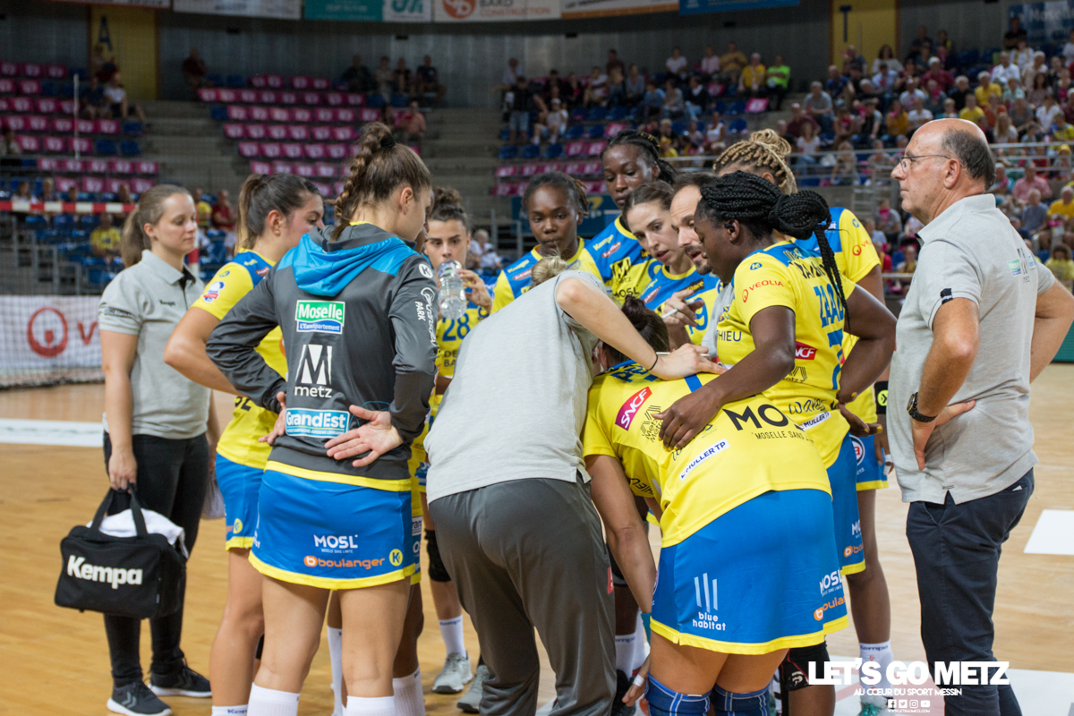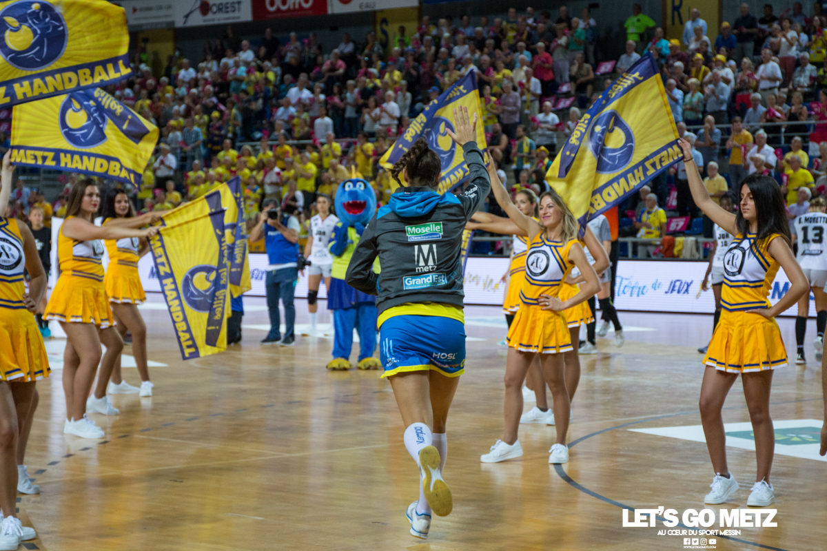 613 Quatre jours seulement après le début de cette saison de Ligue Butagaz Énergie (ex LFH) face au Nantes Atlantique Handball, les Dragonnes sont de retour aux affaires pour affronter le JDA Dijon aux Arènes. Il n’y a toujours pas de diffuseur télé en vue, malgré l’alerte lancée par la LFH et de nombreuses personnalités du sport, pourtant le public ne semble pas de prime abord s’être déplacé en masse pour observer de ses propres yeux ce retour des Dragonnes dans leur antre des Arènes de Metz, après trois mois d’absence. La faute peut être à la rentrée des classes ou à un manque de médiatisation, la presse ayant été accaparée cette semaine par le match FC Metz – PSG en football… Malgré tout, à 45 minutes du coup d’envoi, les groupes de supporters commencent à se rassembler dans les gradins et accrochent une banderole remerciant les joueuses pour la saison passée, le jaune reprend ses droits. Il y a des indéfectibles qui tiendront toujours leur rang en tribune et c’est aussi cela qui fait la renommée d’une équipe… Comme nous l’évoquions dans notre « Avant-Match », cette équipe de Dijon n’est pas du genre à faire trembler les joueuses Messines. Malgré tout, le match de Mercredi face à Nantes a laissé entrevoir certaines difficultés dans le jeu des Dragonnes et il ne faudrait pas faire preuve d’excès de confiance sous peine de les voir exploitées. Il faudra également trouver les moyens de stopper une Déborah Kpodar en pleine confiance après son 11/16 au tir lors du match précédent. L’échauffement va bon train, dans la bonne humeur et toutes les joueuses semblent en pleine forme. Quelques minutes avant le coup d’envoi, le speaker profite de cette première sortie aux Arènes cette saison pour saluer les messines récompensées lors du All Star 2019, particulièrement la dernière MVP du championnat, Xenia Smits qui, on le rappelle, manquera la première moitié de la saison en raison d’une blessure. . . La première mi-temps De retour devant leur public, les Dragonnes entament cette 2ème journée de Ligue Butagaz Energie avec un 7 de départ remanié : Kapitanovic, Flippes, Sajka, N’Gouan, Zaadi, Kanor et Houette prennent place sur le terrain. La jeune gauchère Marie Helène Sajka confirme son retour en grâce au Metz Handball en inscrivant le premier but du match. La gardienne dijonnaise, Lena Le Borgne se distingue quant à elle en repoussant successivement les tentatives d’Ailly Luciano, Laura Flippes et Manon Houette. Ivana Kapitanovic n’est elle non plus pas en reste en ce début de match. Les deux gardiennes affichent assez tôt un pourcentage d’arrêt assez affolant, avoisinant les 50%. Le début de match poussif des Dragonnes vaut à Emmanuel Mayonnade de prendre son premier temps mort, à 6 – 6 au bout d’un quart d’heure de jeu. Ce temps mort du tacticien messin aura eu le mérite de rebooster ses joueuses qui infligent dans la foulée un 6 – 1 à leurs homologues dijonnaises en à peine 7 minutes. Christophe Mazel n’a pas d’autre choix que de stopper le jeu pour limiter l’hémorragie. Non déstabilisées par ce temps mort, les messines continuent de jouer leur jeu et rentrent aux vestiaires avec une avance de 7 buts : 18 – 11, dont un glané par la gardienne Ivana Kapitanovic, qui profite de la cage dijonnaise vide pour conclure de fort belle manière. A noter la belle première mi temps de Marie Helène Sajka, meilleure buteuse du match avec 4 réalisations dont 2 jets de 7 mètres. . La seconde mi-temps Les jaunes et bleues reviennent des vestiaires avec un 7 composé de Kapitanovic, Ballureau, Kanor Nocandy, Perederiy, Burgaard et Luciano. La domination sans conteste du Metz Handball se caractérise par une nouvelle série : 4 – 1 en 6 minutes pour entamer le second acte, avec plusieurs stops défensifs récompensés par des buts faciles en transition. En gestion, Metz maintient tranquillement son avance autour de la barre des 10 buts d’écart. Marie Hélène Sajka continue quant à elle sa moisson aux jets de 7 mètres et conforte de loin sa place de meilleure buteuse du match. Emmanuel Mayonnade profite de l’avance pour poursuivre le turnover et offrir du temps de jeu à toutes ses joueuses. Il se permet même de garder Laura Glauser sur le banc pendant la quasi intégralité du match. Laura Flippes, qui était la seule joueuse de champ à ne pas avoir encore scoré, y est allée de son petit but en fin de match. Metz Handball s’impose finalement de 14 buts pour son retour aux Arènes: 35 – 21. . Notre joueuse du match Ivana Kapitanovic est à nos yeux la joueuse du match. Elle a réussi à réaliser un total percutant de 20 arrêts sur 40 tirs tentés. Un joli 50% de réussite qui a certainement écœuré les joueuses dijonnaises. La gardienne a également marqué un but, profitant de l’absence de la portière adverse. A l’issue de la rencontre, elle a répondu à trois de nos questions. LGM: Avec 20 arrêts sur 40 et un match énorme, c’est important de revenir aux Arènes et de marquer les esprits? IK: Oui bien sûr, après notre belle prestation à Nantes c’était génial de revenir aux Arènes et de bien entamer cette saison devant notre public. LGM: Vous avez joué la quasi intégralité de la rencontre, est-ce primordial pour vous de bénéficier d’autant de temps de jeu? IK: C’est très important, nous avons une très bonne rotation avec Laura. Quand elle est moins bien, je peux prendre sa place et inversement. Notre relation est très saine et c’est très important pour nous d’être les meilleures possible pour la compétitivité du groupe. LGM: La saison est longue, j’imagine qu’il fallait afficher le meilleur visage possible dès le début ? IK: Évidemment, nous voulons chacune être à notre meilleur niveau. C’est le plus important pour un duo de gardiennes. Interview retranscrite de l’anglais par nos soins La conclusion Large v