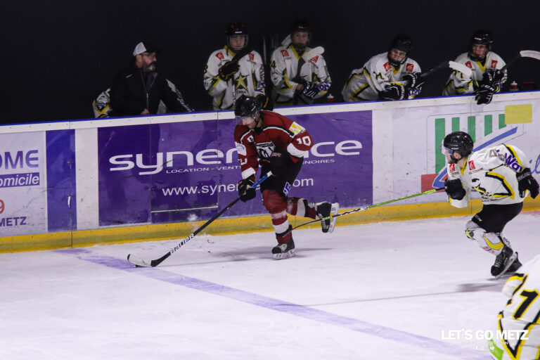 588 Le déplacement de Metz Hockey Club chez les Gaulois de Châlons-en-Champagne, seule équipe à avoir battu les Graoullys cette saison, s’annonçait compliqué. Mais le club Mosellan a pris sa revanche, et par la même occasion, confirmé sa première place au championnat. Le Metz Hockey Club ne s’arrête plus ! Dans un match haletant, les Lorrains ont su faire la différence en prenant leur revanche face aux Gaulois de Châlons-en-Champagne. En effet, lors du match d’ouverture de la saison, les Messins s’étaient inclinés 5 buts à 2 sur leur glace. Ce samedi, dans une rencontre serrée, les Graoullys se sont mis à l’abri à seulement une minute du terme. Un match où les deux équipes ne se sont jamais réellement lâchées. Même si le premier tiers-temps a tourné en faveur du Metz Hockey Club, grâce à une réalisation de Yannick Hamri. Dans le deuxième tiers-temps, Metz prenait même rapidement un deuxième but d’avance grâce à Aurélien Klesmann. Pourtant, Châlons-en-Champagne n’a jamais abandonné, et les Gaulois sont revenus à égalité. Yannick Hamri, en feu, redonnait l’avantage à Metz en fin de deuxième tiers-temps puis aggravait le score dans le troisième acte (4-2). Les hôtes de cette rencontre parvenaient à réduire l’écart, mais cela ne fut pas suffisant. Les Graoullys, en toute fin de match, poussaient une nouvelle fois la rondelle au fond des filets grâce à Nathan Casula. Score final, 5-3. Châlons-en-Champagne 3 – 5 Metz Hockey Club Tiers-Temps : 0-1, 2-2, 1-2. Buts pour Metz : Hamri (03’27, 36’49, 47’13), Klesmann (20’32), Casula (59’01) ; pour Châlons-en-Champagne : Goncalves (32’29), Mikula (33’19), Pernot (56’59). Statistiques Lapkov 3 points (3 assists) Hamri 3 points (3 buts) Klesmann 2 points (1 but, 1 assist) Casula 1 point (1but) Zeliska 1 point (1 assist) Classement de la Poule C de Divison 3. Un départ au Metz Hockey Club Arrivé à Metz en mai 2020, Thomas Dubourg quitte le club pour des raisons professionnelles. Le défenseur aura joué son dernier match dans les rangs messins face à Strasbourg. Couleurs avec lesquels il aura participé à 27 rencontres, inscrits 11 buts et délivré 13 passes décisives. Ses désormais ex-partenaires lui auront rendu un bel hommage avec cette victoire éclatante. View this post on Instagram A post shared by Metz Hockey Club (@metzhockeyclub) Crédit photo : Lilian Bordron/LGM