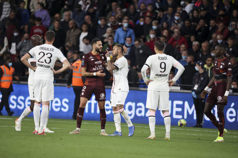 957 Devant près de 30.000 spectateurs survoltés, le FC Metz a livré une prestation énorme face au PSG, avant de craquer dans le money time. Les Grenats, battus 2-1, n’ont pas été aidés par des décisions arbitrales très litigieuses en faveur du club de la Capitale. Ils avaient pourtant livré le match presque parfait… Les joueur du club à la Croix de Lorraine, derniers de Ligue 1, étaient dos au mur avant d’affronter le PSG. Tous les éléments étaient contre les Grenats avant la rencontre. Néanmoins, le FC Metz a fait trembler le club de QSI jusque dans les derniers instants du match, avec un courage et une combativité exemplaires.Les parisiens ouvraient pourtant rapidement le score par l’intermédiaire d’Achraf Hakimi (5′). La crainte d’un score de tennis en plein Moselle Open s’emparait alors des esprits messins. Mais les protégés de Frédéric Antonetti, poussés par un grand Saint-Symphorien, ne se sont pas démobilisés. Kiki Kouyaté égalisait d’un coup de tête rageur sur un corner de Lamine Gueye (39′).La suite, on la connaît. Les efforts grenats étaient réduits à néant par un nouveau but d’Achraf Hakimi en toute fin de match (90+5′). Un épilogue rocambolesque marqué par de très nombreux faits de jeu que nous évoquerons par la suite. Metz-PSG : Un 4-3-3 de gala ! Lamine Gueye malheureux face à Keylor Navas. Photo : ElyxandroCegarra/Panoramic Bien qu’il ait buté sur Keylor Navas en toute fin de première période, Lamine Gueye a délivré une prestation époustouflante. Passeur décisif, l’ancien palois était dans tous les bons coups messins. Lamine Gueye est le symbole d’un 4-3-3 surprise de Frédéric Antonetti qui a brillamment fonctionné.A gauche, son pendant Pape Ndiaga Yade n’a pas non plus été avare d’efforts et a livré une belle prestation. Quant à Ibrahima Niane, il a été intéressant dos au but et dangereux en contre à l’image de ses compères.Le FC Metz n’a eu le ballon que 24% du temps face au PSG, mais les incursions messines dans la défense parisienne ont très souvent été dangereuses. Les qualités de vitesse (notamment) du trio made in Génération Foot ont été magnifiées ce mercredi. Une réorganisation tactique discutable ? Derrière le changement parisien, Frédéric Antonetti sortait trois joueurs de son chapeau… Photo : ElyxandroCegarra/Panoramic A la 65ème minute, Frédéric Antonetti effectuait un triple changement ! Boulaya, De Préville et Niakaté IN. Gueye, Niane, Yade OUT. Il procédait ainsi à une réorganisation tactique pour repasser en 3-5-2, avec Farid Boulaya en soutien de Nicolas De Préville. L’entraîneur messin acceptait ainsi de subir encore davantage les assauts parisiens.Chaudement ovationné par Saint-Symphorien, Farid Boulaya s’est montré plutôt discret et n’a eu que peu de ballons à se mettre sous la dent. De son côté, Nicolas De Préville n’a guère été plus en vue mais a été très actif dans les basses besognes, gagnant notamment de nombreux duels face à Marquinhos.Si ces deux joueurs techniques ont pu garder quelques ballons, on a tout de même le sentiment qu’Antonetti s’est privé de la vitesse de son trio d’offensifs titulaires. Le FC Metz s’est en effet procuré moins de situations en contre depuis cette réorganisation.Cependant, le PSG ne s’est pas vraiment montré dangereux sur la fin de match. La défense messine renforcée par l’entrée de Sikou Niakaté a plutôt bien contenu les assauts parisiens. Mais cela, c’était avant que Jérémie Pignard ne s’en mêle. Metz-PSG : Un arbitrage lamentable Frédéric Antonetti a été expulsé par Jérémie Pignard en toute fin de match. (Photo : DR) Comme dimanche soir au Parc des Princes face à l’Olympique Lyonnais, l’arbitre a eu un rôle majeur dans la partition du PSG à Saint-Symphorien. Tout d’abord en début de seconde période lorsqu’il choisit de ne pas siffler une main évidente d’Hakimi dans la surface de réparation, qui aurait été synonyme de penalty. L’action n’a pas été rappelée par la VAR. « La VAR marche pas M’sieur Henry ».Pignard décida alors de jouer les shériffs et dégoupilla complètement en sortant un deuxième carton jaune à Dylan Bronn. Le capitaine messin est alors expulsé pour gain de temps. Du jamais vu. L’arbitre s’offrait alors un doublé en infligeant un second carton rouge à Frédéric Antonetti, sans doute victime de sa mauvaise réputation.L’entraîneur messin ne semblait pas être le plus véhément sur le bord de touche. Son adjoint Benoît Tavenot était en effet fou furieux (à juste titre ?) après l’expulsion de Dylan Bronn. Les messins allaient alors craquer à 10 contre 11. L’attitude minable de Kylian Mbappé Kylian Mbappé ne sortira pas grandi de cette rencontre. (Photo : ElyxandroCegarra/Panoramic) Auteur d’une prestation plus que moyenne, Kylian Mbappé s’est surtout fait remarquer par son attitude détestable. Le « génie » français s’est d’abord illustré d’une bien mauvaise manière en tentant de lober Alexandre Oukidja (84′) alors qu’il était censé rendre le ballon aux messins.Le portier grenat a dû grandement s’employer pour empêcher l’ancien monégasque de marquer. Un geste avilissant et un manque de fair-play éhonté qui a rendu furieux Oukidja et ses coéquipiers. Pire encore, l’international français est allé haranguer le gardien messin après le second but du PSG.Un comportement inexcusable et indigne d’un joueur admiré par de nombreux enfants amoureux du ballon rond. Une attitude qui démontre que le flop de l’Euro 2021 est tout sauf un grand joueur. Frédéric Antonetti l’a d’ailleurs souligné en conférence de presse. #FCMPSG Frédéric Antonetti : « Kylian Mbappé aurait intérêt à avoir un autre comportement s’il veut être aimé. J’adore ce joueur mais il gagnerait à avoir un autre comportement. »— Angelo Salemi (@Ang