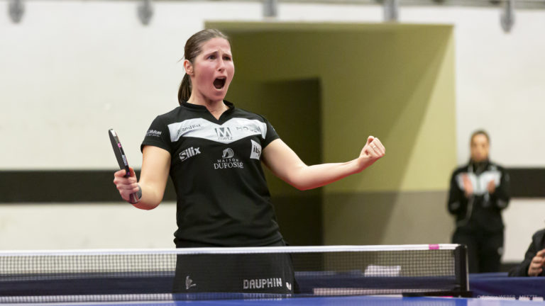 491 Ce mardi soir au Palais des Sports, les filles du Metz TT recevaient l’équipe de Quimper CTT pour cette 3e journée de championnat de France de Pro A Dames. Alors qu’on pensait le match plié à 2-0 en faveur des messines, les quimpéroises piquées au vif sont revenues à 2-2 avant de lâcher prise dans le dernier match de la soirée. Les filles de Loïc Belguise ont eu chaud, mais ces dernières ont pu faire plaisir à leur public et restent invaincues à domicile en championnat ! Grâce à ce succès, les messines font une bonne opération et remontent à la 3e place du classement. Daniela Monteiro-Dodean vs Eva Andorin Début de match accroché entre Daniela Monteiro-Dodean et Eva Andorin, les 4 premiers points se répartissent équitablement. 2-2 La messine va cependant accélérer de manière tonitruante et inscrire 5 points de suite. 7-2 La fin du set ne sera qu’une formalité pour Monteiro-Dodean qui l’emporte finalement 11-4. L’emprise de Daniela sur ce match s’intensifie dans ce second set puisqu’elle ne fait qu’une bouchée de son adversaire pour mener rapidement 8-2. Toutefois, Andorin se rebiffe avec 3 points de suite pour recoller à 8-5. Insuffisant cependant, le set revient à Daniela Monteiro-Dodean sur le score de 11-5. Le troisième set ne sera qu’une simple formalité pour Daniela Monteiro-Dodean. Bien que le score de 11-7 soit plus flatteur que celui des manches précédentes pour Eva Andorin, la pongiste de Quimper n’aura rien pu faire face à Monteiro-Dodean qui s’impose facilement 3 sets à 0. Carole Grundisch vs Li Xue Début de partie prometteur pour Carole Grundisch qui mène rapidement 3-1 face à Xue Li mais la pongiste bretonne se ressaisit immédiatement grâce à 3 points d’affilée. Les deux compétitrices se livrent une bataille acharnée et portent le score à 6-6. La messine prend le dessus dans cette seconde partie de set grâce à 3 points de suite. 9-6 Xue Li ne lâche rien et voit ses efforts récompensés, elle recolle à 10-10 en sauvant 2 balles de sets. Grundisch a clairement laissé passer sa chance et concède la première manche 12-10. Le momentum est clairement du côté breton, Xue Li mène rapidement 5-2 mais Carole s’accroche pour rester dans la partie. 5-6 Menée une nouvelle fois de 3 points, la messine continue de résister et inscrit 4 points de suite pour prendre les commandes 9-8. Temps-mort Quimper. Ce temps-mort fut infructueux puisque Carole conclut la manche 11-9, grâce à un coup de pouce du filet. 1 set partout ! Grundisch est tout simplement irrésistible et continue sur la lancée de son second set pour mener 6-0 dans la troisième manche ! Son avance sera irréversible et elle basculera en tête en remportant ce troisième set sur le score de 11-5. Dos au mur, Xue Li joue son va-tout dans cette quatrième manche. Elle mène rapidement 6-4 en faisant parler ses qualités de défense. La joueuse née en Chine écœure littéralement son adversaire en repoussant toutes ses attaques et se procure trois chances d’égaliser à 2 sets partout. 7-10. Elle ne manquera qu’une seule de ses trois occasions et conclut finalement la manche 11-8. C’est le cinquième et dernier set qui déterminera l’issue de ce match. L’indécision est totale dans ce début de dernière manche, le score est de 3-3. Carole se détache légèrement et prend une avance à 7-5 suite à plusieurs points âprement disputés. Xue Li recolle à 7-6 mais le clan messin prend temps mort pour éviter que le momentum ne change de camp. Le temps-mort fut concluant puisque Grundisch se procure trois balles de match. 10-7 La première est sauvée mais la deuxième sera la bonne ! Carole fait craquer la défense de Xue Li et s’adjuge cet ultime set 11-8, au terme d’une rencontre riche en émotions. Pauline Chasselin vs Hannah Haponova Début de set compliqué pour Pauline Chasselin qui commet beaucoup de fautes directes et se retrouve rapidement menée 4-8. Hannah Haponova en profite pour conclure assez finalement ce set 5-11. Le premier temps mort de ce match est demandé par l’entraîneur messin alors que Pauline est menée 0-2 dans le second set, ce qui semble rebooster la messine qui revient à 4-4. Pauline Chasselin mène maintenant 10-8 et s’offre deux balle de set. Malheureusement, l’ukrainienne ne lâche rien et égalise à 10-10. Mais c’est finalement la lunévilloise qui aura le dernier mot : 12-10. Pauline Chasselin mène rapidement 4-0 dans ce troisième set et semble en pleine confiance. La pongiste quimpéroise est en pleine détresse et cherche du regard son entraîneur mais rien n’y fait, la messine marque un point absolument fabuleux pour mener 9-3. Pauline conclue ce set 11-4 de fort belle manière. Début de quatrième set très serré, les joueuses se rendent coup pour coup 3-3. Haponova joue son va-tout et mène 6-9, avant d’empocher le set 8-11 malgré deux balles de set sauvées par la jeune espoir française. Tout se jouera lors du cinquième set. La quimpéroise semble tout doucement avoir pris le dessus sur Pauline avec un score de 3-7 en ce début de set. Malgré une tentative de come-back de la part de la messine à 5-7, c’est finalement Haponova qui remporte le point pour son équipe. Daniela Monteiro-Dodean vs Xue Li Début de match difficile pour Monteiro-Dodean, menée rapidement 0-4 mais cette dernière n’a pas dit son dernier mot et tente de revenir dans le set : 5-9. Cependant, cela ne suffit pas face à la quimpéroise qui empoche le premier set 5-11. Après un début de second set très accroché et un score de 5-5, c’est finalement Xue Li qui parvient à prendre l’avantage sur son adversaire en s’offrant une balle de set à 6-10, une occasion que la joueuse de Quimper ne gâche pas pour s’offrir une avance de 2 sets à 0. La messine ne semble pas dans son match et se fait mener rapidement 1-3 dans le 3ème set, c’est le moment choisi par son entraîneur pour pos