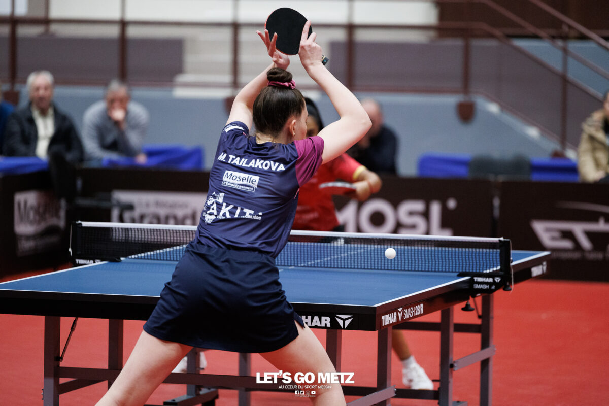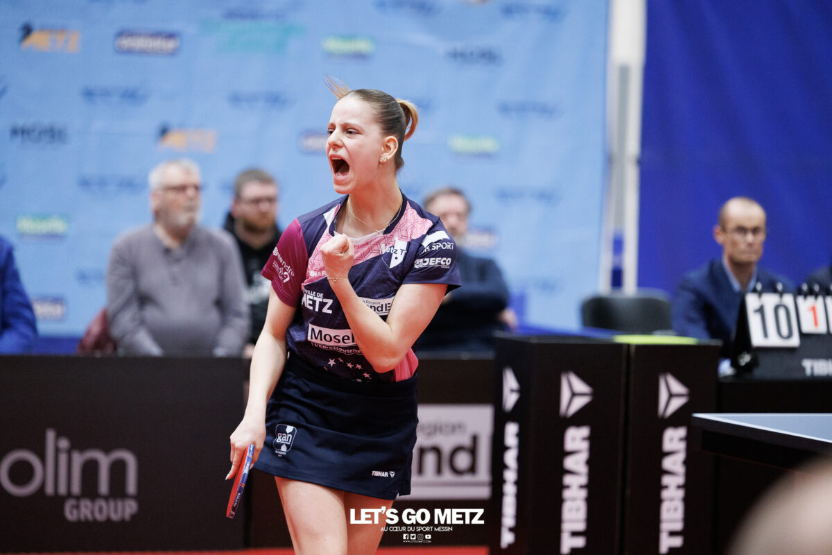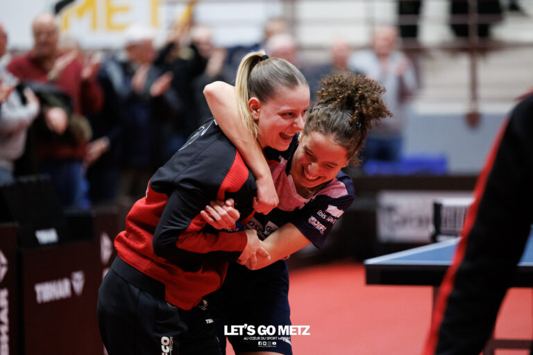 42 Metz TT s’impose 3-1 face à Saint-Denis 93 en quart de finale aller de Ligue des Champions et prend une option sur le carré final. Deuxième succès en huit jours pour Metz TT face à Saint-Denis TT 93. Les filles de Loïc Belguise ont en effet confirmé ce jeudi leur victoire en championnat face à cette même formation. Mais, si ce sont bien les mêmes clubs qui se sont affrontés à quelques jours d’intervalle, leurs compositions d’équipe différaient sensiblement. Et cette fois, les Dionysiennes se présentaient au complet quand Metz TT devait composer avec les absences de deux joueuses retenues par le circuit international, Adina Diaconu et Sarah De Nutte. Heureusement, le coach messin pouvait à nouveau compter sur son fer de lance, Hana Goda, tout juste auréolé d’un quatrième titre de championne d’Afrique, sur Charlotte Lutz et sur une Mariia Tailakova en pleine confiance. Un scénario totalement différent de la dernière opposition Lors de la rencontre de Pro A en début de mois, Sarah De Nutte était propulsée numéro 1 et lançait idéalement ses partenaires. Cette fois, la Luxembourgeoise disputant un tournoi WTT en Inde, tout comme Adina Diaconu, ce sont donc Hana Goda et Charlotte Lutz qui accompagnaient Mariia Tailakova. Du côté de Saint-Denis, Hana Arapovic, qui avait rapporté les deux points à son équipe, ne connut pas la même réussite. Face à une Charlotte Lutz transcendée par son dernier tournoi européen en Suisse, la Croate a dû se résoudre à céder malgré le fait d’avoir empoché la première manche. La nouvelle 51e joueuse mondiale remportait les trois sets suivants avec autorité au terme d’un match serré (8/11,11/6, 11/8, 11/7). La réaction d’orgueil d’Hana Goda et la solidité de Mariia Tailakova font triompher Metz TT Une victoire qui remettait Metz TT en selle après le revers concédé par Hana Goda en ouverture. Pourtant, la 27e joueuse mondiale débutait idéalement sa partie face à Jie Lie en gagnant la première manche sur le score de 11 à 4. La Néerlandaise de 41 ans renversait le cours du jeu, en remportant les trois manches suivantes. Piquée dans son orgueil et voulant bonifier la brillante victoire acquise par Mariia Tailakova aux dépens de Prithika Pavade à la belle au terme d’un match intense, l’Egyptienne augmentait son niveau de concentration. Elle ne laissait alors aucune chance à son adversaire et remportait le duel des Hana en trois manches (12/10, 11/7, 11/5). Metz TT l’emportait ainsi sur le score de 3-1 ce jeudi au Complexe Saint Symphorien et peut entrevoir une participation au premier Final Four de Ligue des champions en mai prochain. Pour cela, il faudra toutefois bien négocier le match retour qui se déroulera ce dimanche (15 h 30) en région parisienne. Metz TT 3-1 Saint-Denis TT 93 Goda (Metz TT) – Lie (St Denis TT 93) : 11/4, 9/11, 7/11, 7/11Ch. Lutz (Metz TT)– Arapovic (St Denis TT 93) : 8/11, 11/6, 11/8, 11/7Taïlakova (Metz TT) – Pavade (St Denis TT 93) : 11/6, 6/11, 8/11, 13/11, 6/3Goda (Metz TT) – Arapovic (St Denis TT 93) : 12/10, 11/7, 11/5 Crédit photos: Nicola Martino / Let’s Go Metz